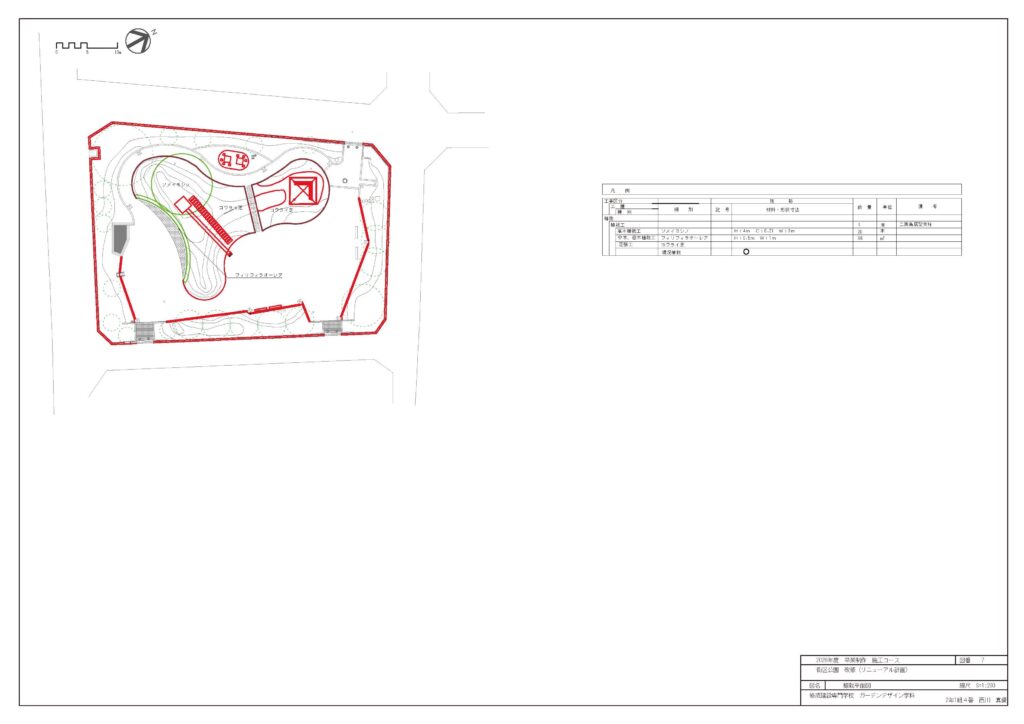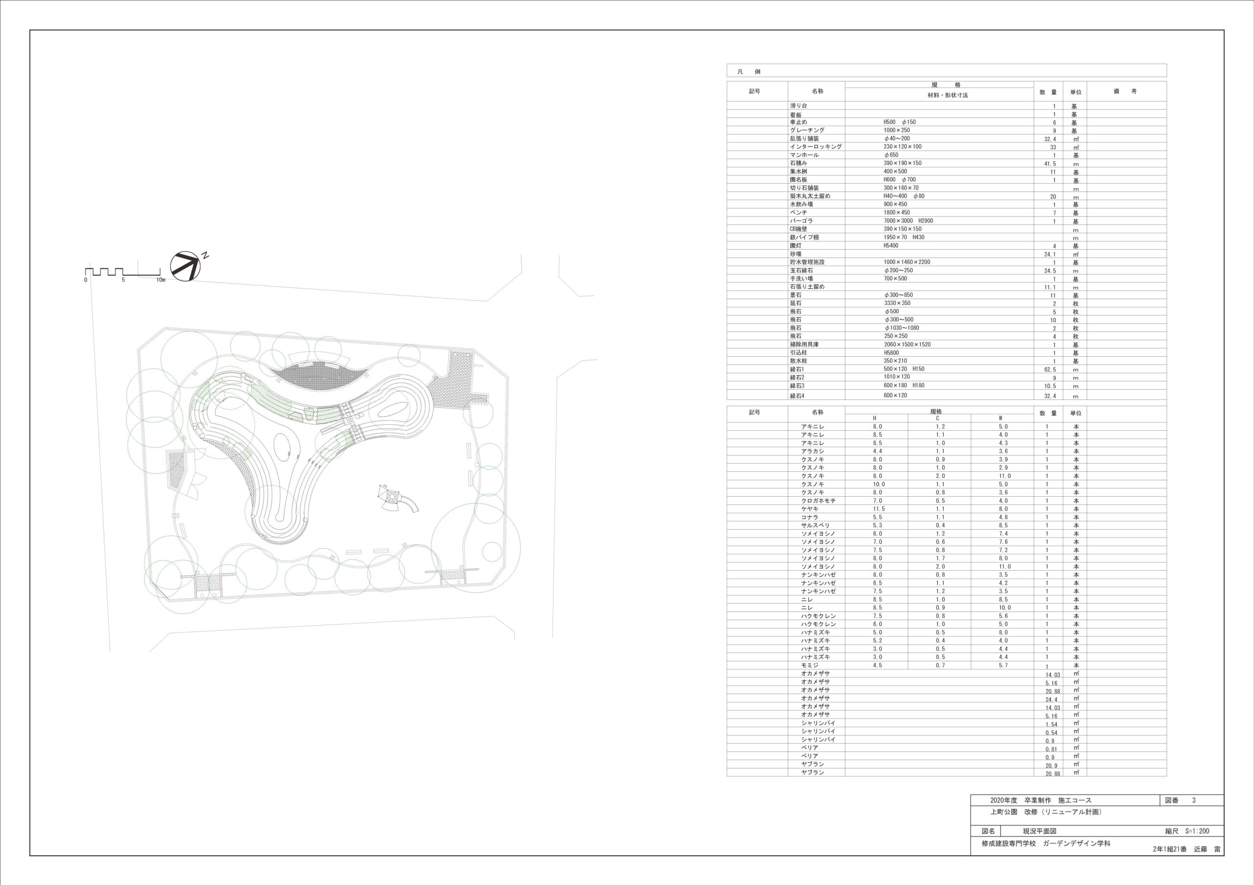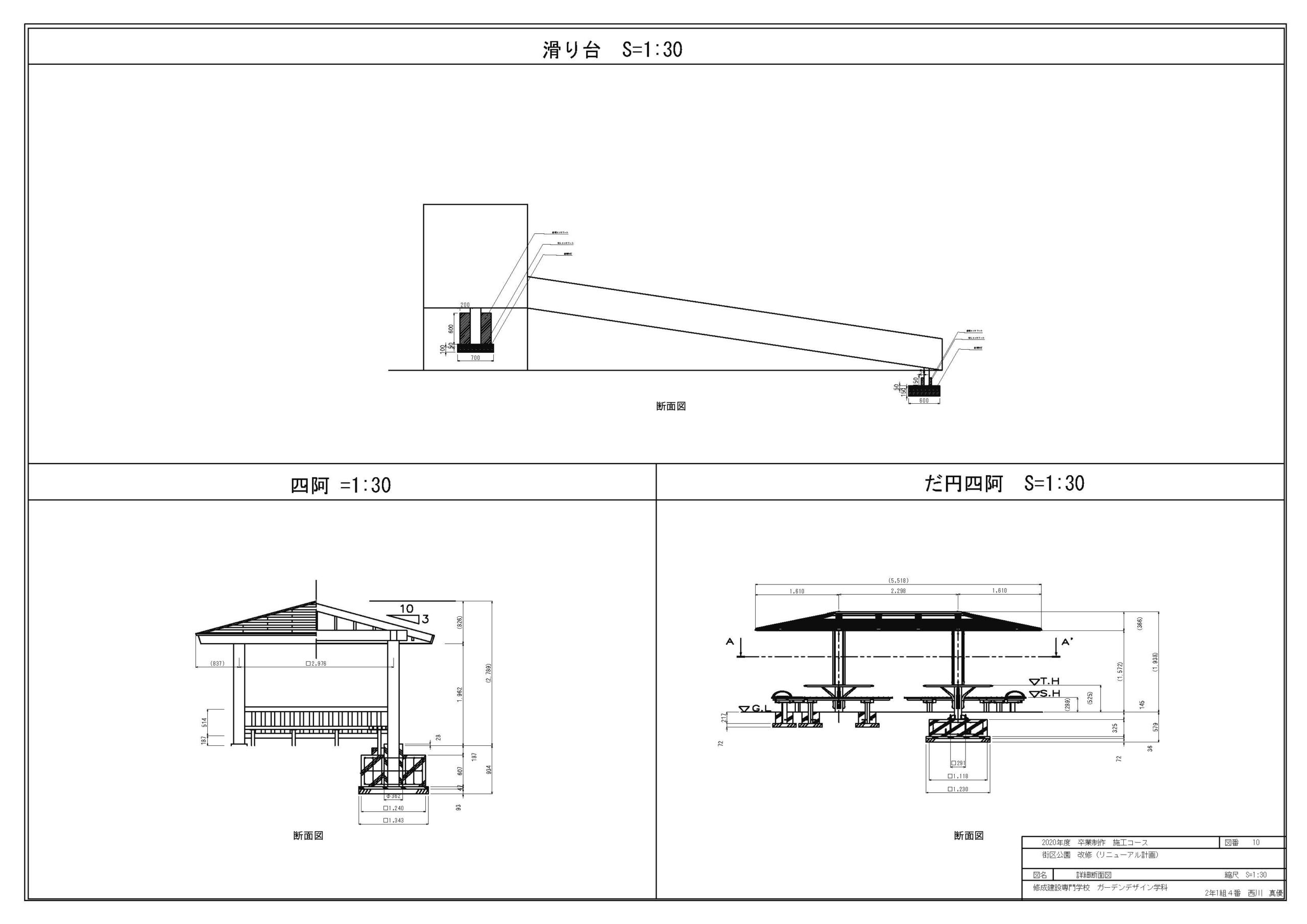今回の計画地は、西淀川区の公園であったため、頻繁に現地調査を行い、近隣住民の使用状況や要望を聞き込み反映させた、より現実的な改修計画であった。既存の築山を活かした遊戯施設の設置や、利用者の快適性を考慮した四阿や舗装、安全に配慮した柵等、細部に渡って検討したため、改修箇所も多くなったが、積算や人工数量、工程表、施工フローの確認など施工計画書を作成していく中で、安全管理や品質管理、使用重機計画なども含め、現場責任者として各工種の細部に渡って全体を把握していった。意欲的に取り組んだ過程から、施工管理者としての姿勢を学び、2年間の集大成が作品に表現されている。<坂 一朗・中安 哲男>