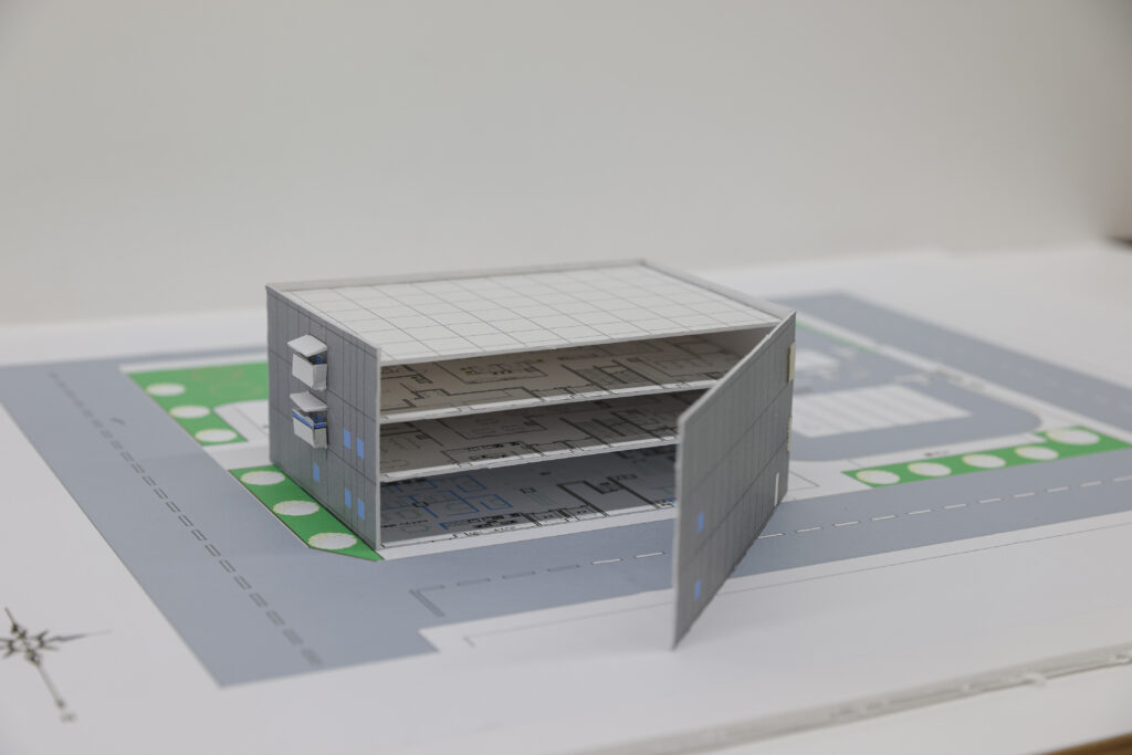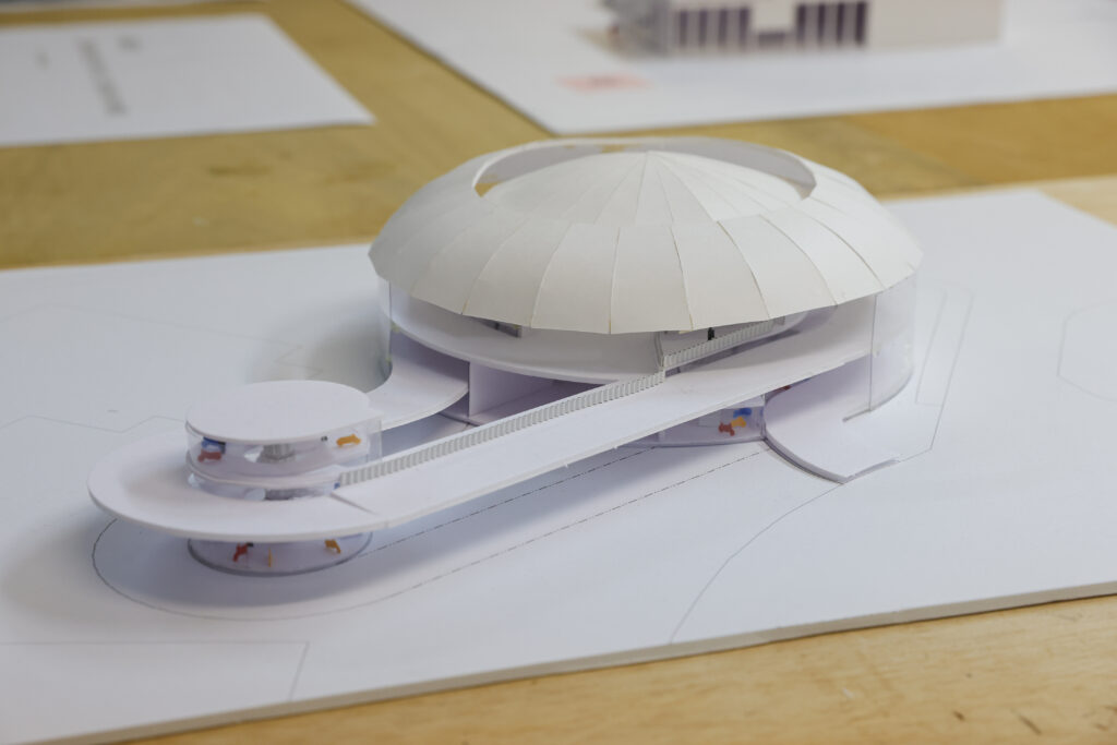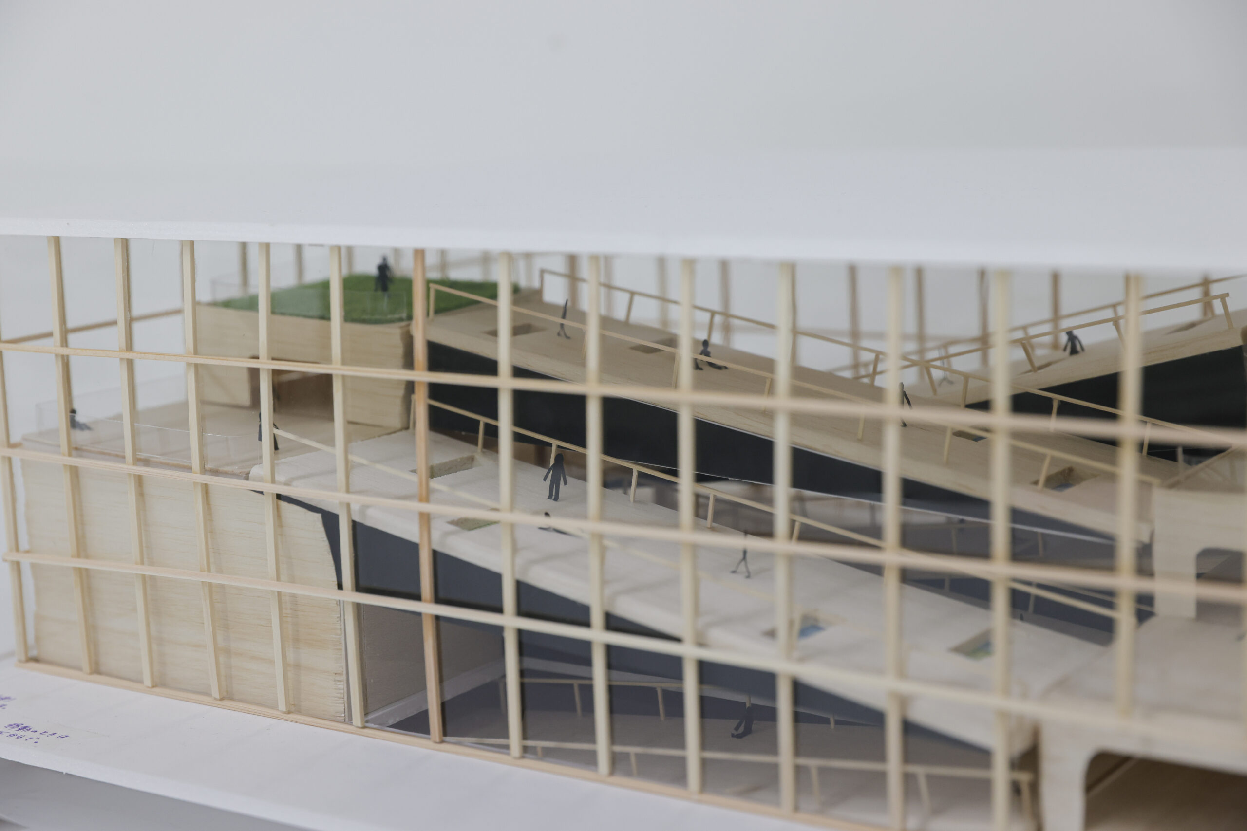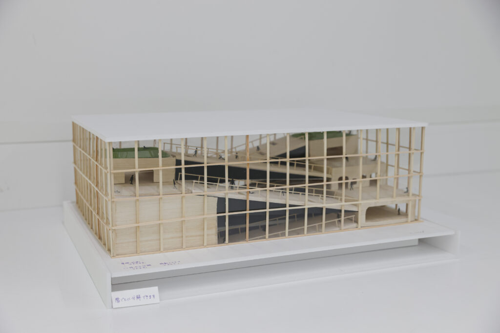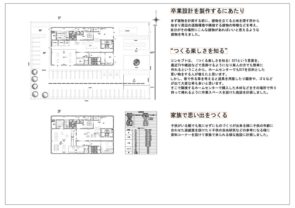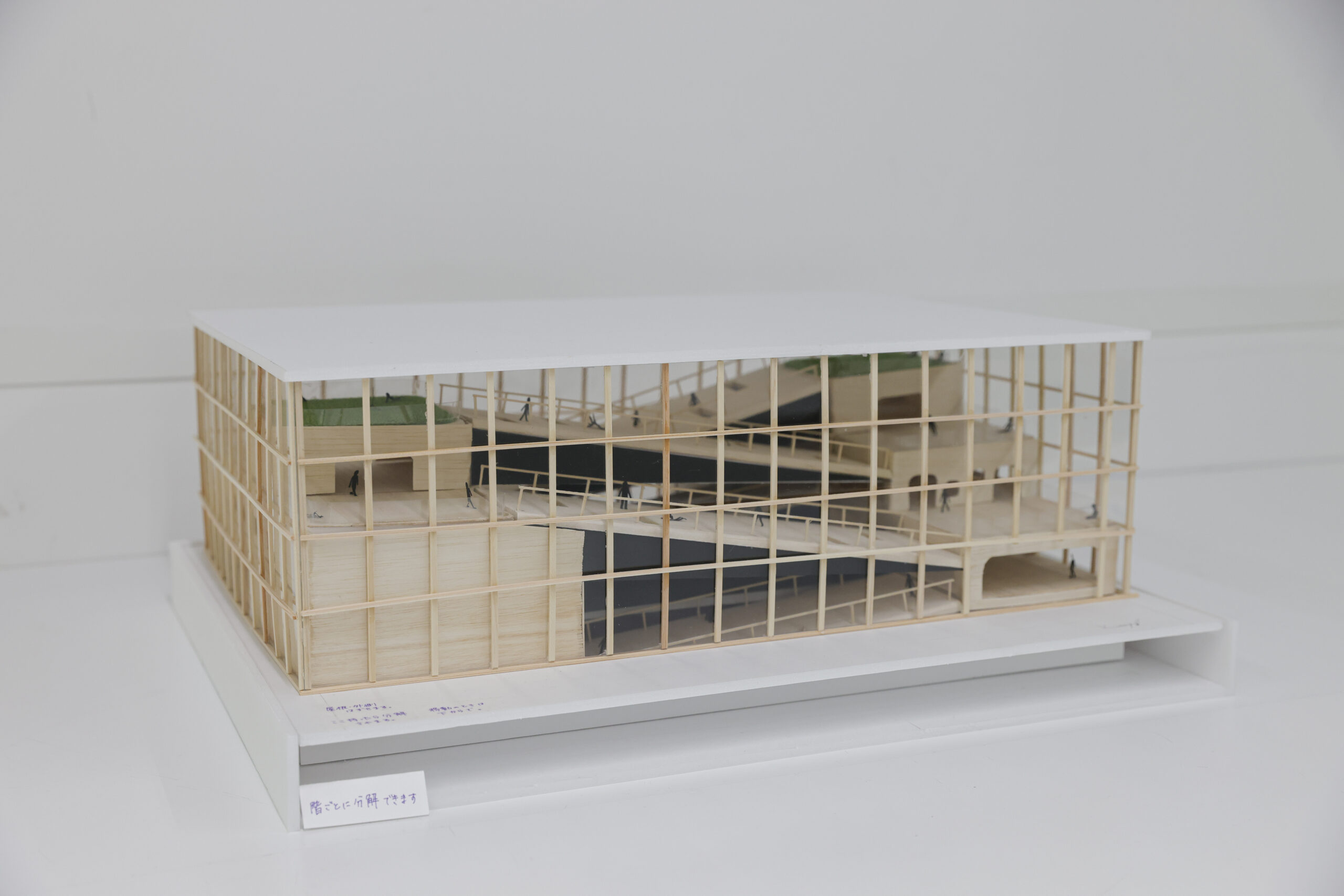彼のアルバイト先からイメージを受け、人々にものづくりの楽しさを知ってもらいたいという話から計画がスタートした。彼の計画は奇抜な物ではなく、実用性を重視した設計となっている。意匠の追求ではなく、「実在する建物の構造にどれぐらい近づけられるのか」という事に焦点を置き指導を実施。機械室や塔屋も細かく計画し、実際の建物ならばどういう納まりになるのかを考えた作品である。<佐本 亜希子>