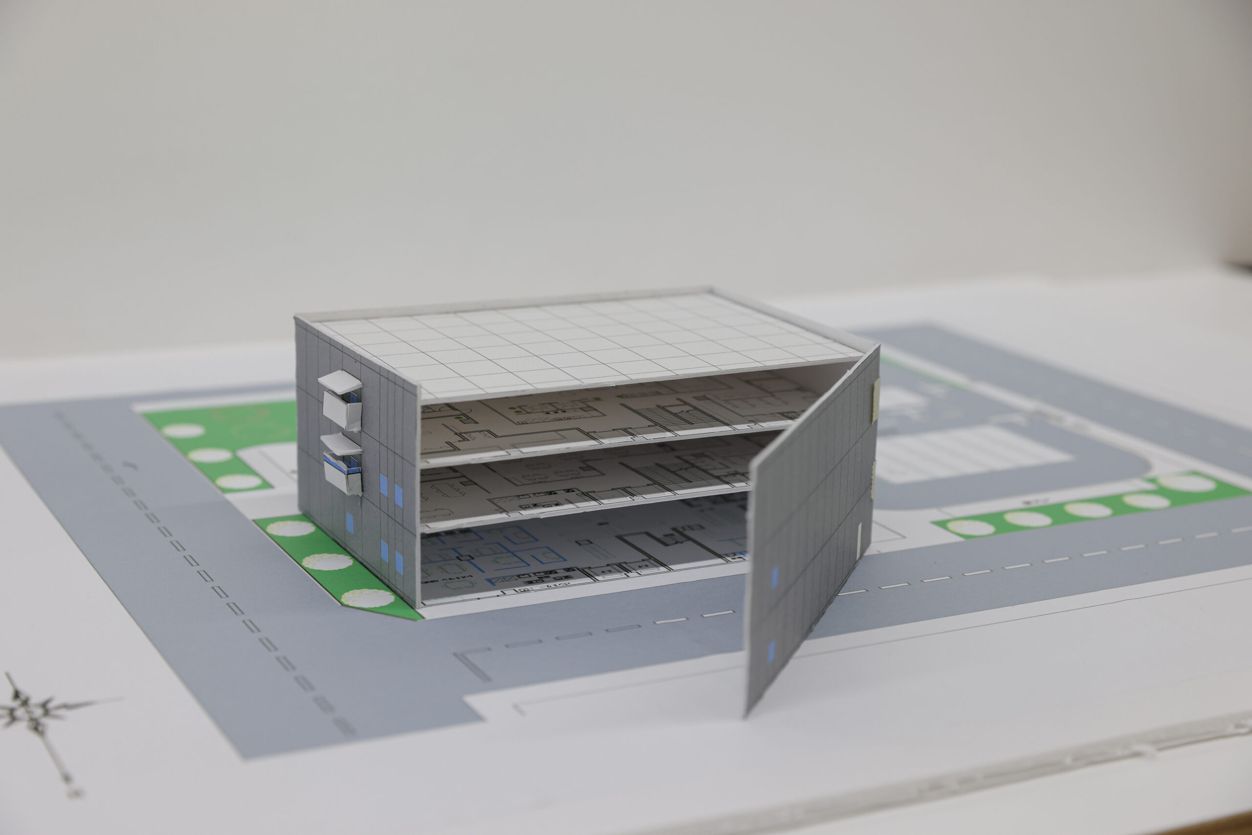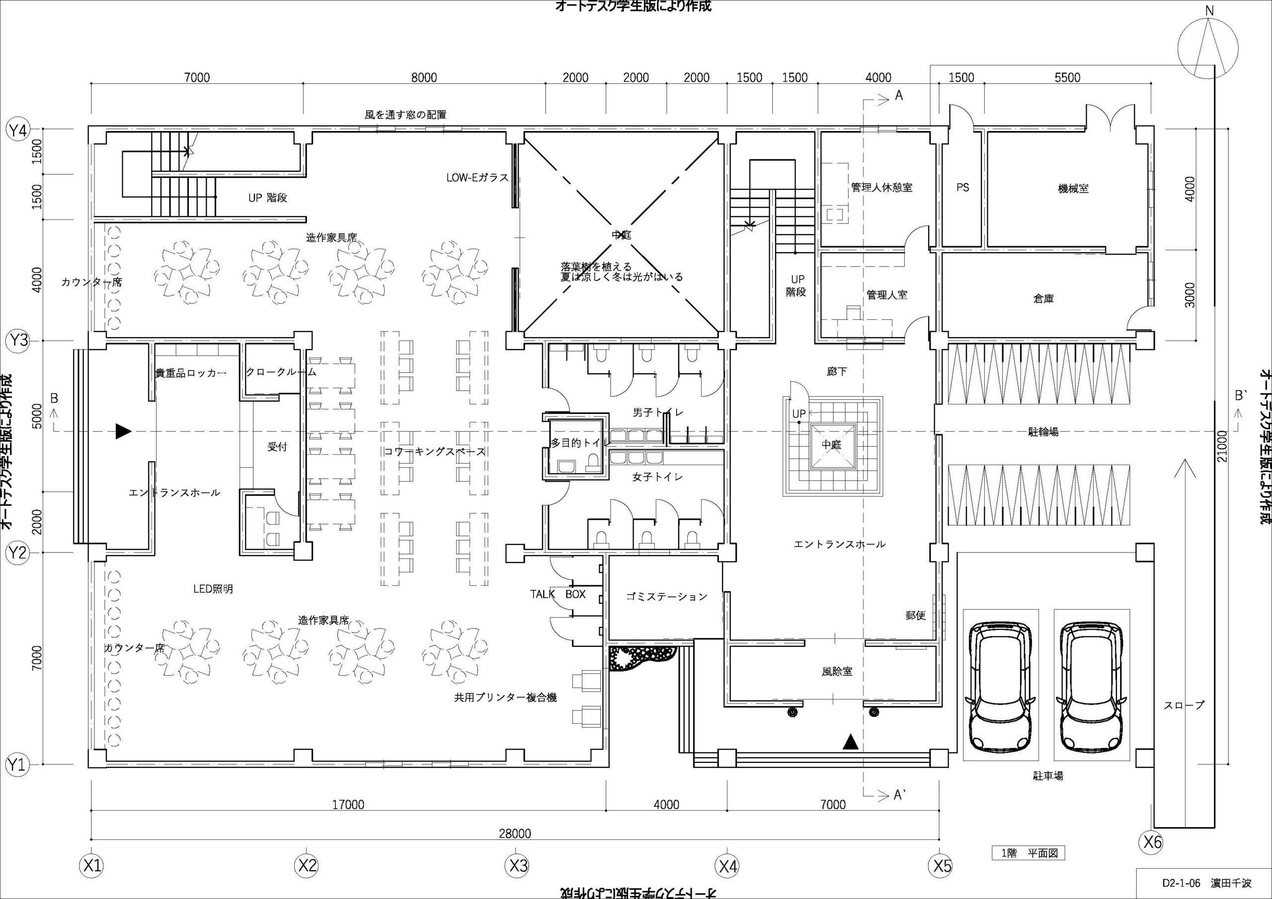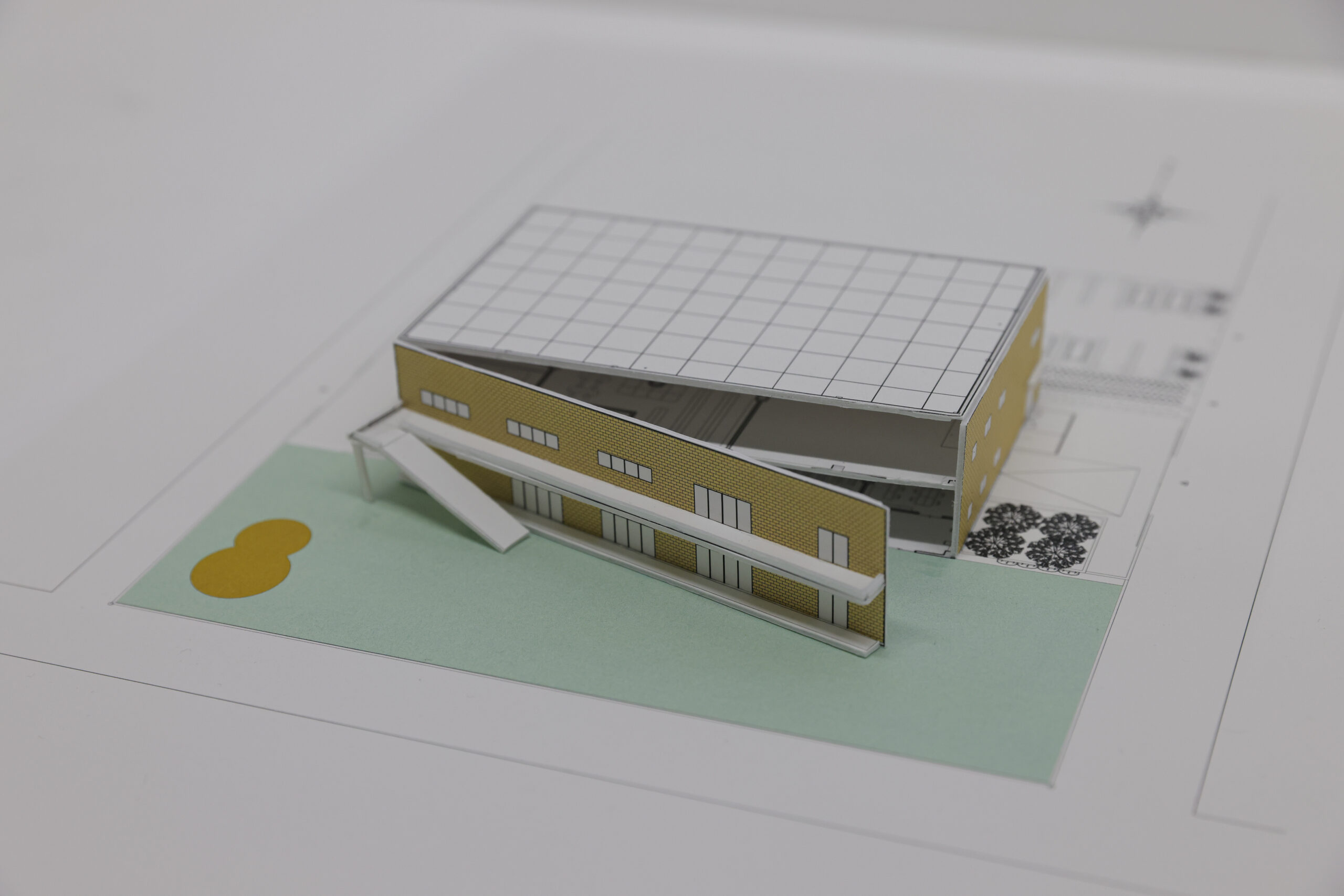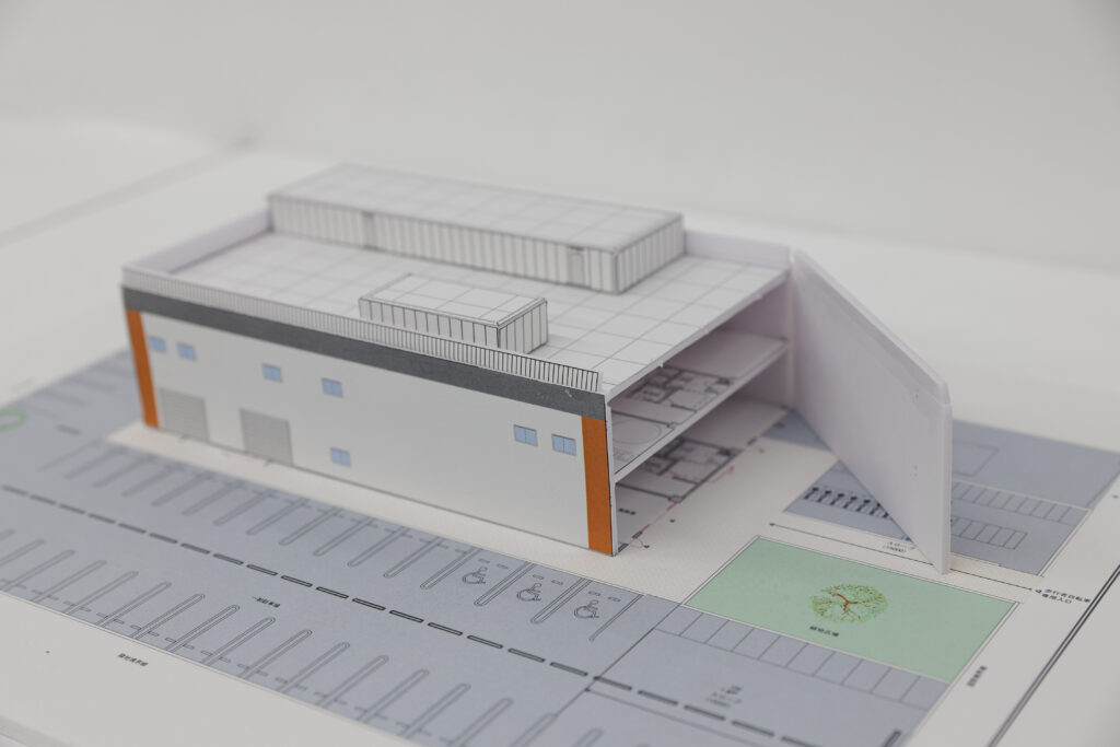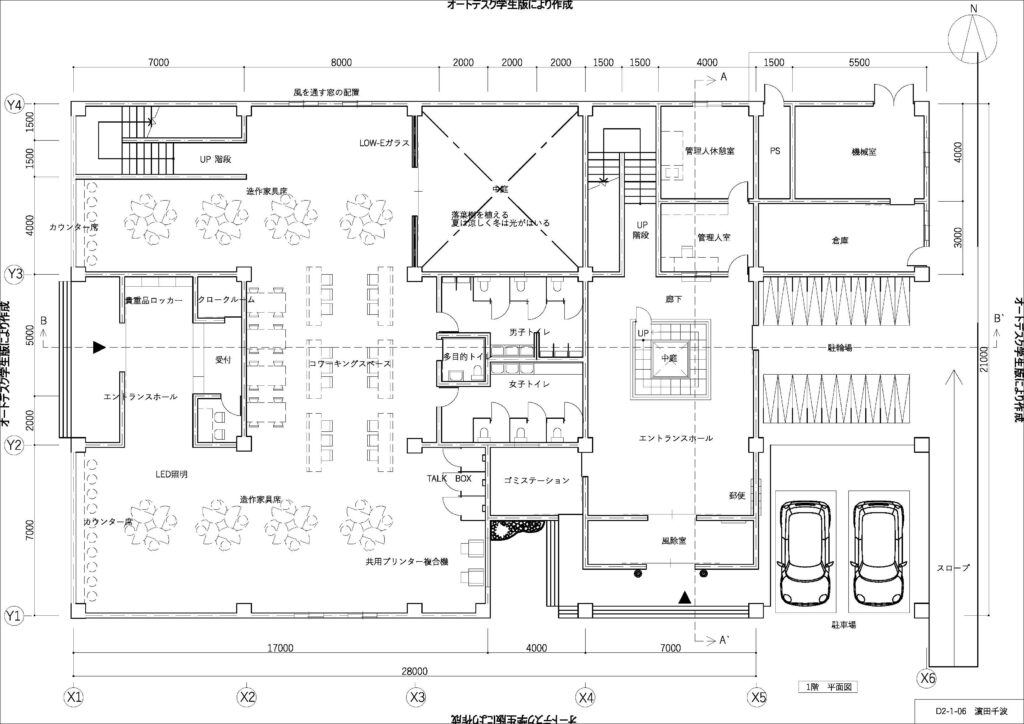 彼のアルバイト先からイメージを受け、人々にものづくりの楽しさを知ってもらいたいという話から計画がスタートした。彼の計画は奇抜な物ではなく、実用性を重視した設計となっている。意匠の追求ではなく、「実在する建物の構造にどれぐらい近づけられるのか」という事に焦点を置き指導を実施。機械室や塔屋も細かく計画し、実際の建物ならばどういう納まりになるのかを考えた作品である。<佐本 亜希子>