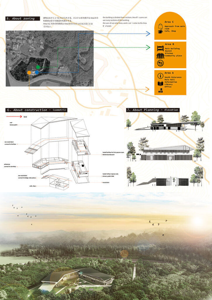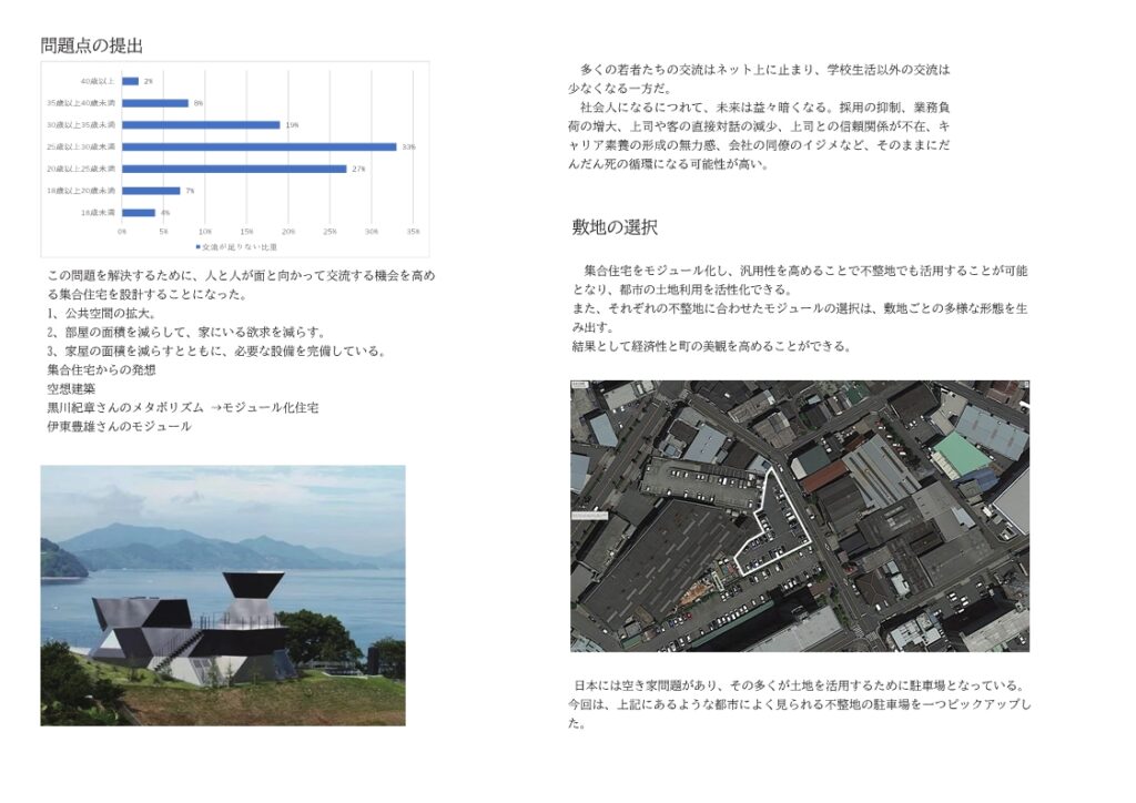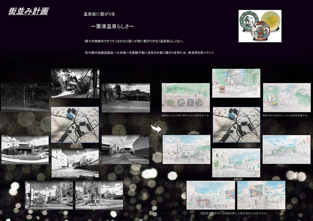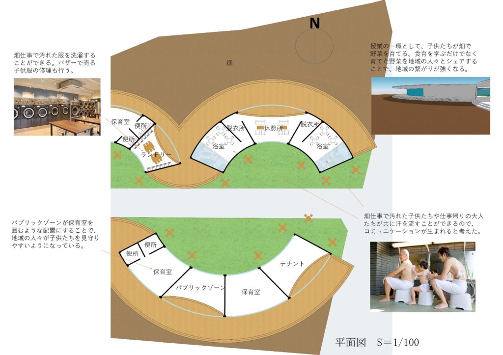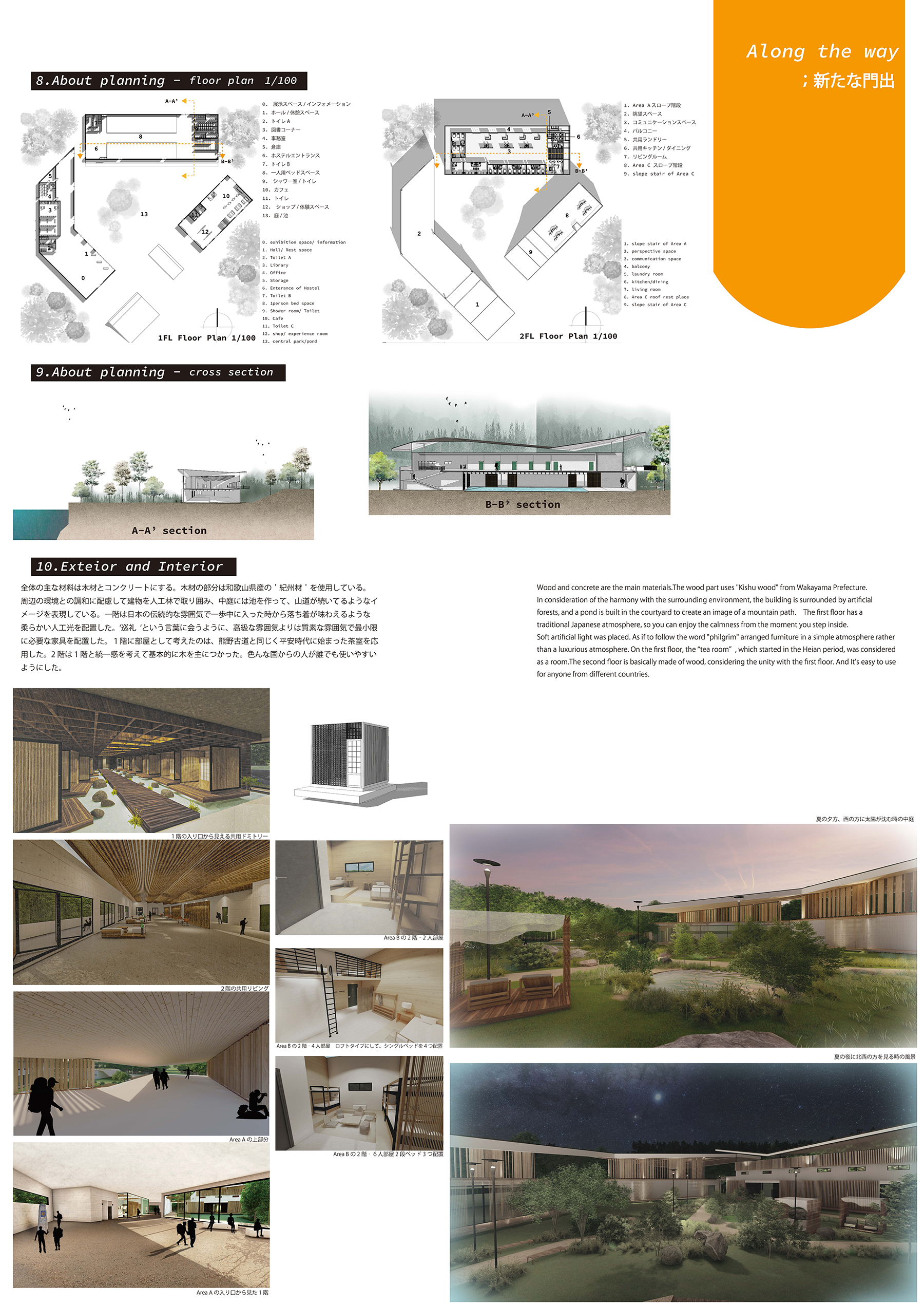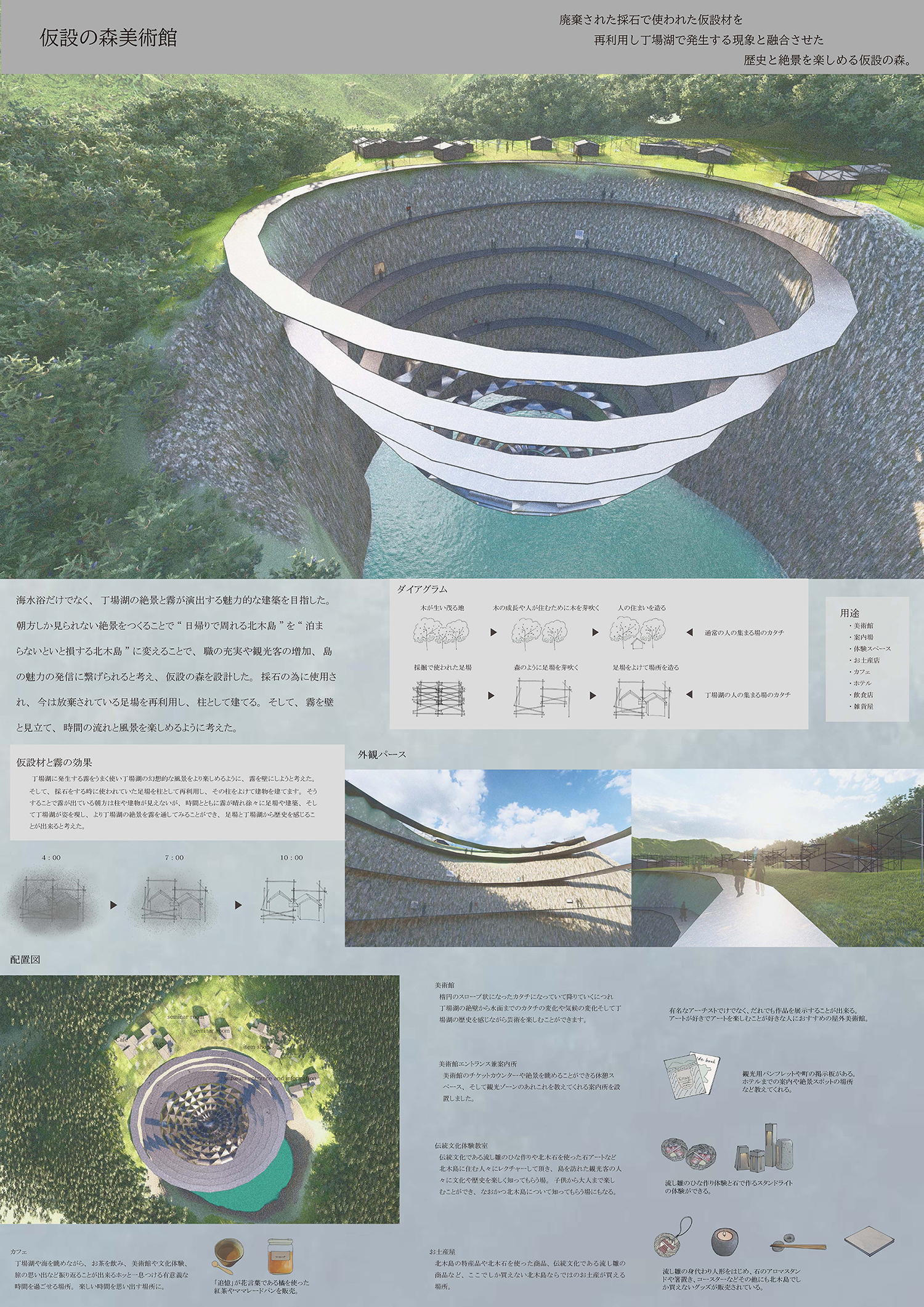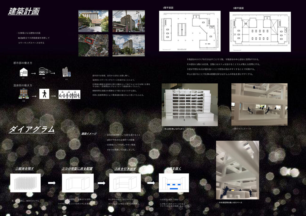 粟津温泉街の現状を社会的問題提起しており、現地にも出掛けて視察する等、熱意を感じ作品である。又コロナ禍のご時世で、益々必要性をおびて来た「テレワーク」を、現代の「湯治場」として見直す提案は秀逸と言える。廃業して残された旅館のリノベーションを軸として、現存する旅館に地域特産品を共通の「付けたし」としながら結び付ける手案の、手書きパースが印象的だ。<青砥 聖逸>