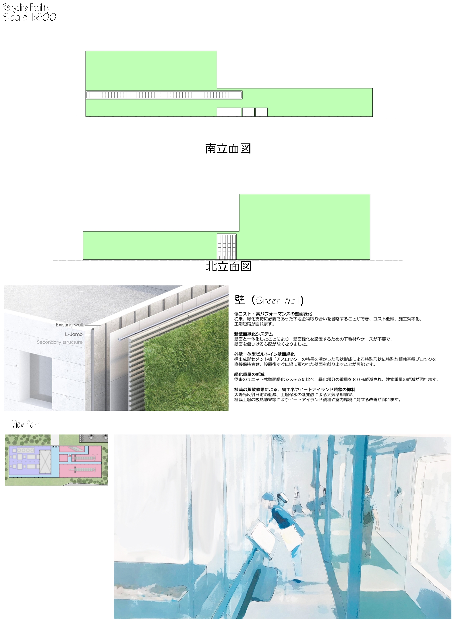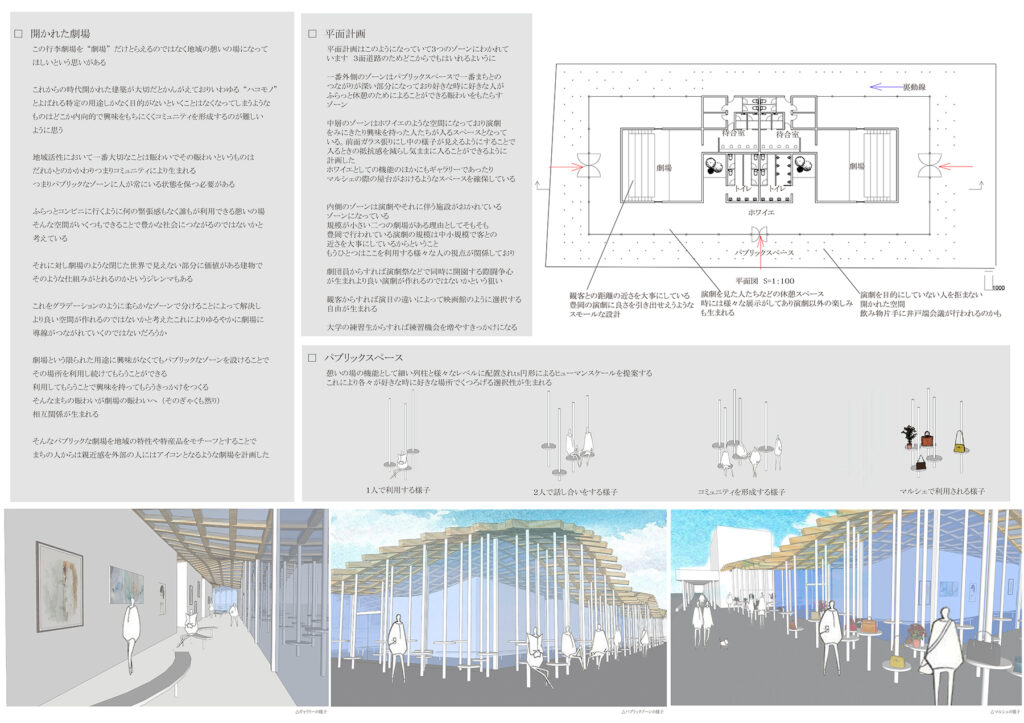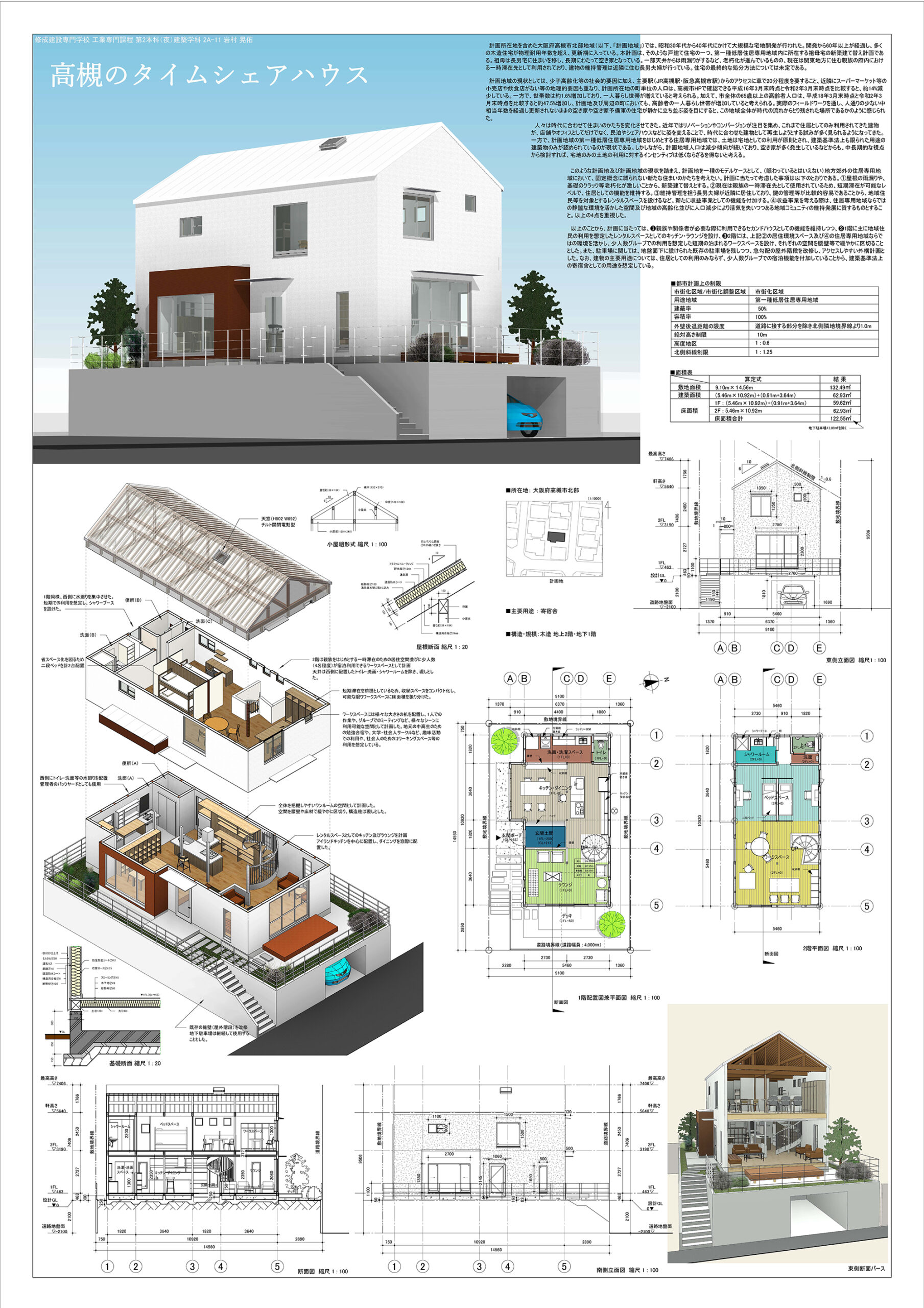 審査会でプロジェクトの成果物が既出であるとの指摘を受けたが、その趣旨には現代の問題点が織り込まれているのでそのまま進んでもらった。敷地や時代背景からくる要請が建物にどういった影響を与えるのかを見守ったが、結果としては汎用性ばかりが目立つ設計となっている。CGなどのテクニックは十分にあるので、次のステップ(大学編入)では指導者とコミュニケーションをより密に取り、場所を読み解く技術を磨いて欲しい。<田中 おと吉>