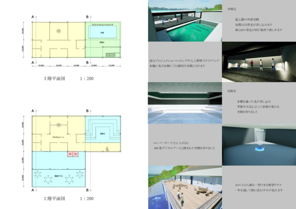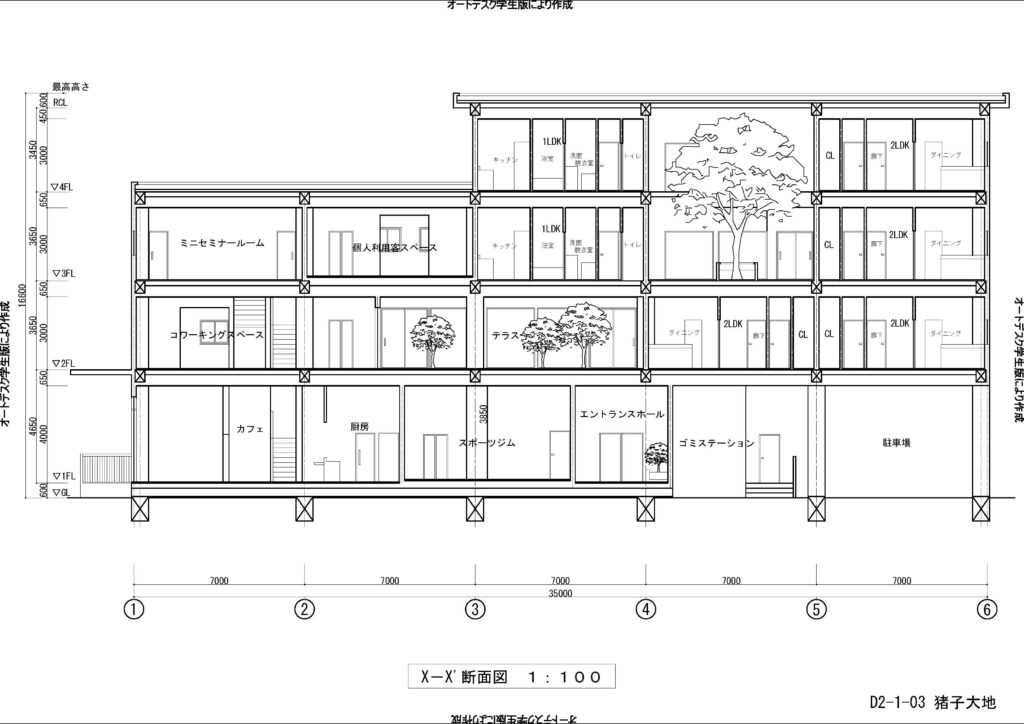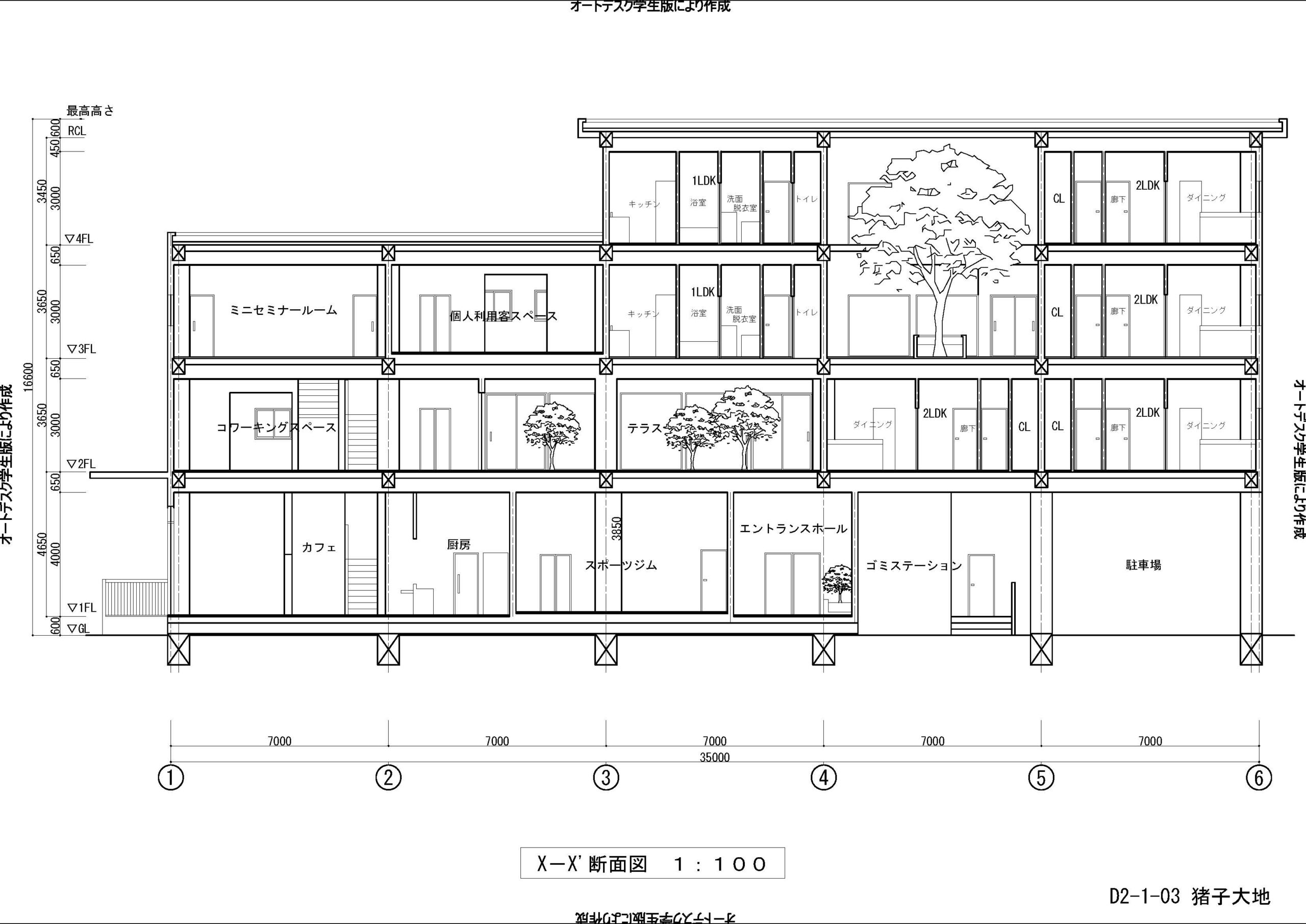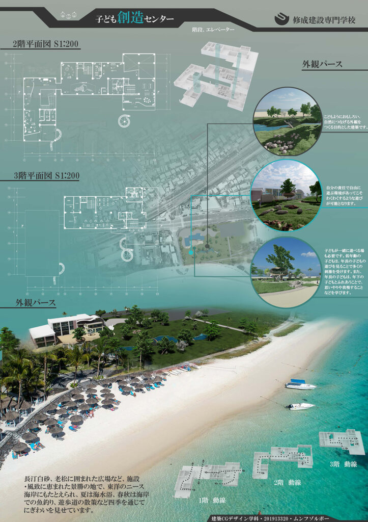審査会でプロジェクトの成果物が既出であるとの指摘を受けたが、その趣旨には現代の問題点が織り込まれているのでそのまま進んでもらった。敷地や時代背景からくる要請が建物にどういった影響を与えるのかを見守ったが、結果としては汎用性ばかりが目立つ設計となっている。CGなどのテクニックは十分にあるので、次のステップ(大学編入)では指導者とコミュニケーションをより密に取り、場所を読み解く技術を磨いて欲しい。<田中 おと吉>
