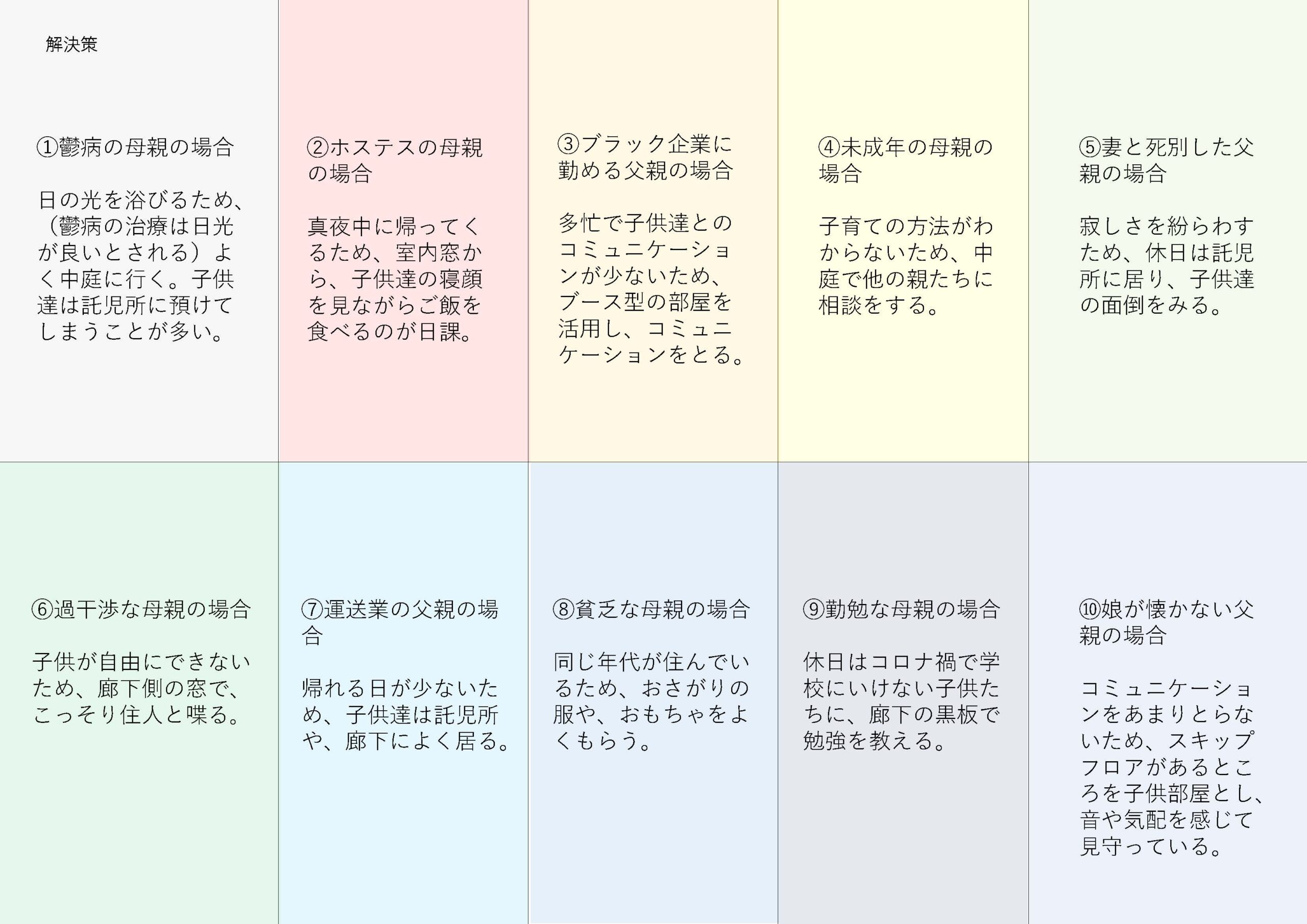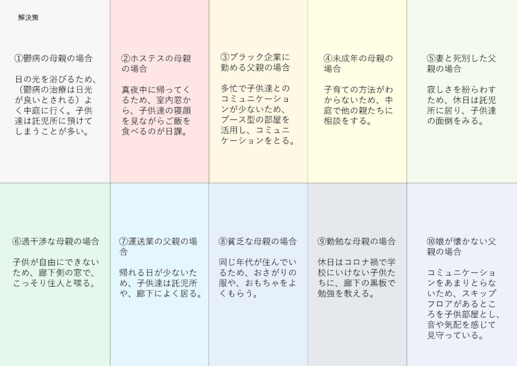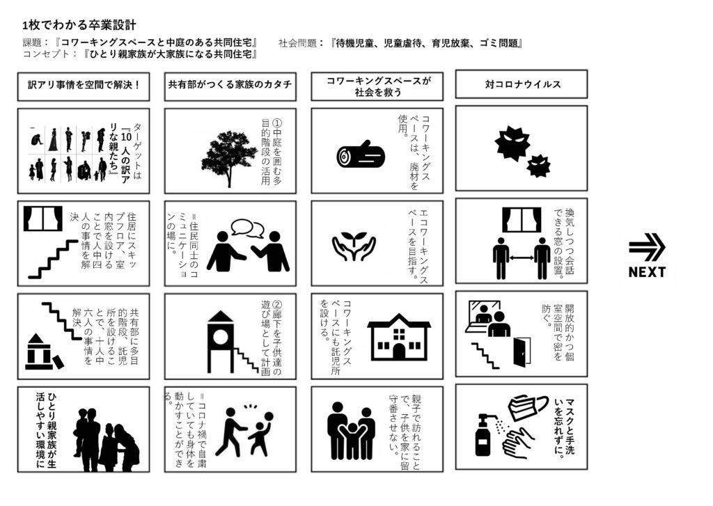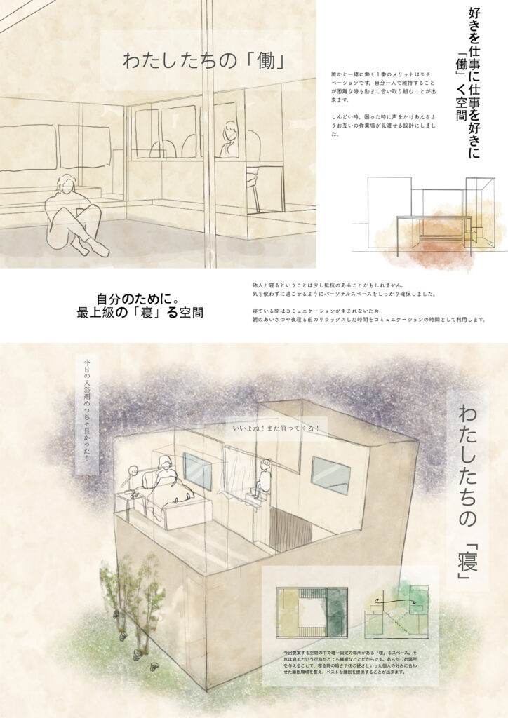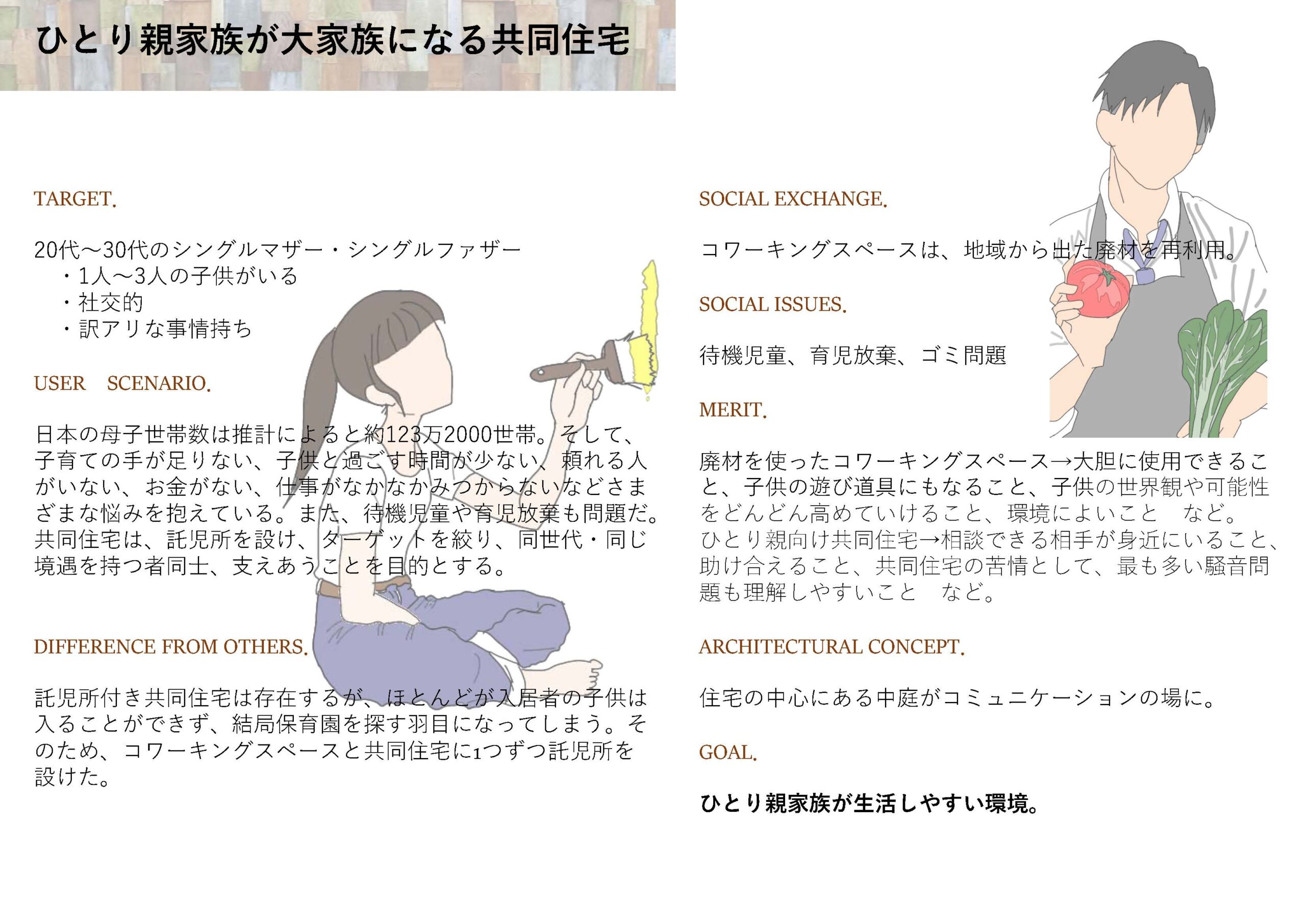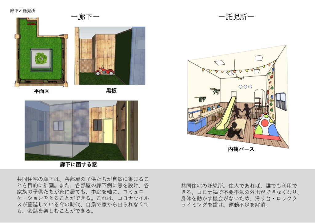 きっかけは、自粛期間です。友達にも会うことができない日々が本当に辛く、1人でいるのも苦痛でした。この状況が一人親家族の子供達と似ているのではないかと考え、少しでも安らぐような計画をしました。特徴としては中庭を軸とした繋がりのある集合住宅部分です。中庭を余白ではなく集いの場として活用しました。今、人と人との関わりに慎重になっていますが、将来この住宅で、自然な関わりができる生活を楽しみにしています。