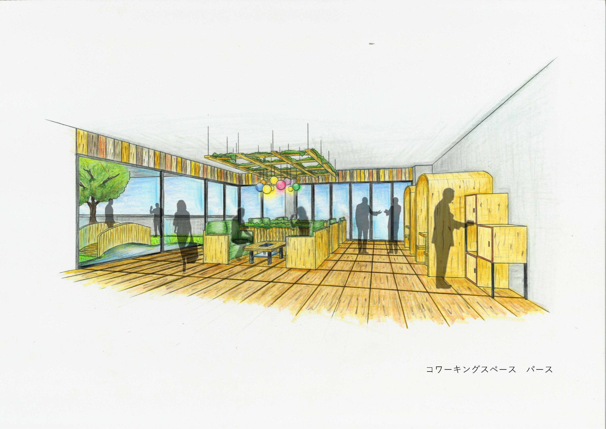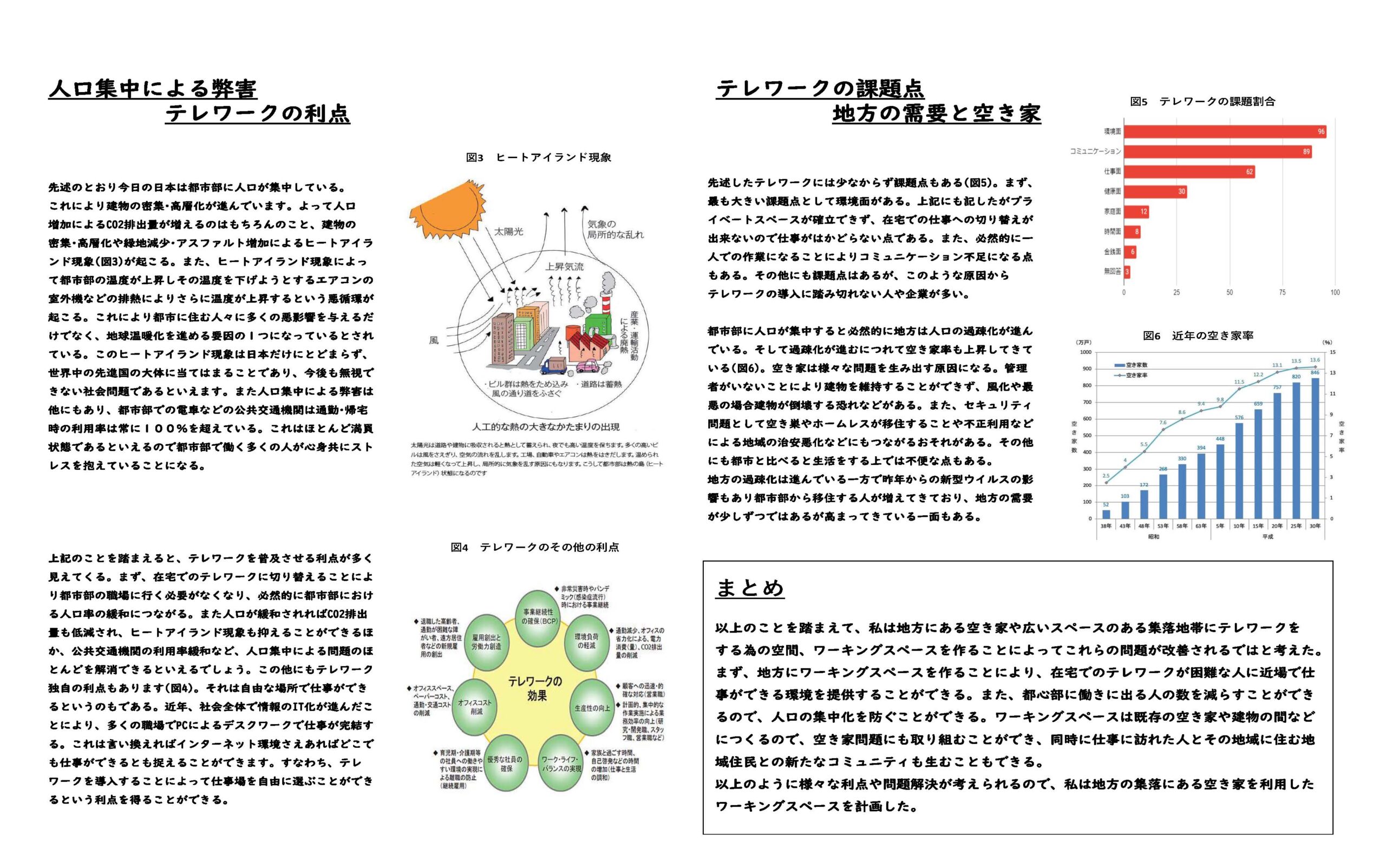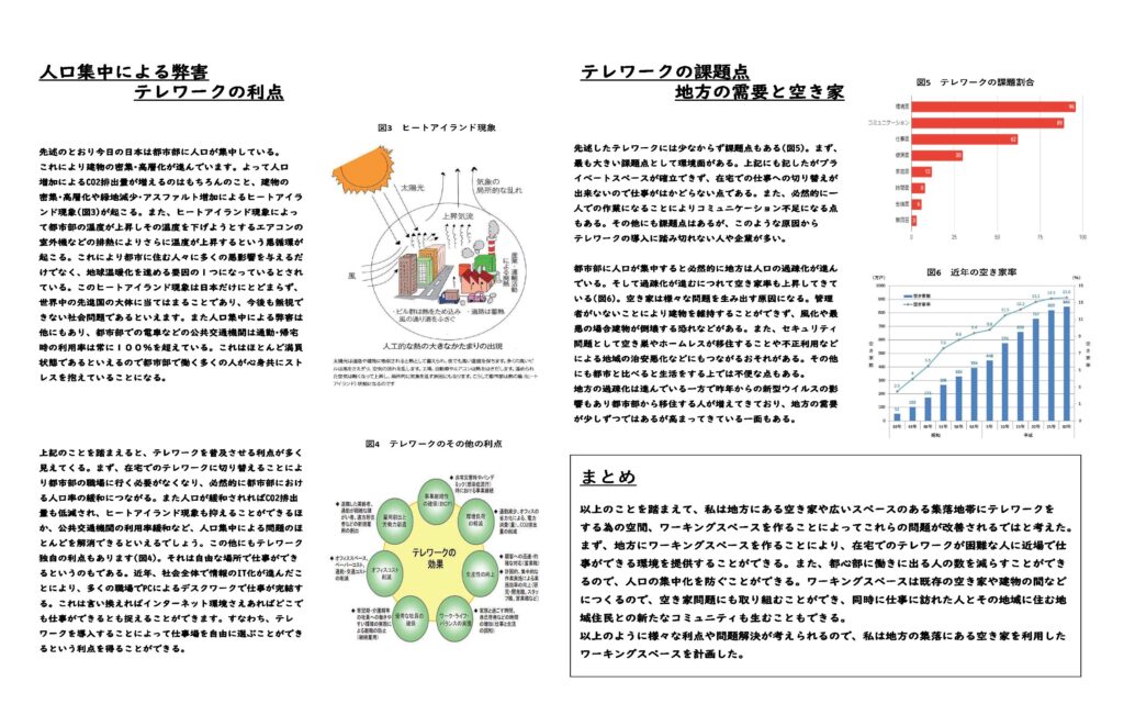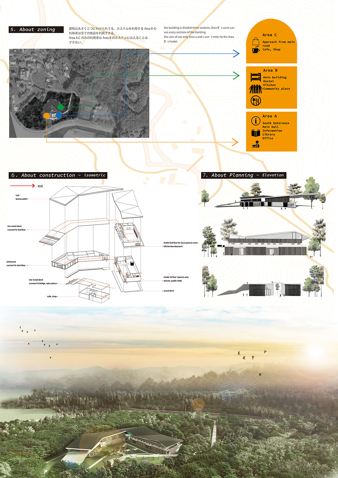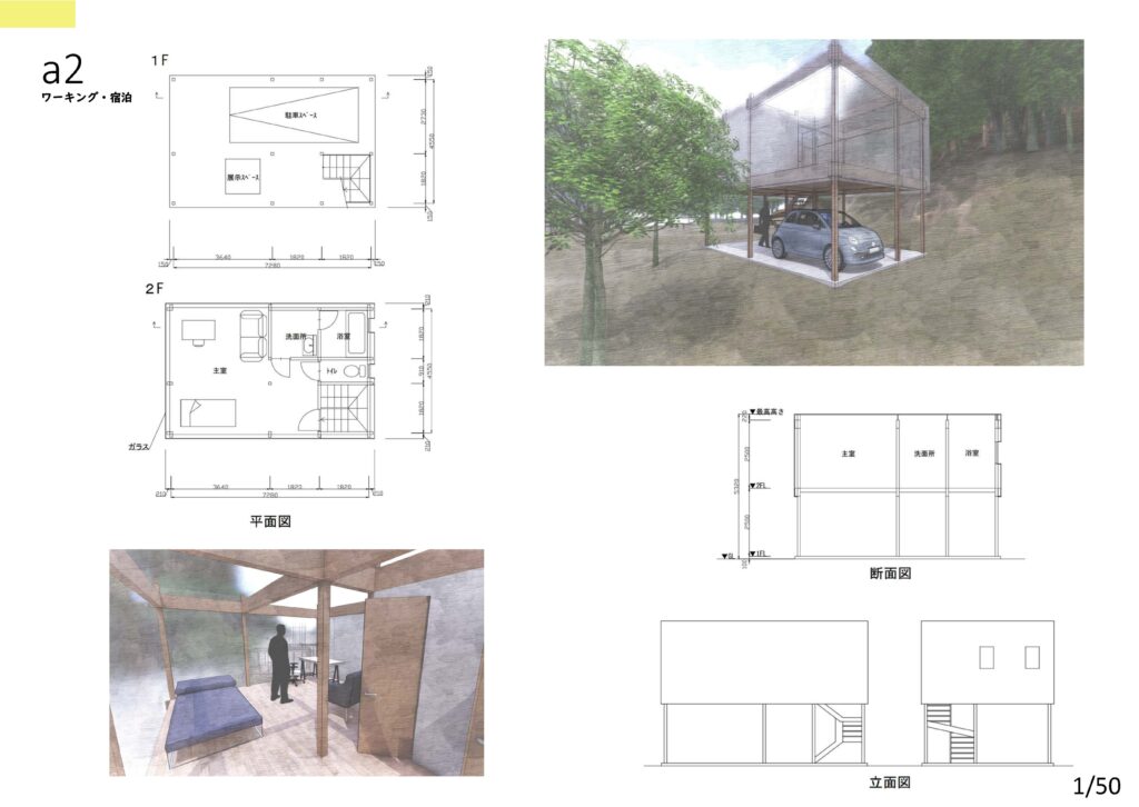 この作品を考えたきっかけは、元々自分が自然が好きなところにあります。近年は都市計画が進み都市部での生活がとても便利になりました。結果として都市の人口が増え地方の需要が下がってきています。つまり現代の人々は天然自然と触れ合う機会が減ってきているとも言えます。なので私は、近頃需要が高まってきているテレワークを地方で行える形態を考えました。