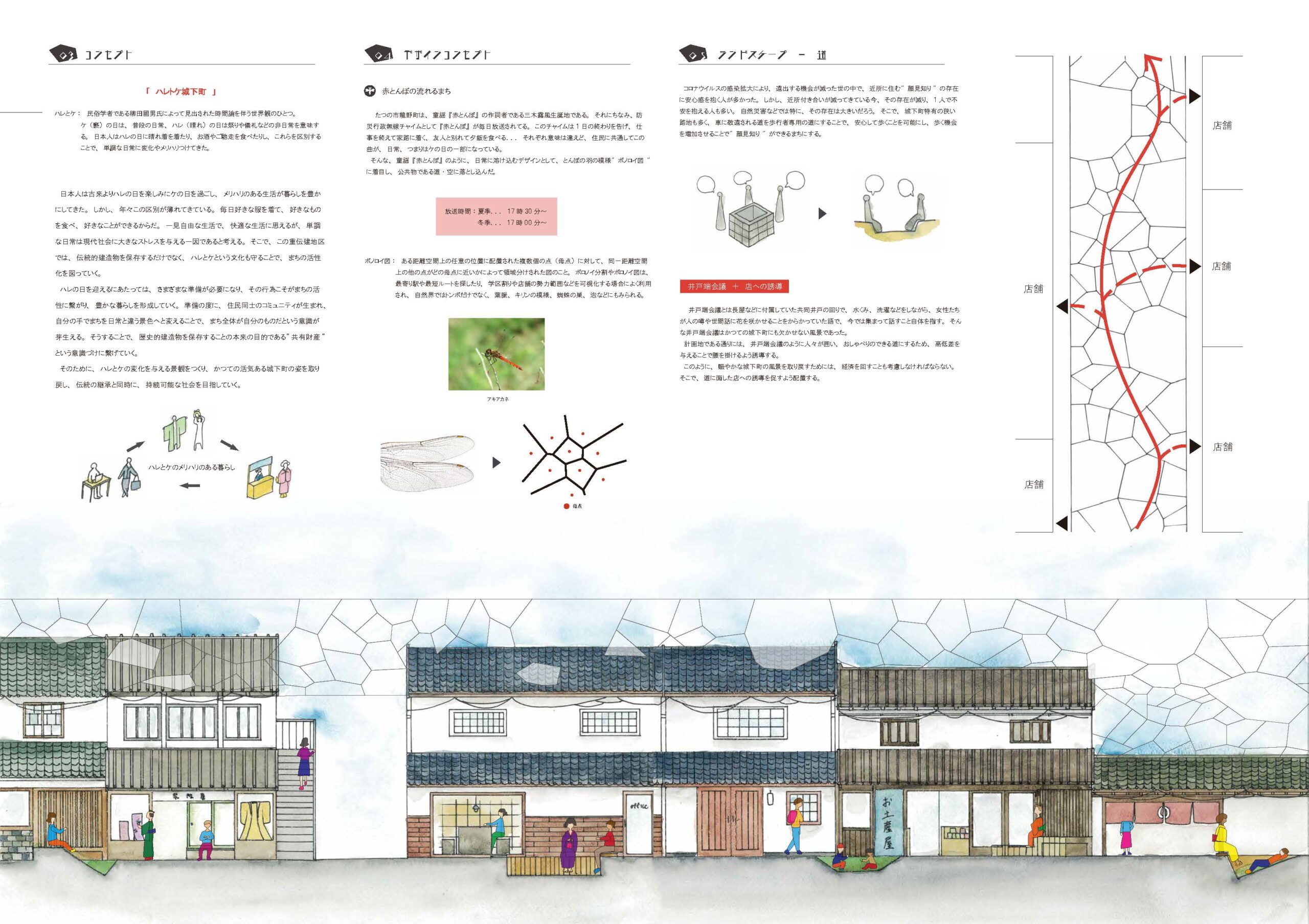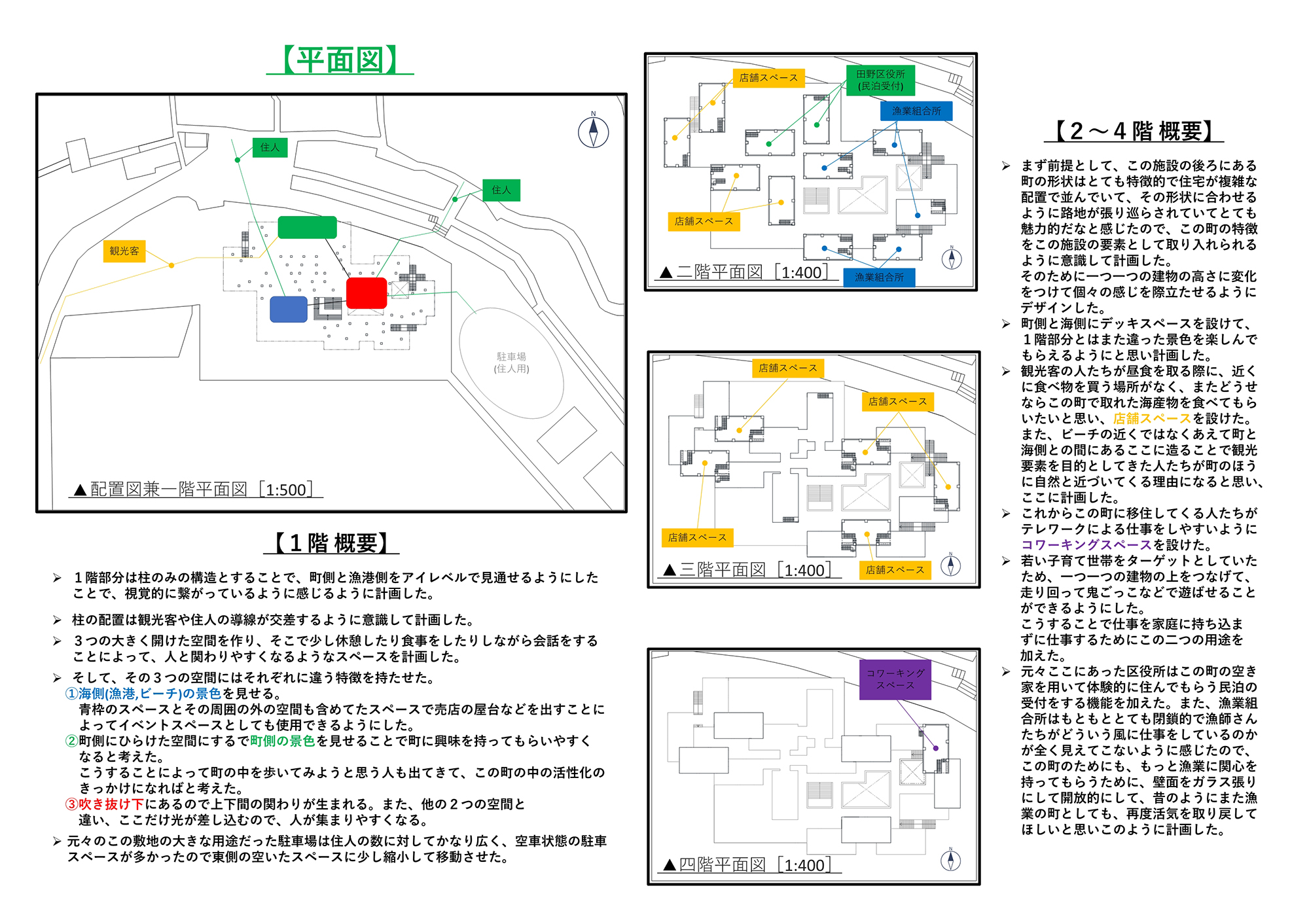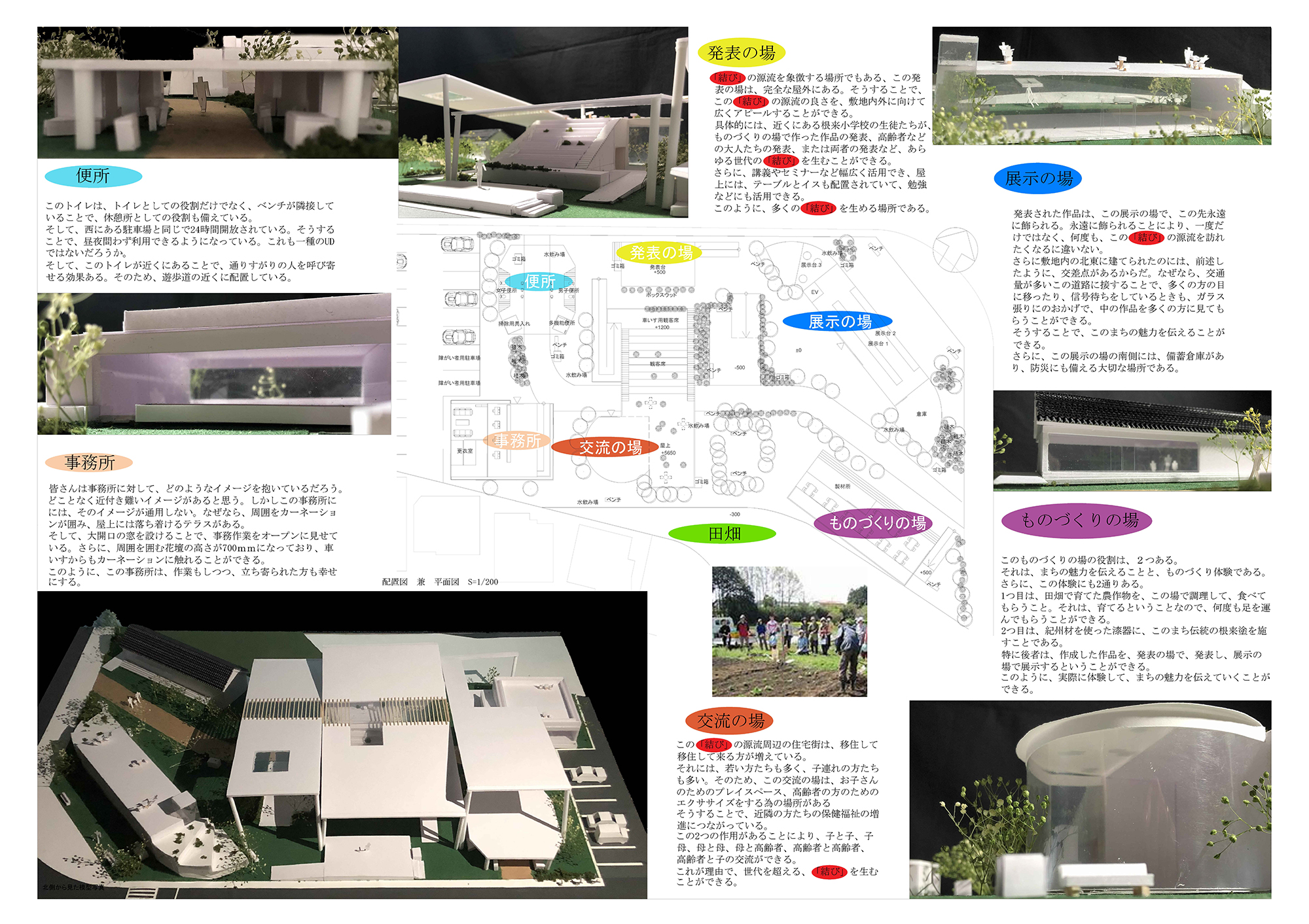 諸事情から具体化には時間が掛かった。ただし成果物を見ると、実現した際の地域の活動と観光が相乗効果を生む社会的な効果が十分に望める内容になっている。大きな公共空間のプロジェクトを最後までやりきった経験を、彼の今後のキャリアで活かして欲しい。<田中 おと吉>