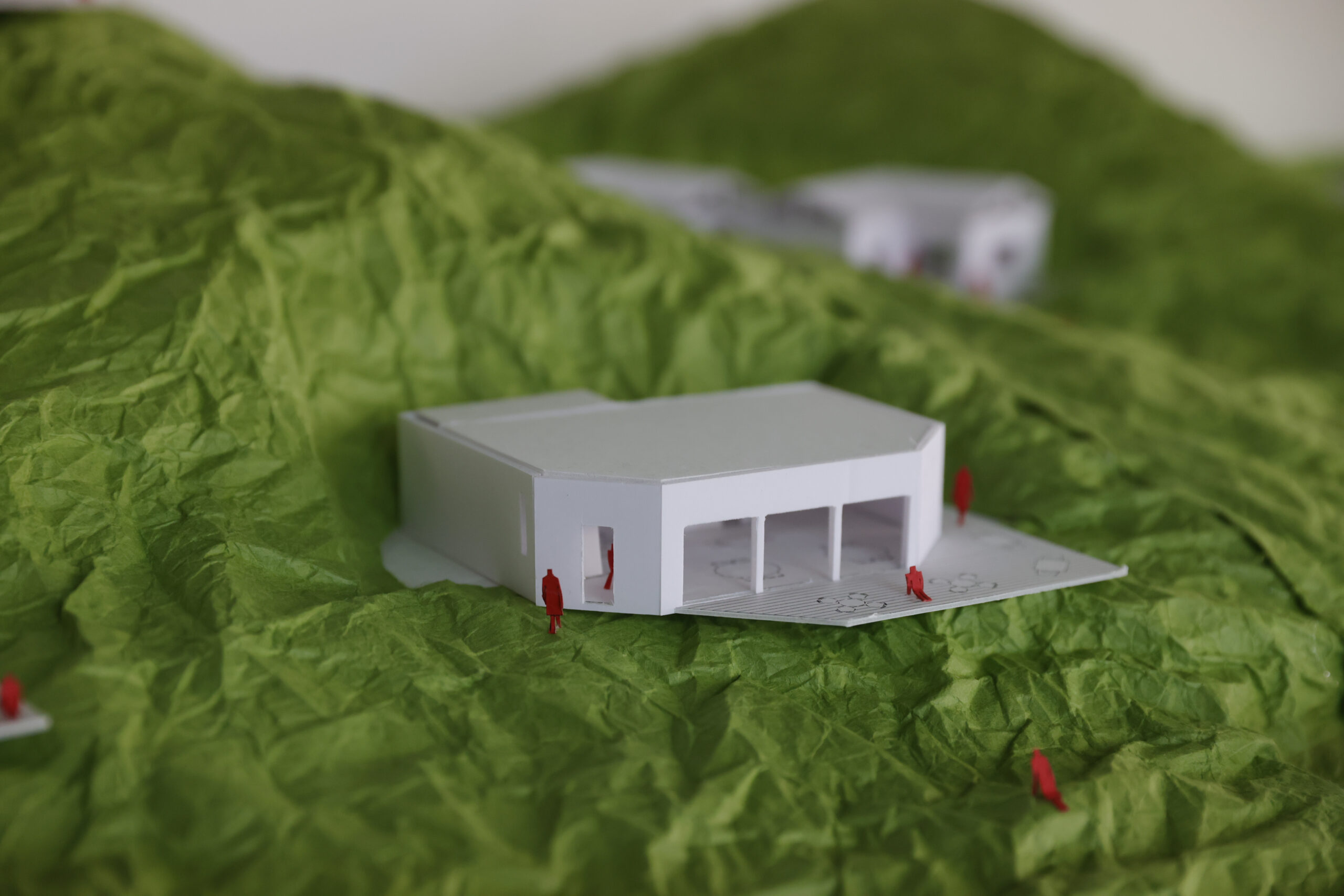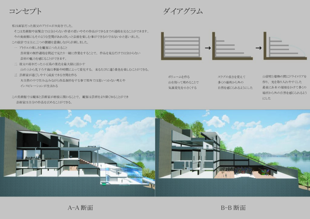 この作品は亡くなった祖父のために作りました。小豆島にあるお墓が無くなることが決まった時に自分が小豆島に作品を残したいと思い計画しました。アトリエがある美術館を計画したは画家だった祖父のアトリエが大好きだったのでアトリエの楽しさを色んな人に伝えたかったからです。山の上に建てたのも祖父の好きな景色を再現するためです。