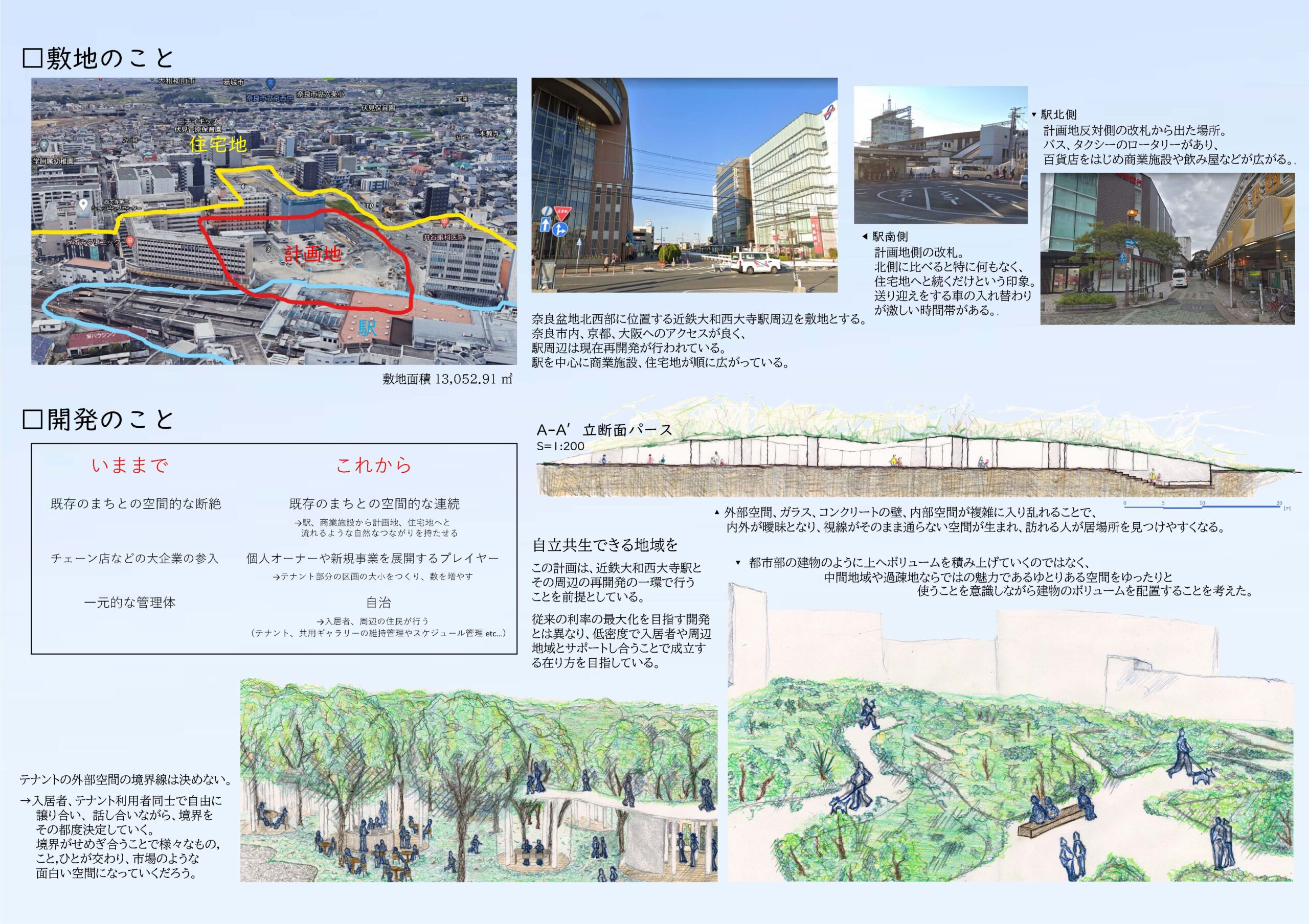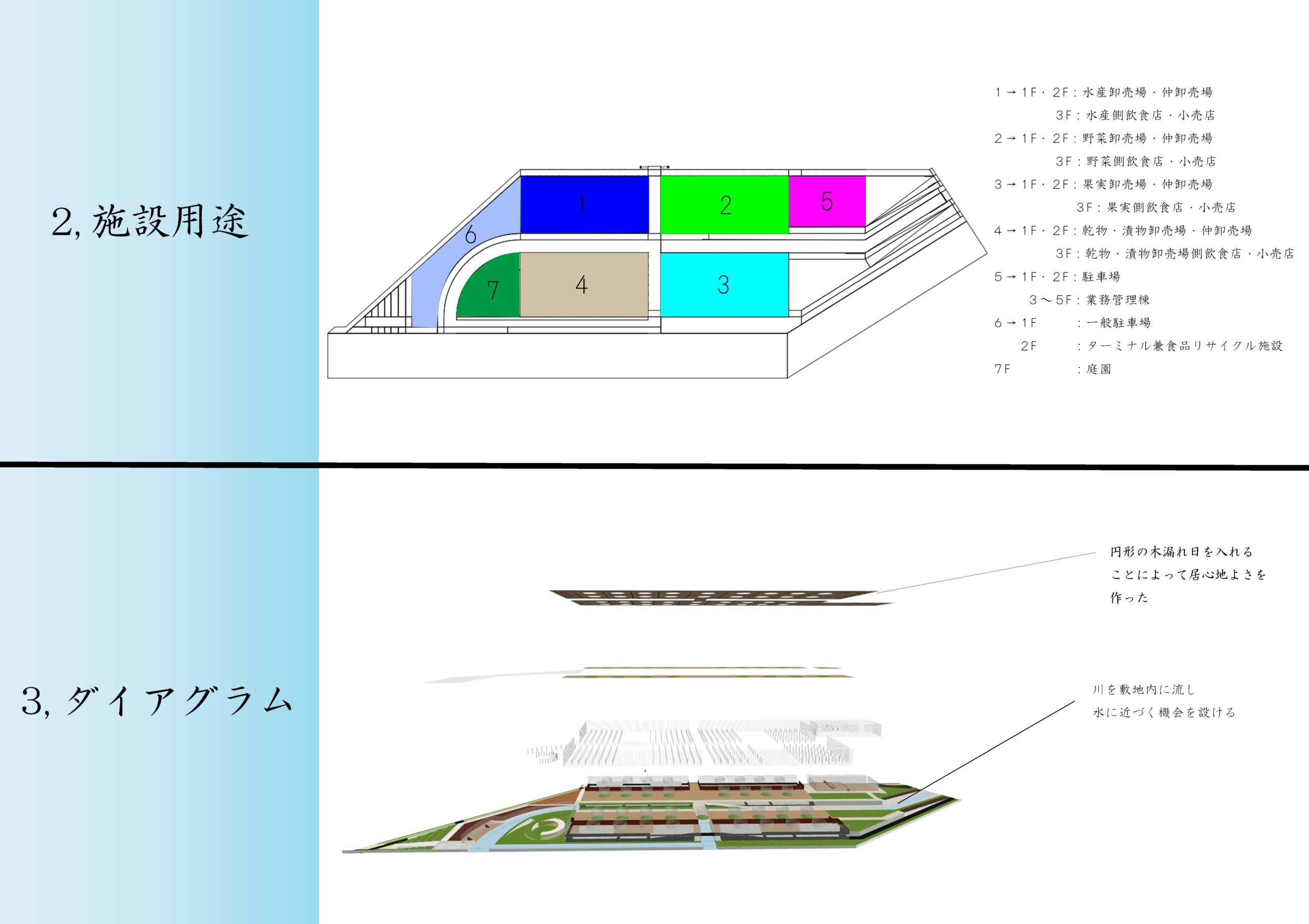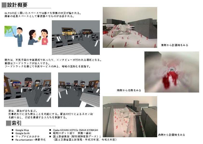 新しい時代になくなっていく文化をただ残す目的だけではなく、活かせる形にして水都大阪を魅力的に伝える計画は、食材廃棄の社会問題提起と改善を担いながら、「食」や「地域文化」とよりふれあい楽しめるものになっている。制作者は昨年の卒業生の卒業設計を手伝いながら、早期より自身の卒業設計の検討を始めていた。1歩進んで2歩下がるといった状況が長く続いたが、最終的に自分の形として完成させたのは努力の賜物である。<岡崎 祐介>