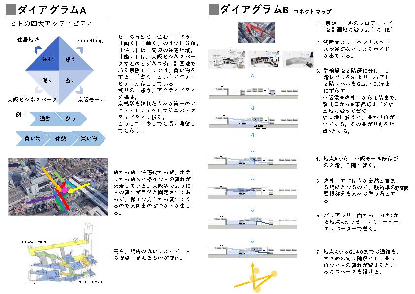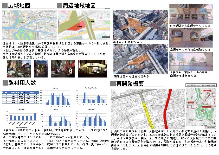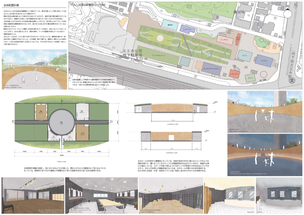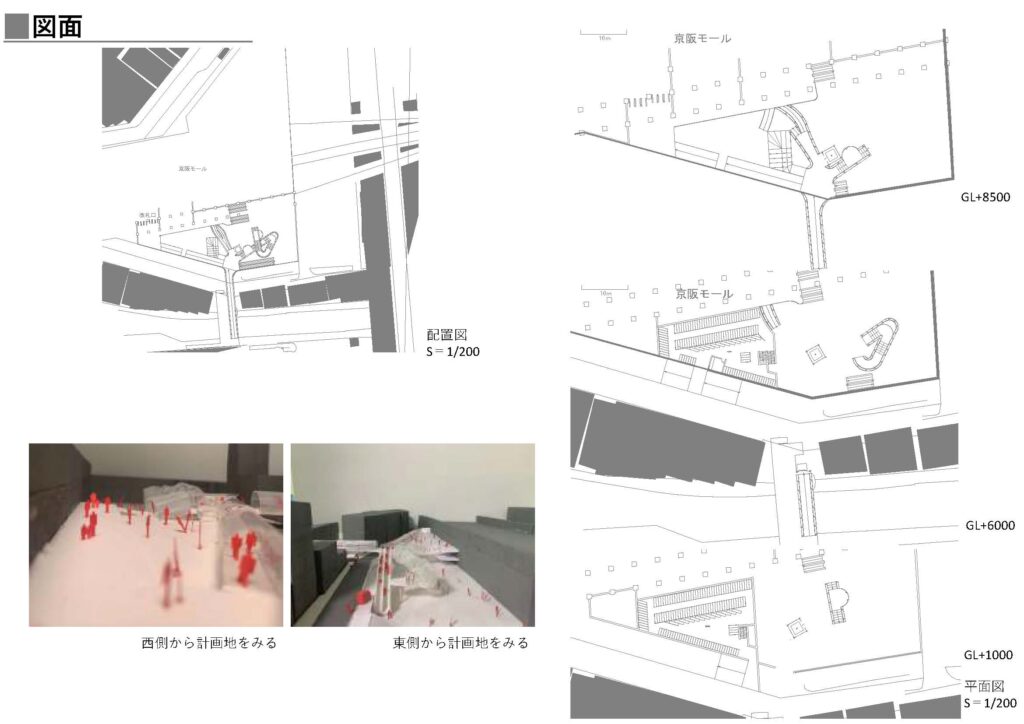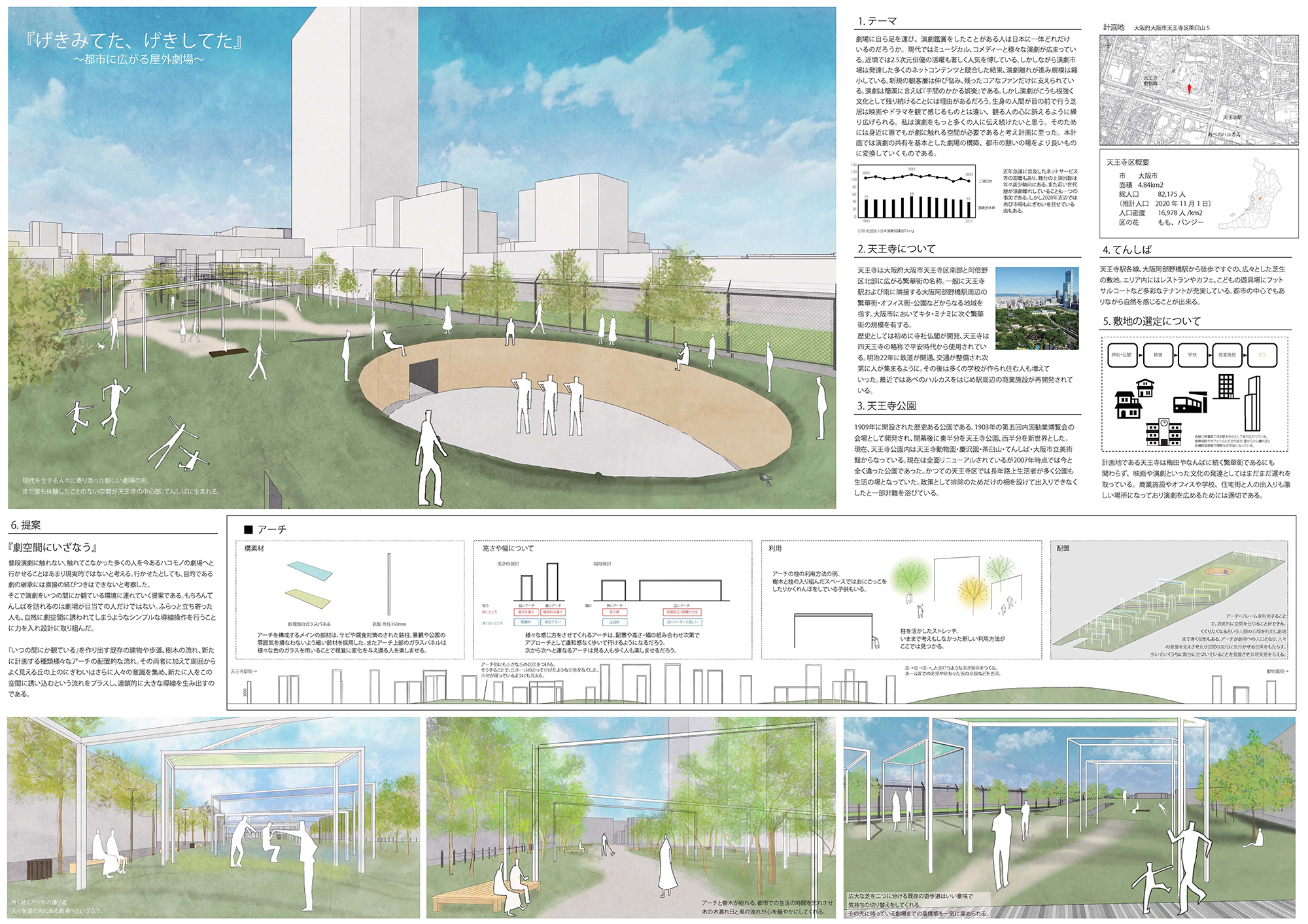 新しい時代になくなっていく文化をただ残す目的だけではなく、活かせる形にして水都大阪を魅力的に伝える計画は、食材廃棄の社会問題提起と改善を担いながら、「食」や「地域文化」とよりふれあい楽しめるものになっている。制作者は昨年の卒業生の卒業設計を手伝いながら、早期より自身の卒業設計の検討を始めていた。1歩進んで2歩下がるといった状況が長く続いたが、最終的に自分の形として完成させたのは努力の賜物である。<岡崎 祐介>
