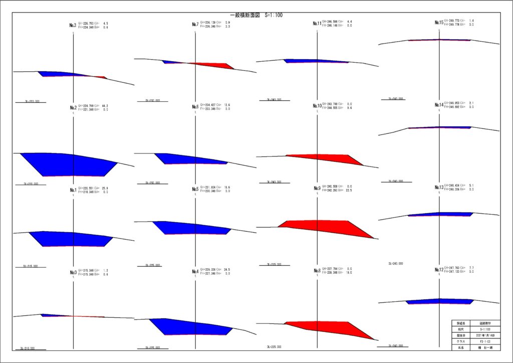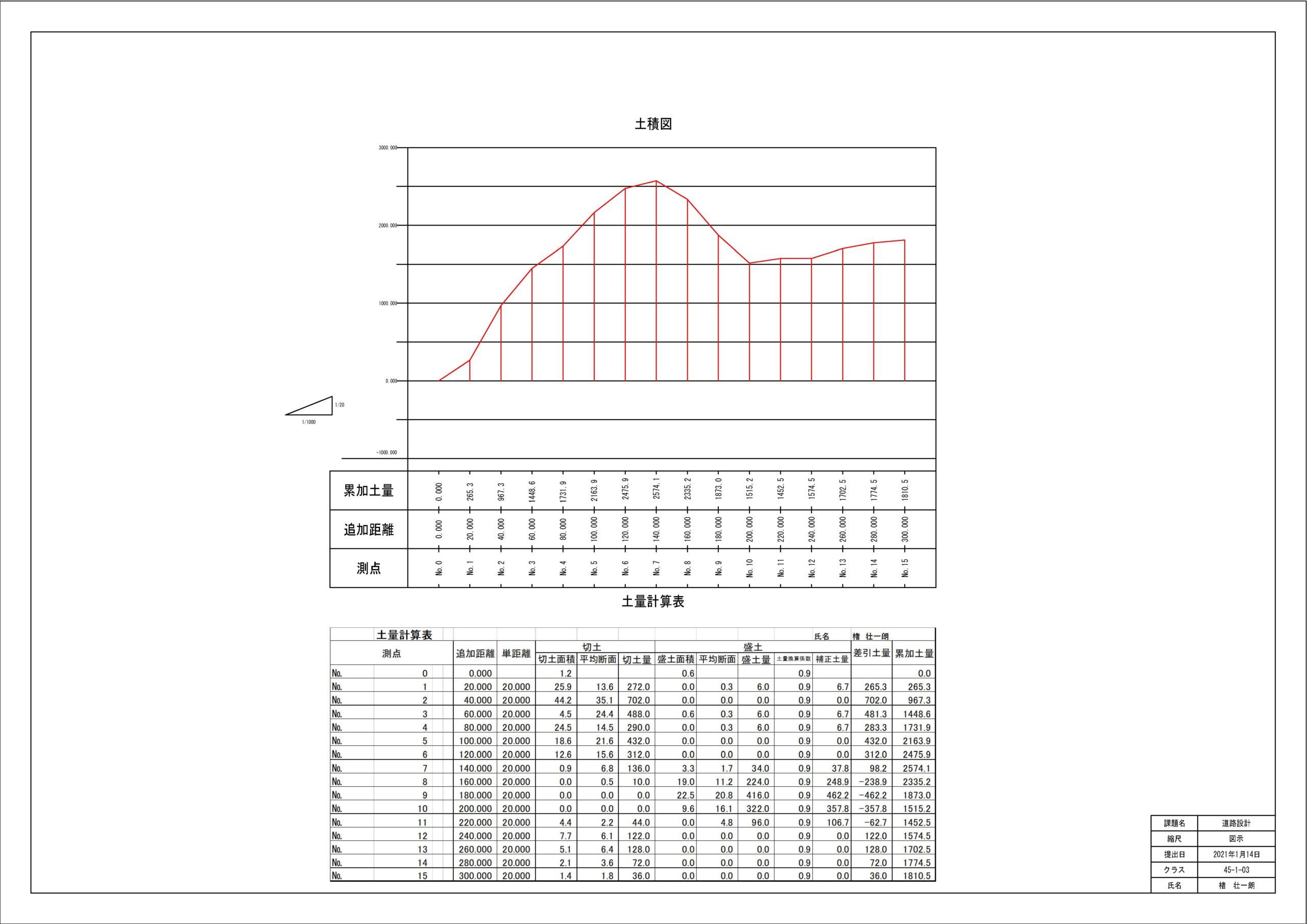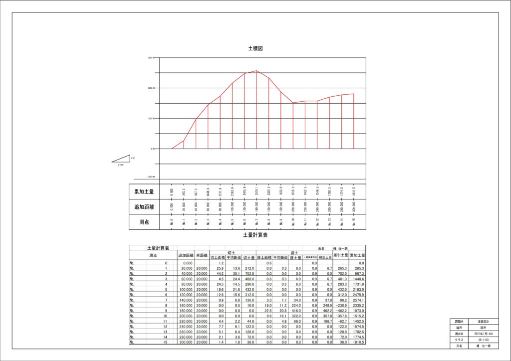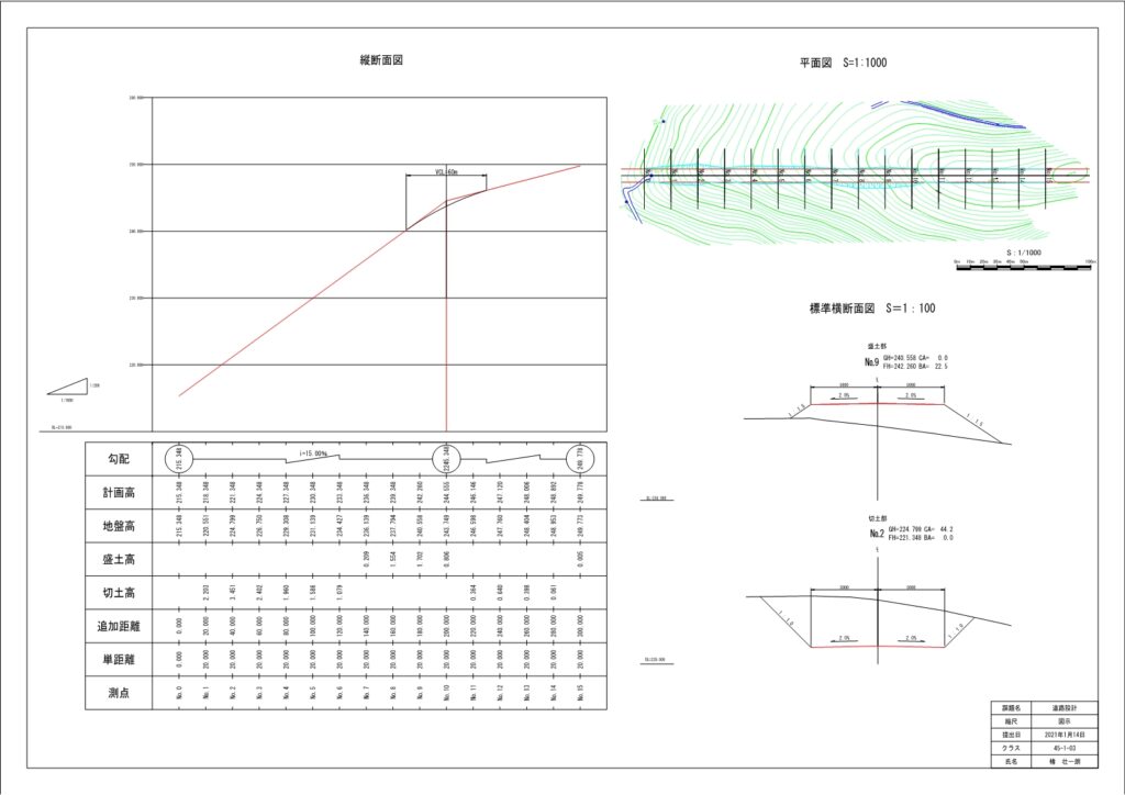 与えられた地形図上の距離をCADで計測し、Excelでまとめ、そのデータから現況の地盤高などを算出し、その結果を元に道路の計画を実施しました。途中間違いに気づき訂正することもありました。