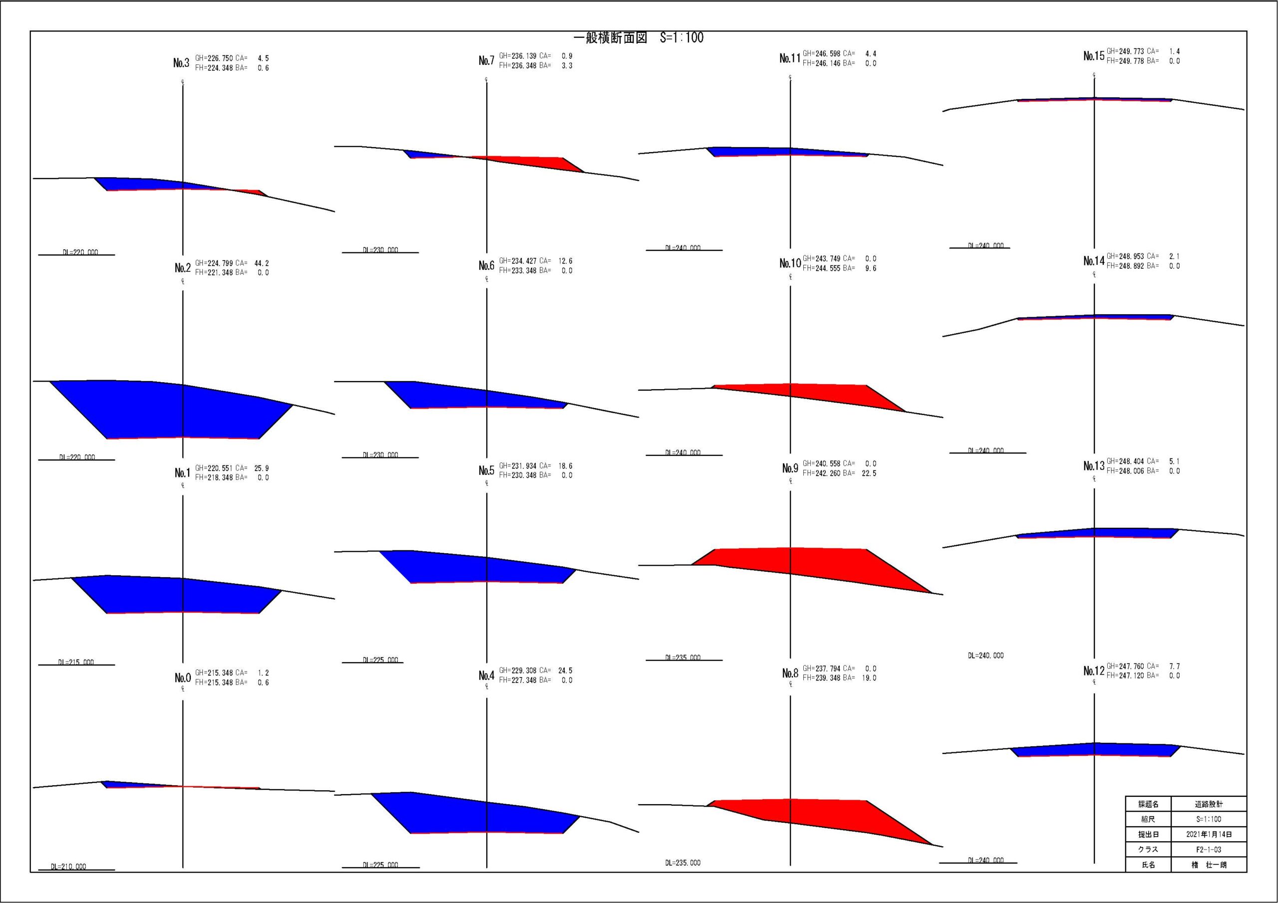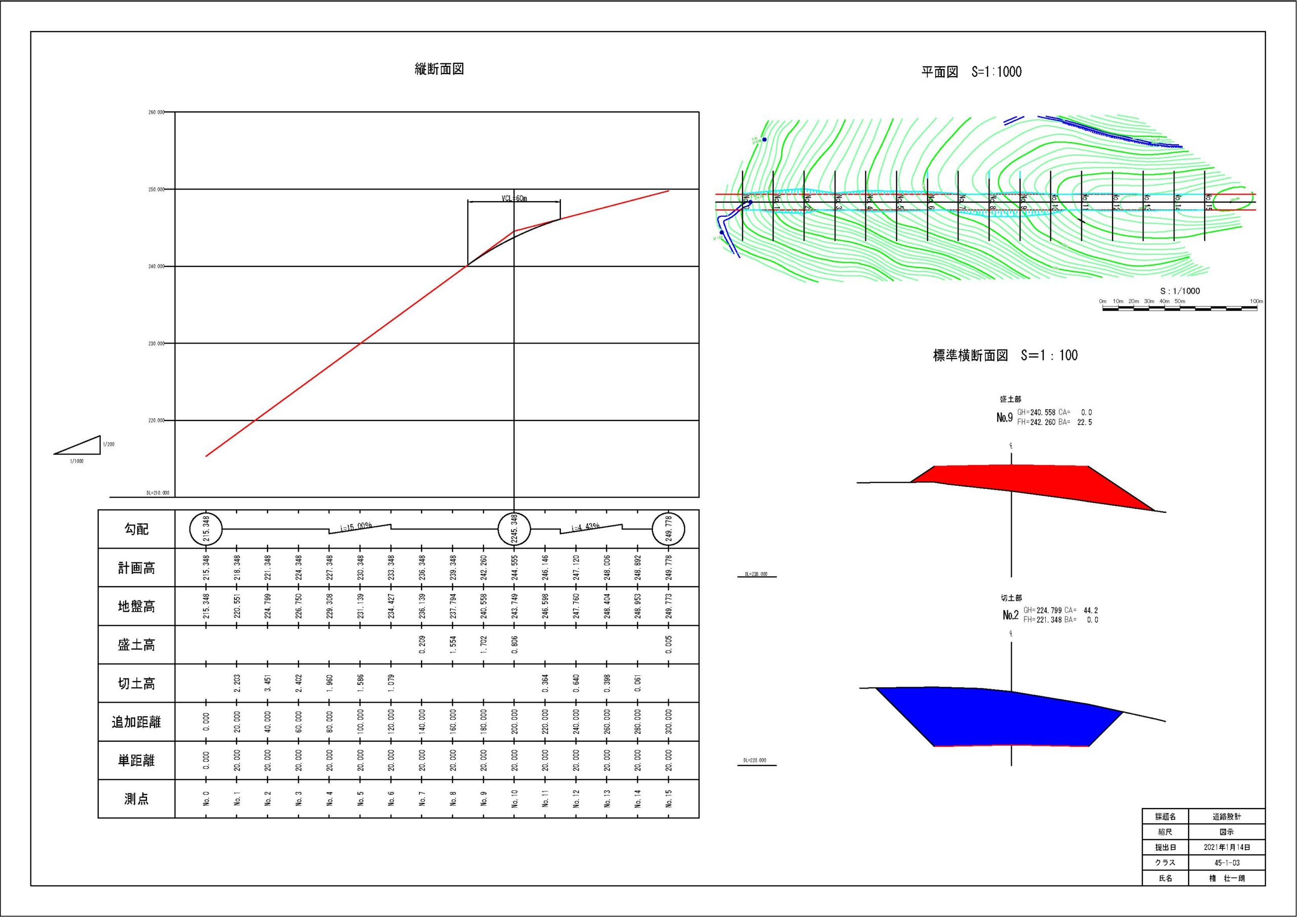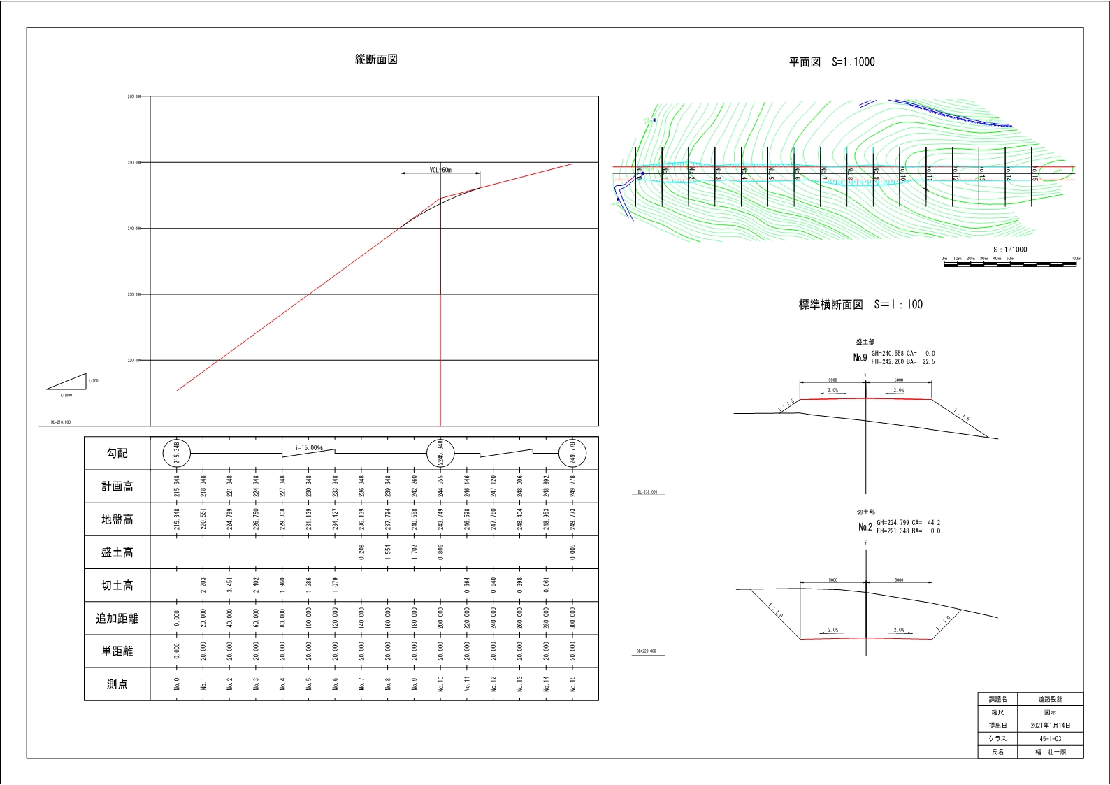 道路設計コースの道路路線設計は、入学してから学んだCAD製図、測量学、施工学などの知識を基に、地形図をもとにペーパーロケーションで等高線を読みながら、縦横断測量から土量計算までの一連の流れを実施している。この設計はこれまでの学習成果である知識を活用し、直線の道路ではあるがAuto CADやエクセルの計算機能を活用し道路を計画し図面にまとめている。<野瀬 孝男>