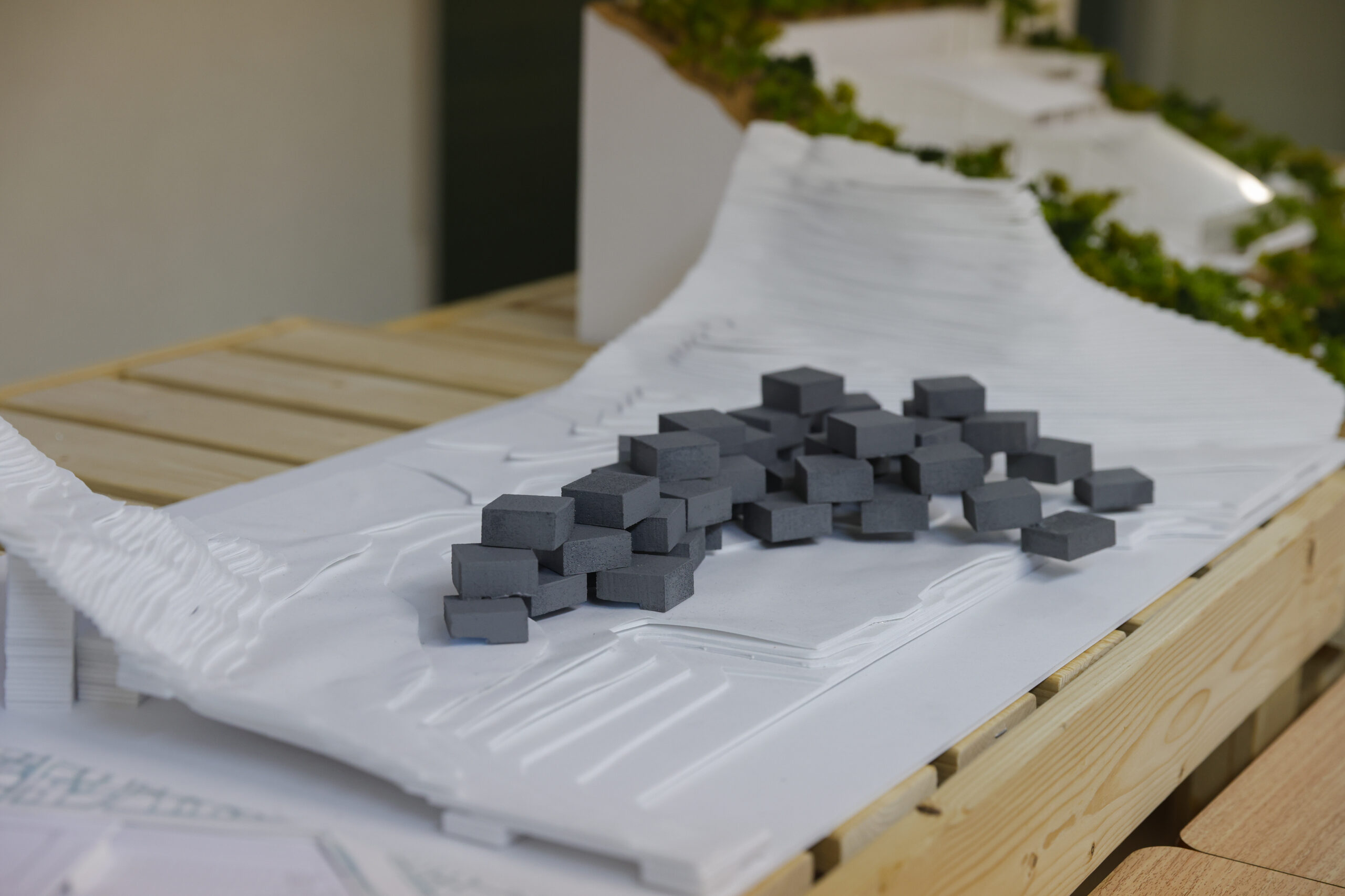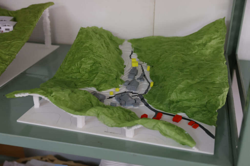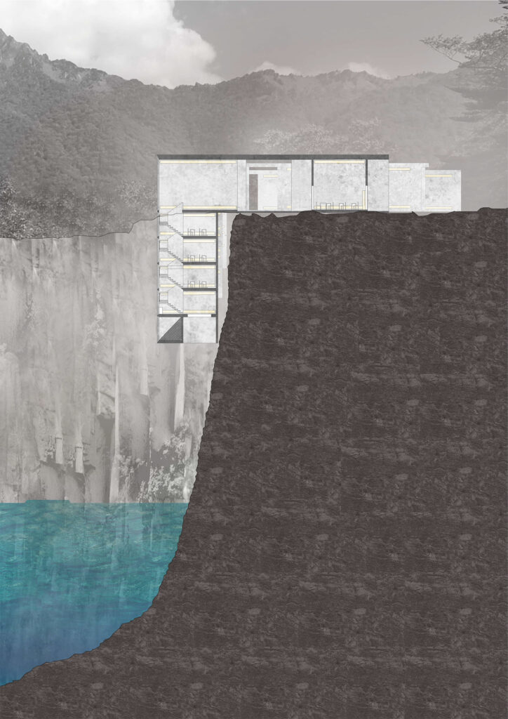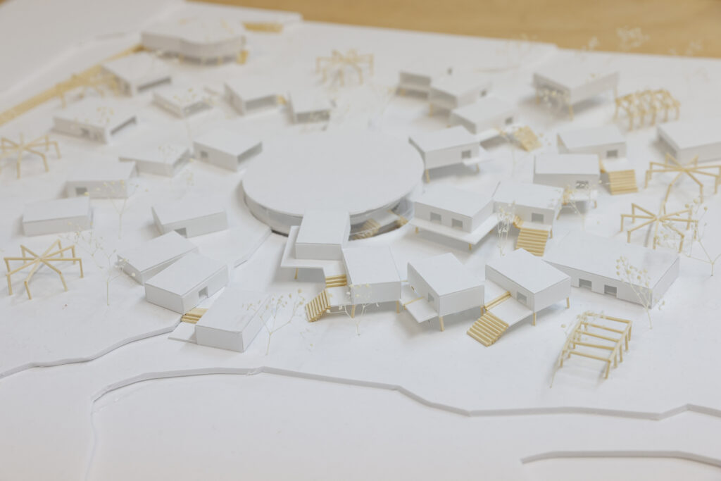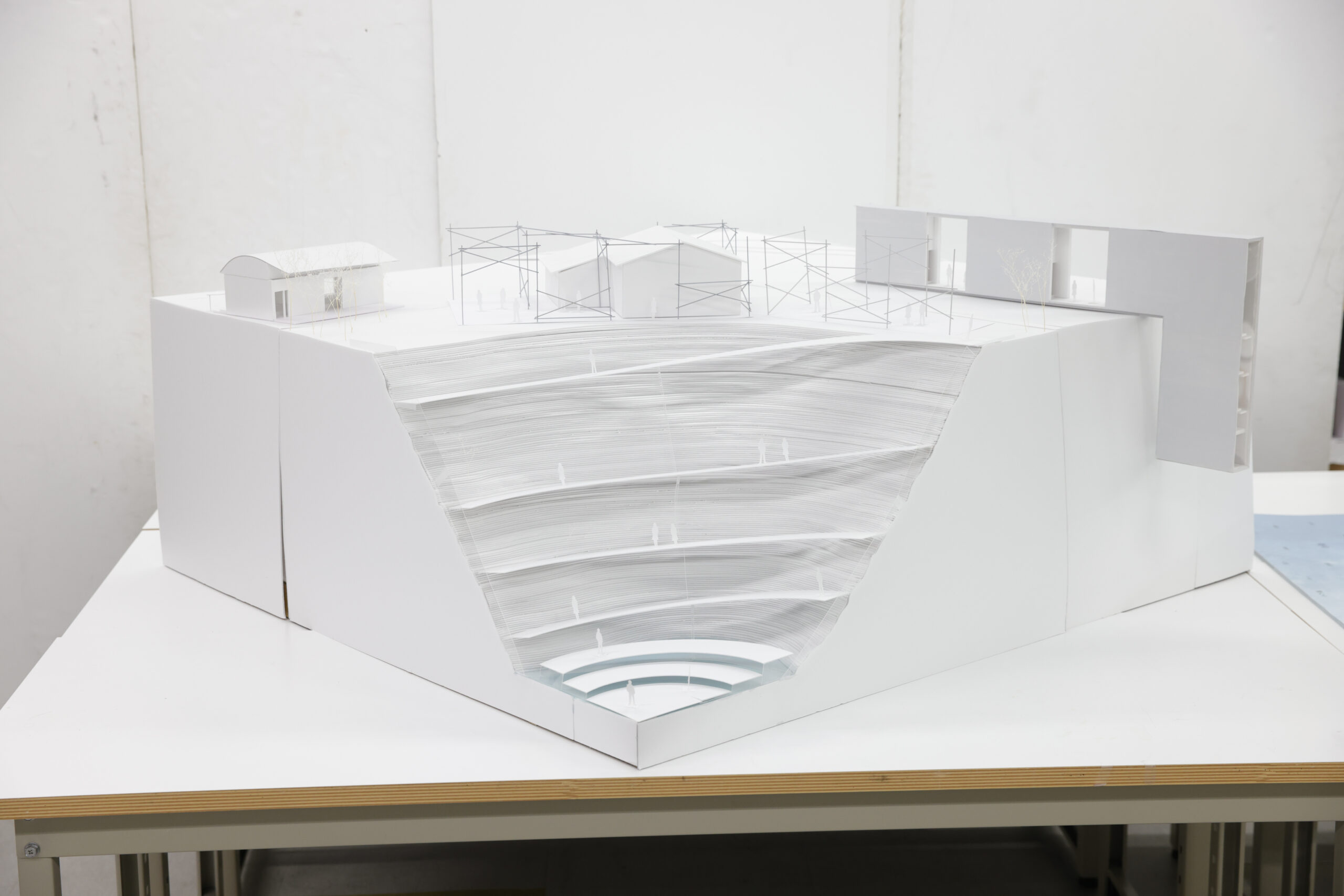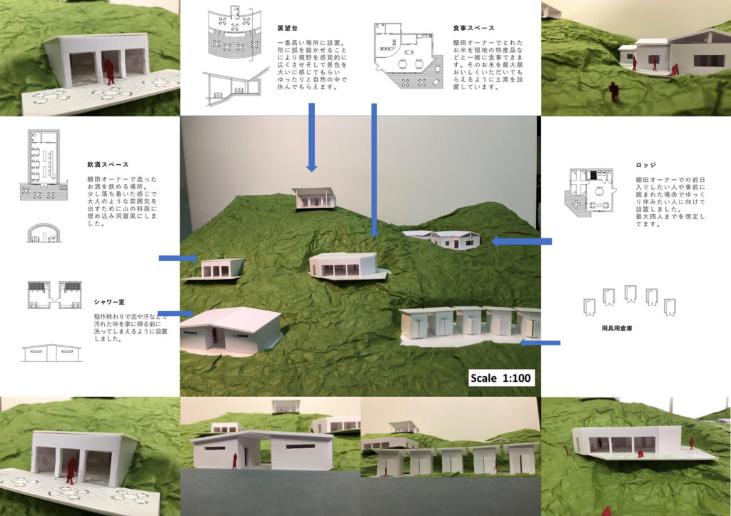 この作品は今ある棚田の耕作放棄の問題に注目して、これから棚田をいかにどう残すかを考えました。手入れの問題、その地域で行われている地域活動などを調べたり、季節によって違った顔をしてくれる棚田にとても惹かれました。なので対面の山の斜面に用途に分けて建物を設計しました。すべての建物に共通することは棚田をどこからでも見て楽しめる、味わってもらえるように考えました。