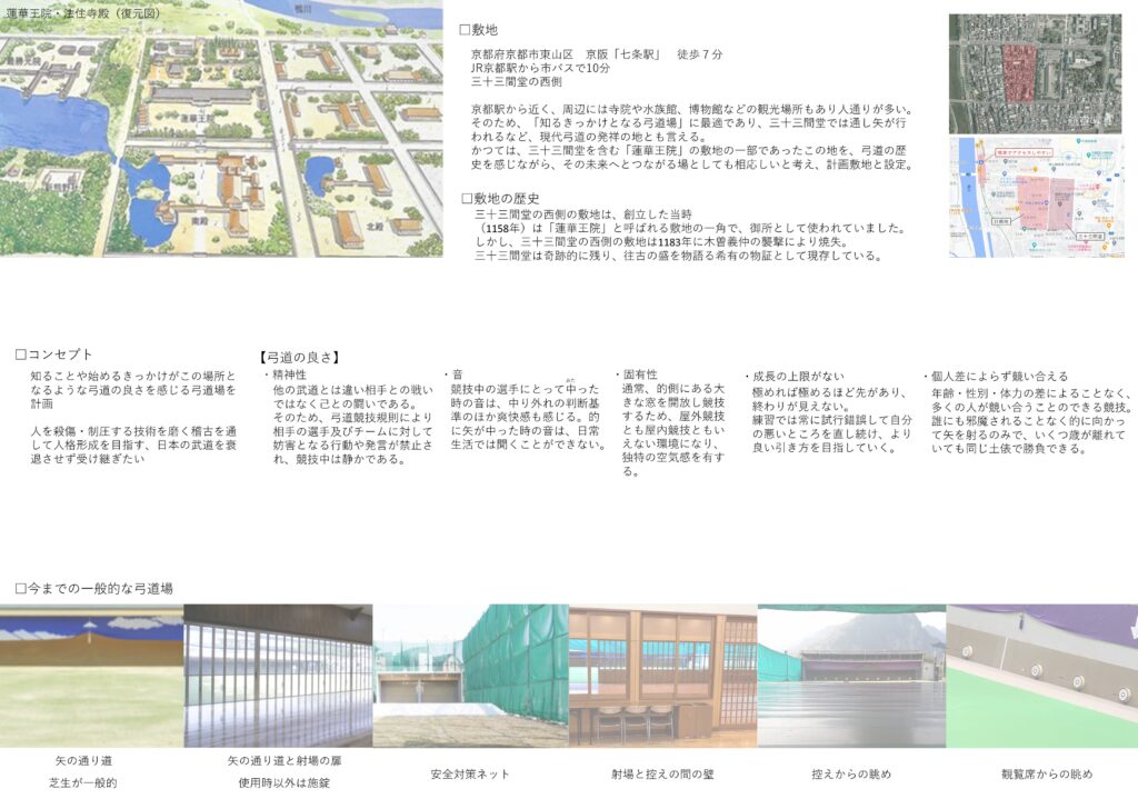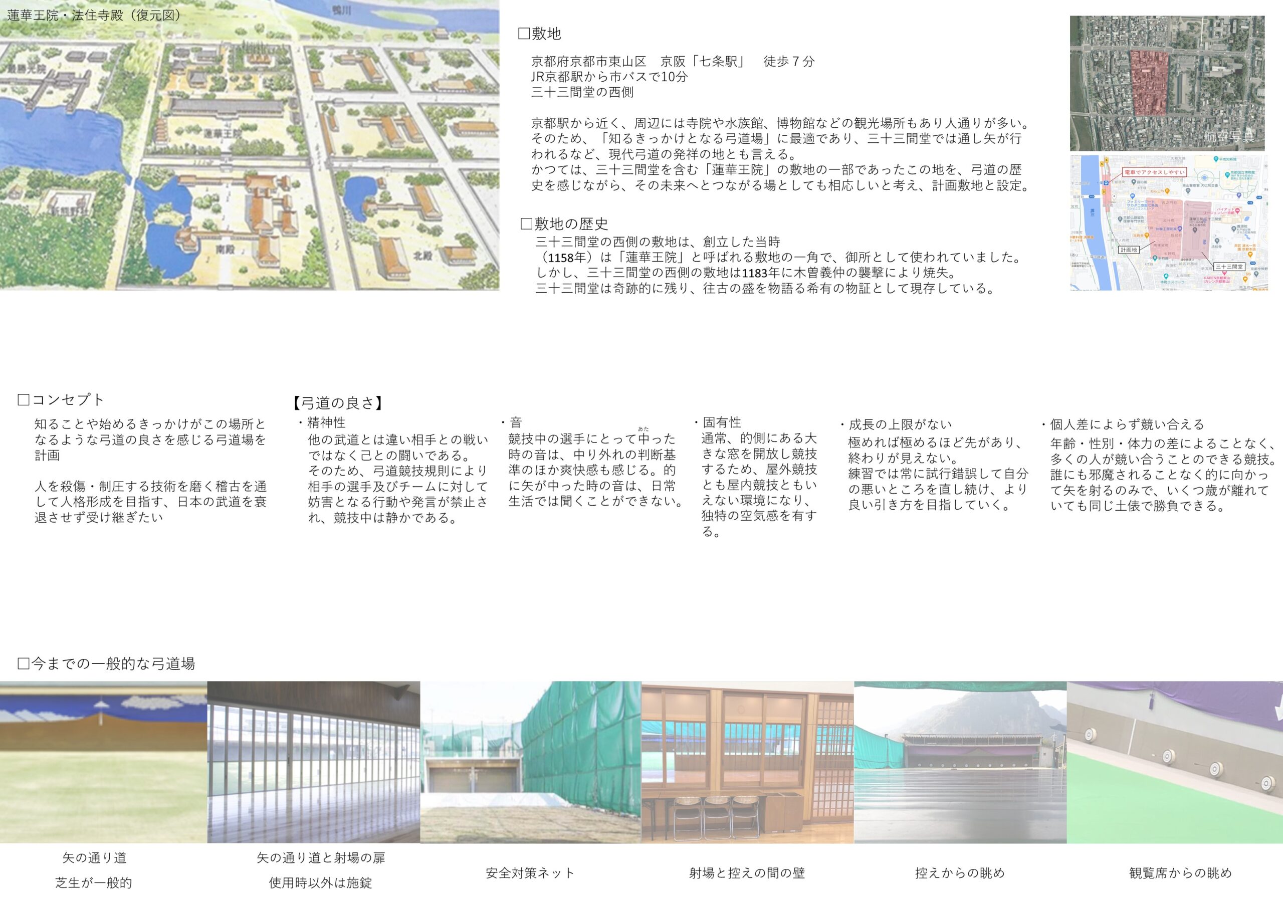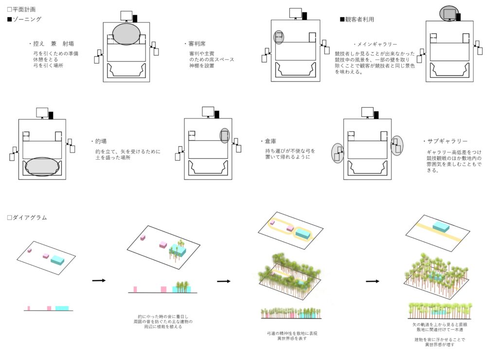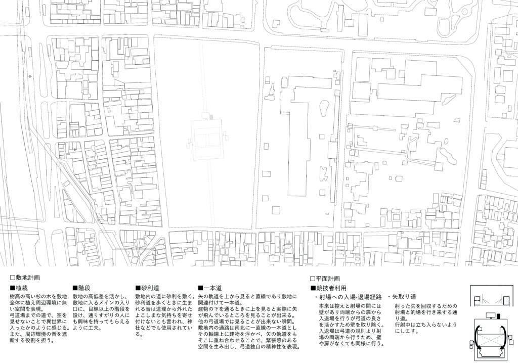 弓道場という少し珍しい建物用途の計画です。一般的には触れる機会が少ないと思われるこの競技が抱える課題について、競技経験者ならではの視点を踏まえた解決を図っています。選定敷地の持つ歴史性や場所性、周辺環境との関係性、敷地内における建物内外の空間構成など、調査・分析・検討の各段階にしっかりとした努力の跡が感じられる作品となっています。<福山 亮介>