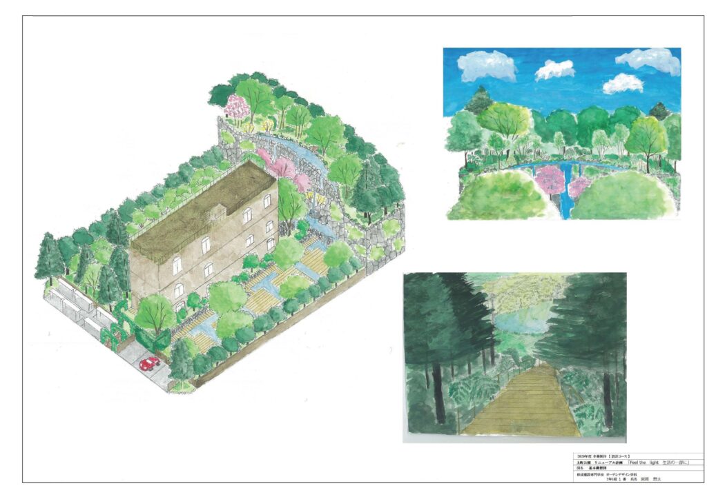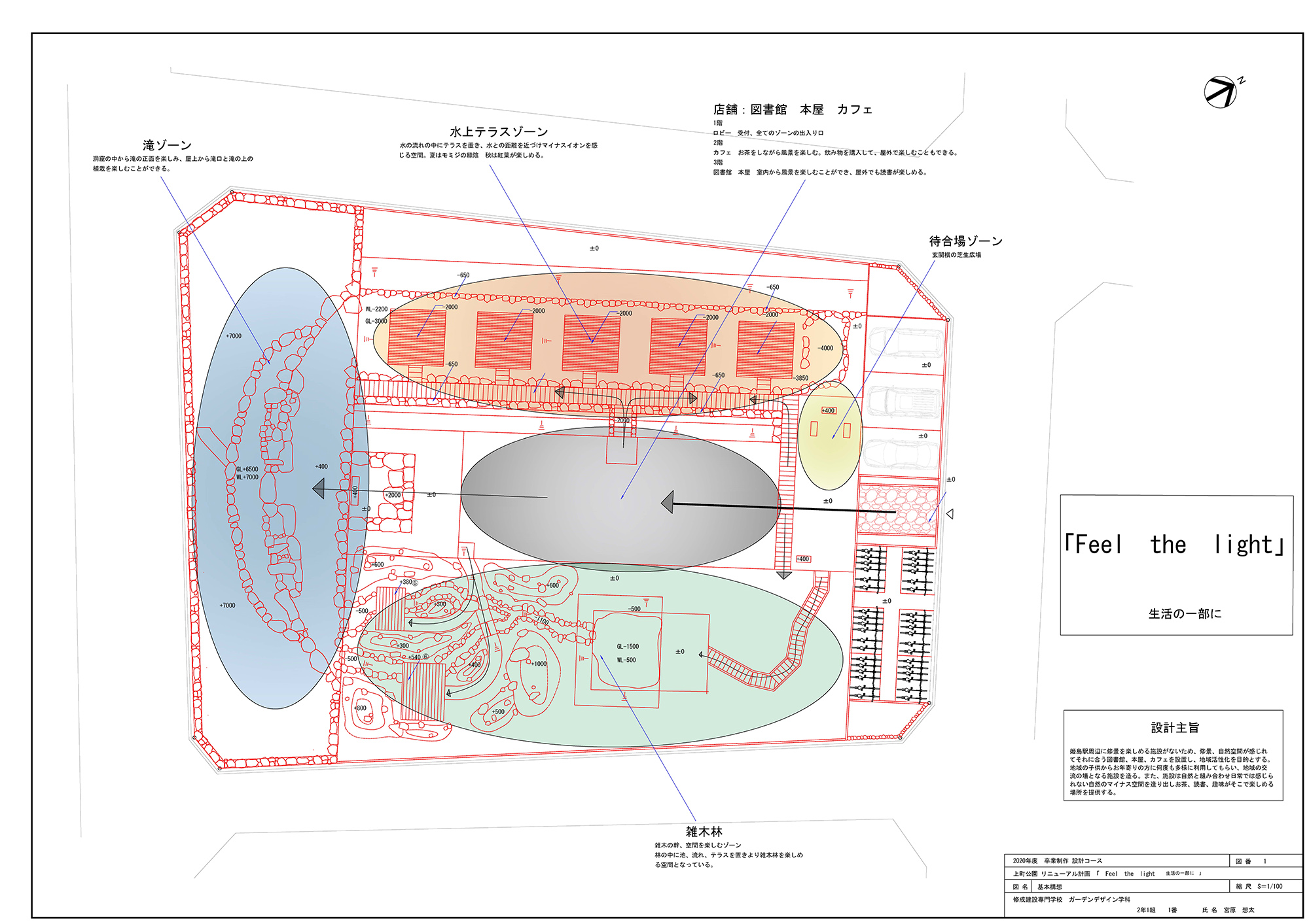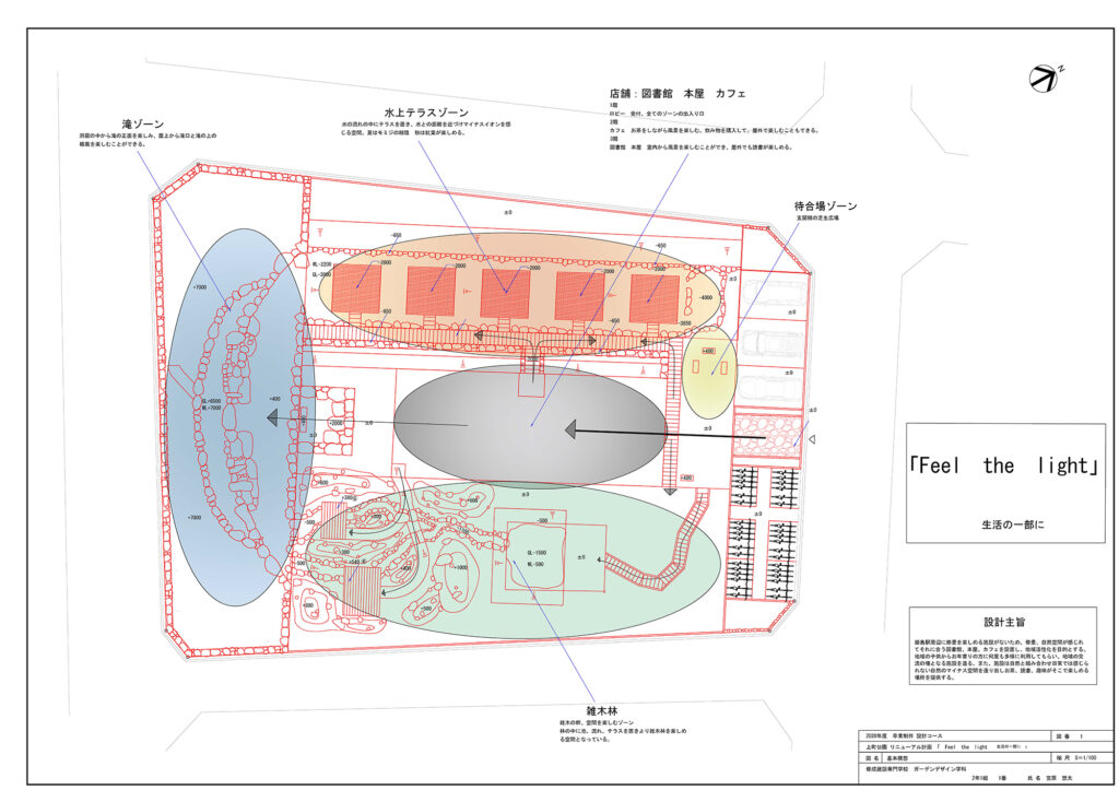 近隣住民をターゲットに幅広い年齢層のコミュニケーションを生むものとして図書館及び本屋とカフェからなる複合商業施設を主とし、1,500㎡の計画地を周囲の道路面から3,0m掘り下げ、滝と水の流れを身近に感じさせる癒しの庭園空間を提案。‘光’をキーワードに随所に陰影を取り入れ様々な工夫を凝らしダイナミックな自然風景を作り上げた。思いを実現するための努力を惜しまない、しつこいまでの探求心が内容を深め、2年間の集大成と納得できる作品に仕上がっている。<明石 祥子>