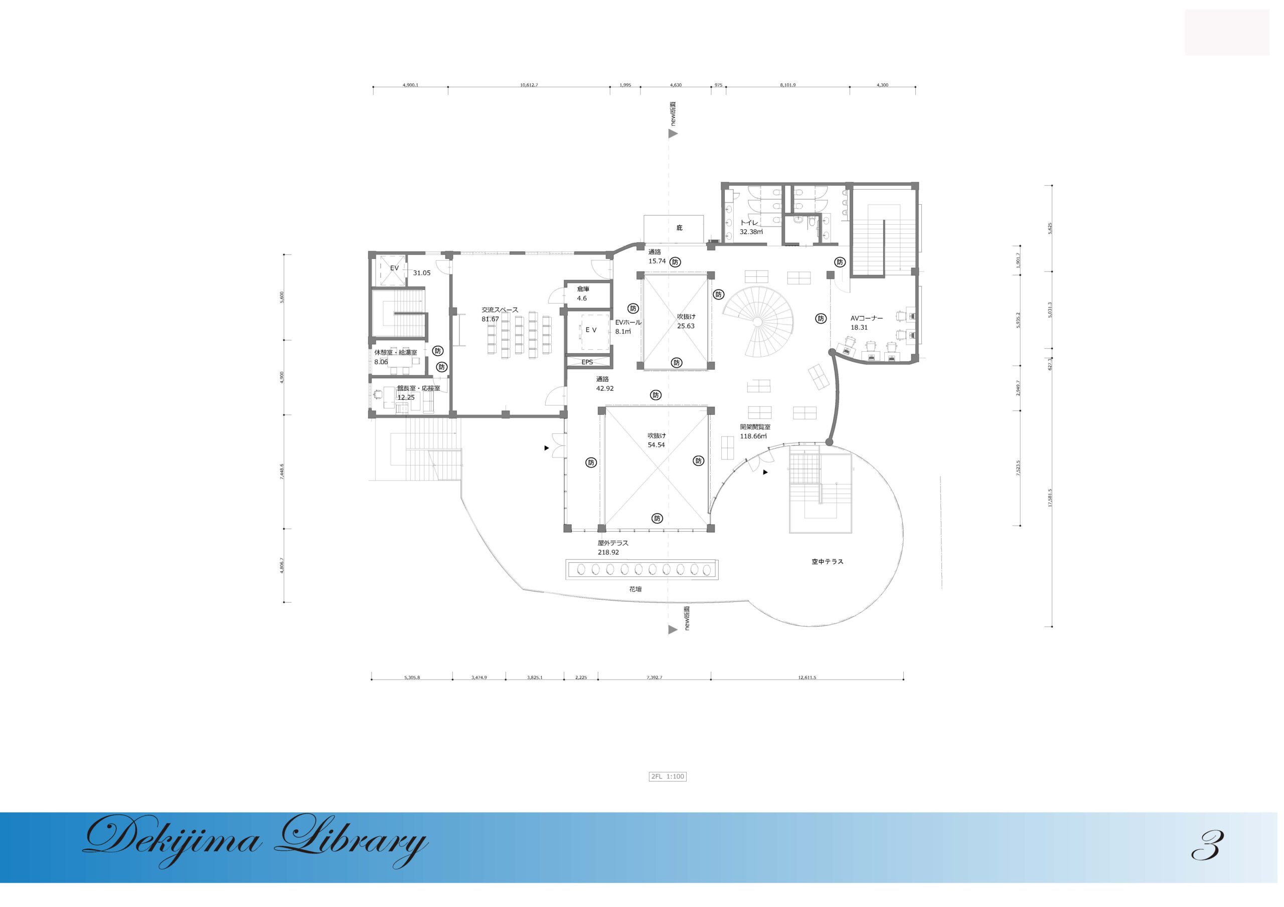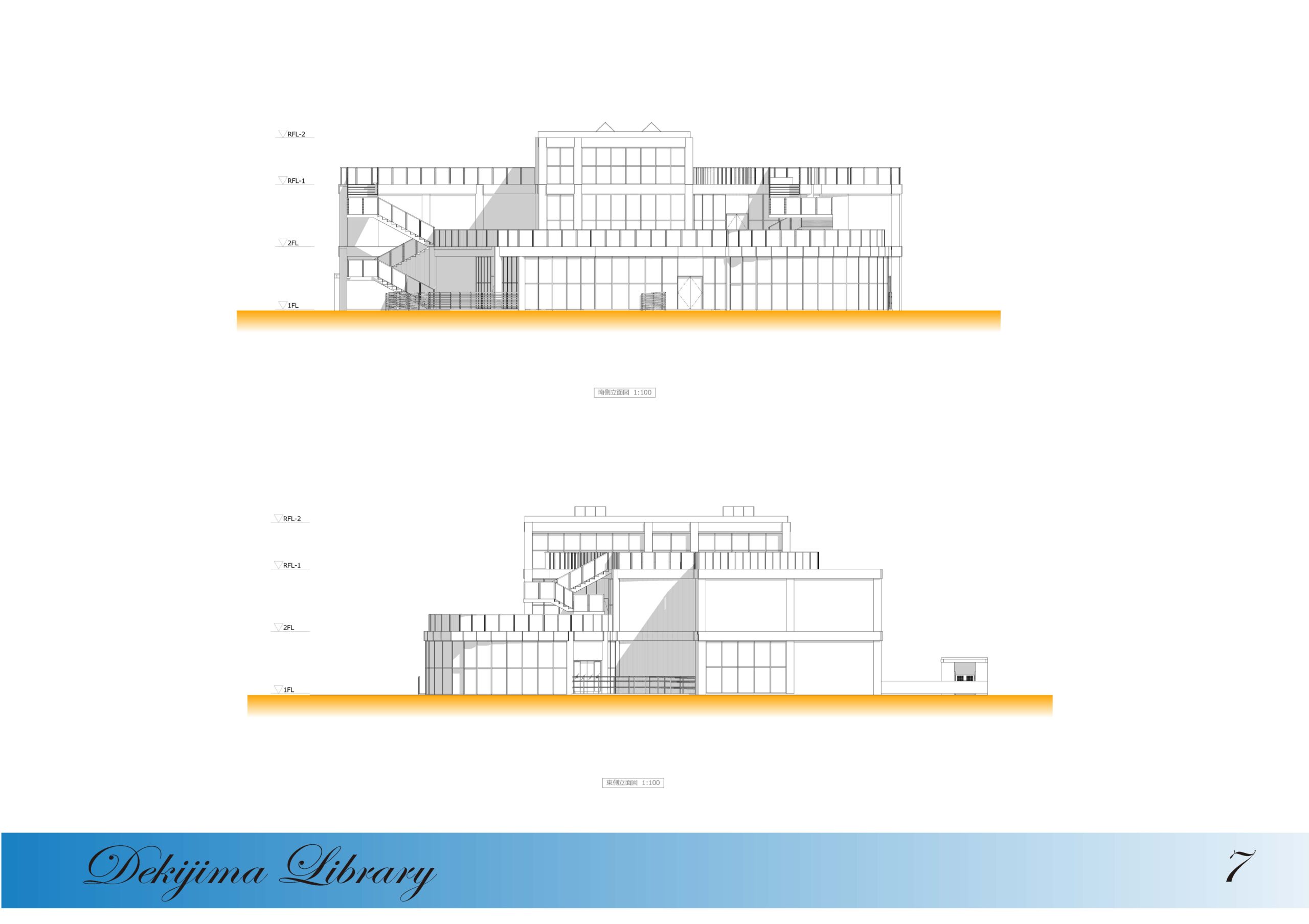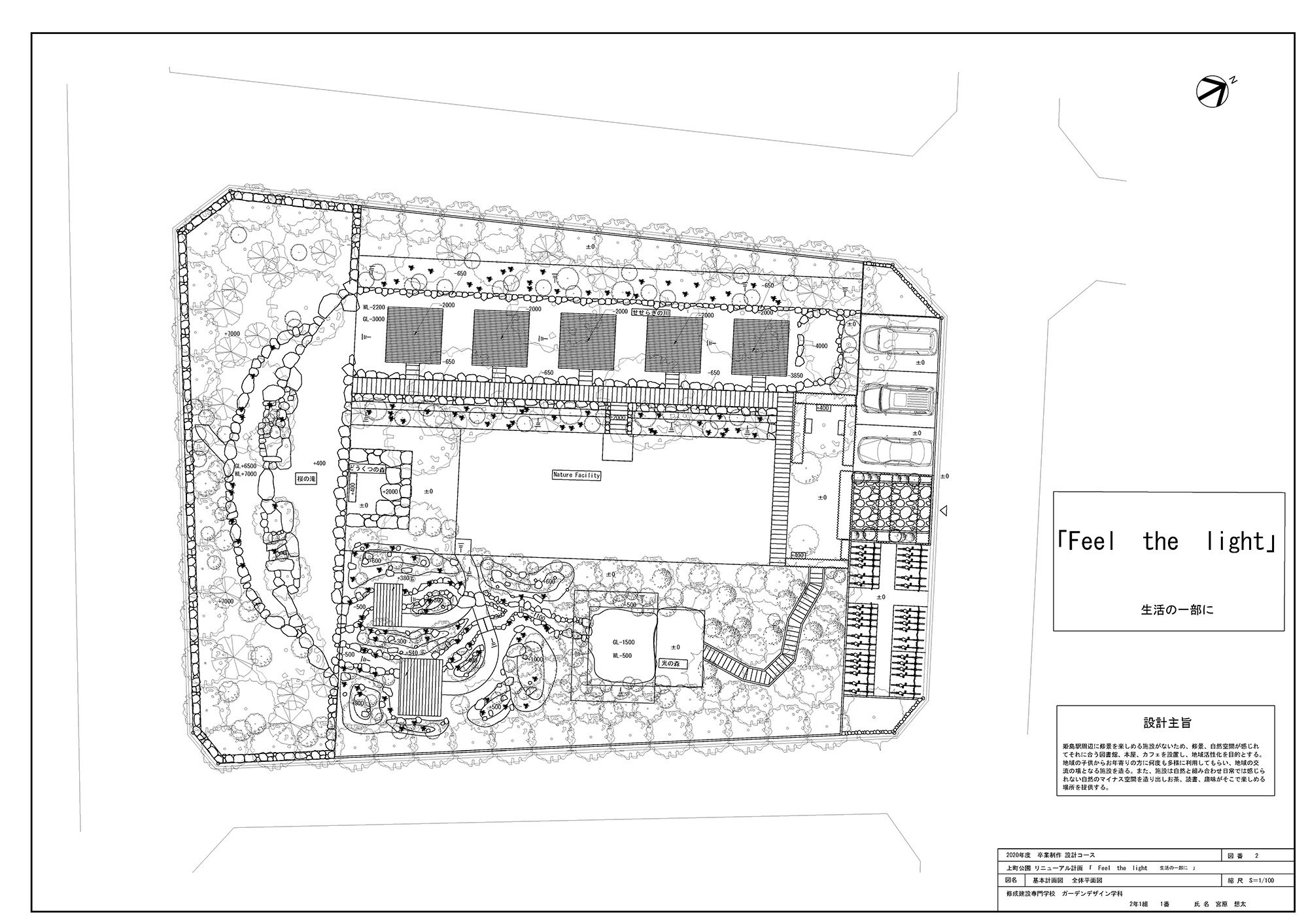 近隣住民をターゲットに幅広い年齢層のコミュニケーションを生むものとして図書館及び本屋とカフェからなる複合商業施設を主とし、1,500㎡の計画地を周囲の道路面から3,0m掘り下げ、滝と水の流れを身近に感じさせる癒しの庭園空間を提案。‘光’をキーワードに随所に陰影を取り入れ様々な工夫を凝らしダイナミックな自然風景を作り上げた。思いを実現するための努力を惜しまない、しつこいまでの探求心が内容を深め、2年間の集大成と納得できる作品に仕上がっている。<明石 祥子>