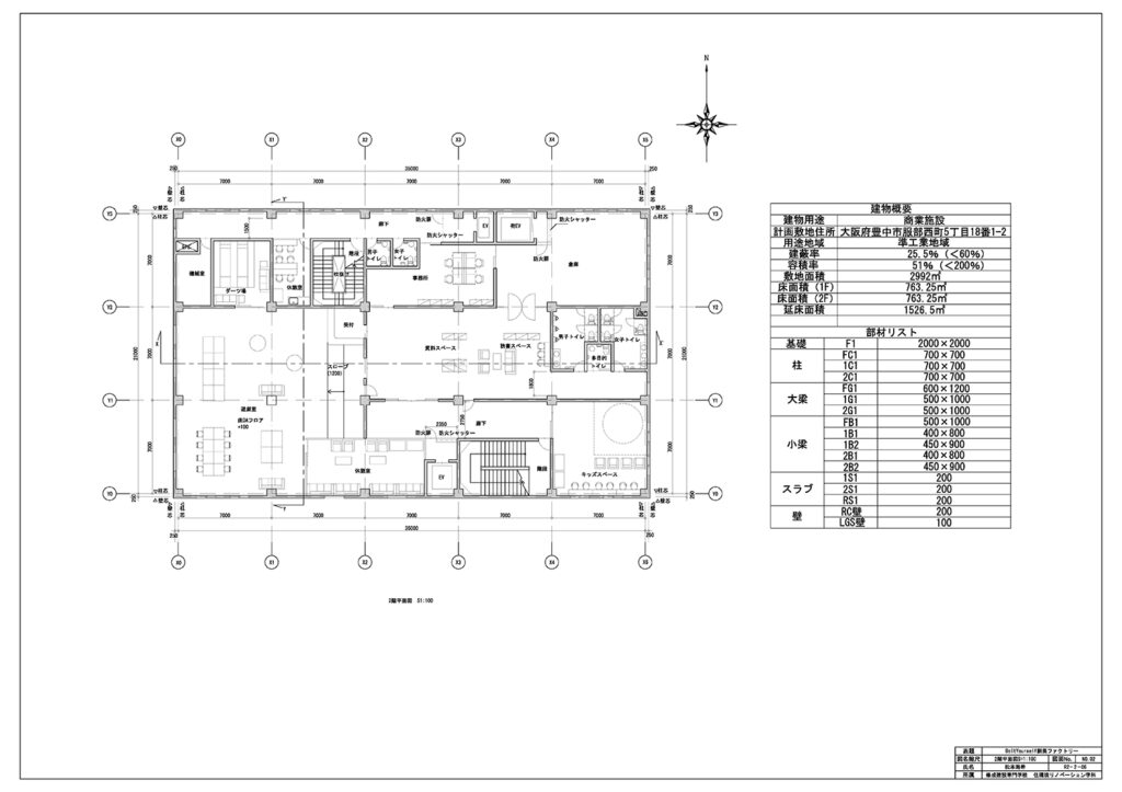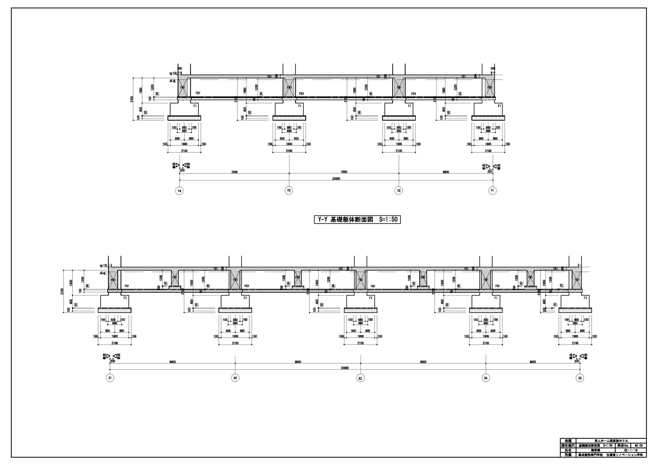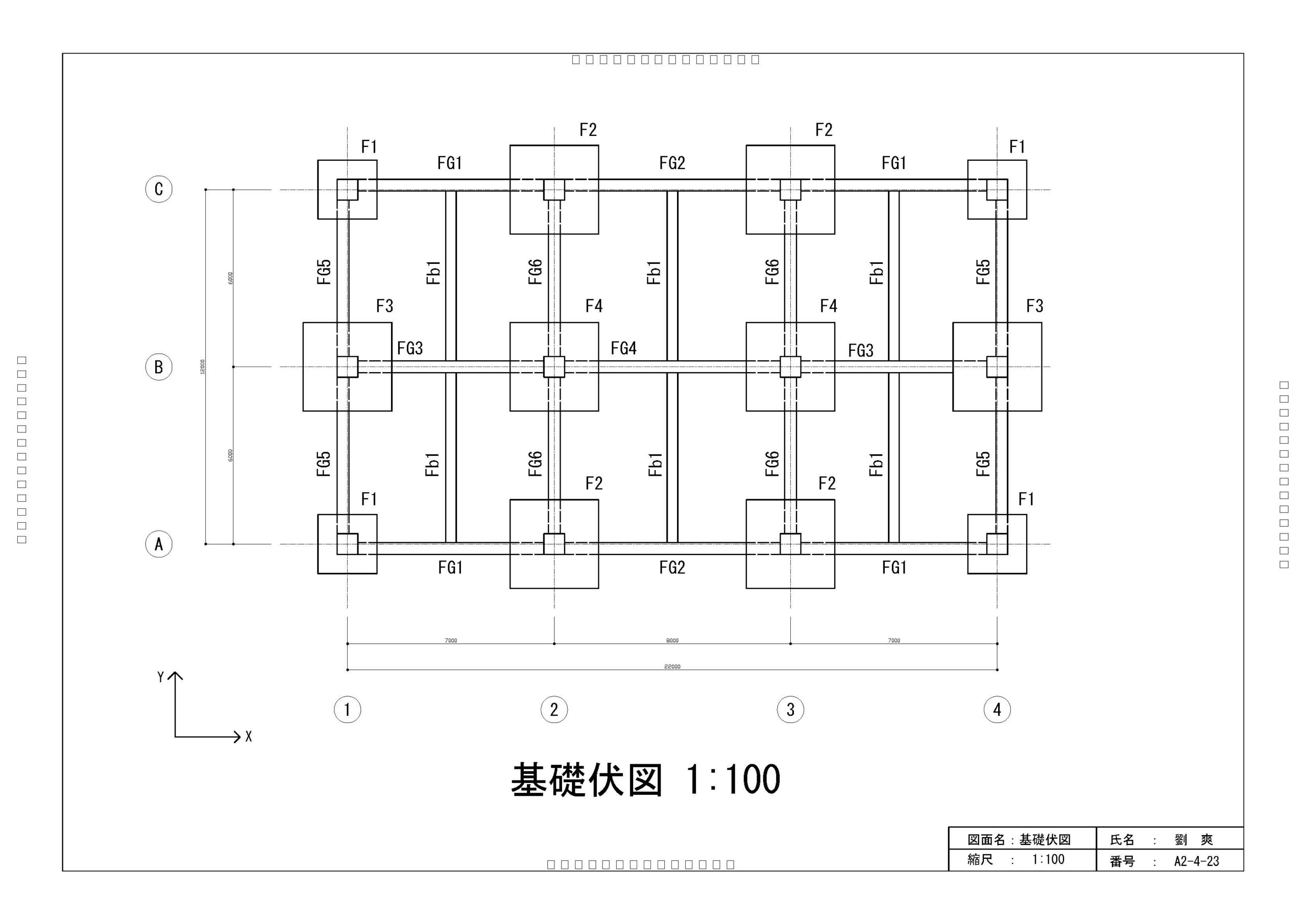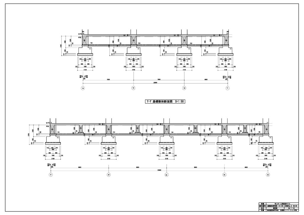 「構造設計」は、建物の基礎と建物を支える柱や梁などの断面設計を決め、建物基準法に適合した建築物になるようにするのが主な内容である。本建物は、鉄筋コンクリート2階建て(地下なし)で、X 方向3スパン、Y方向2スパンの均等ラーメン構造である。