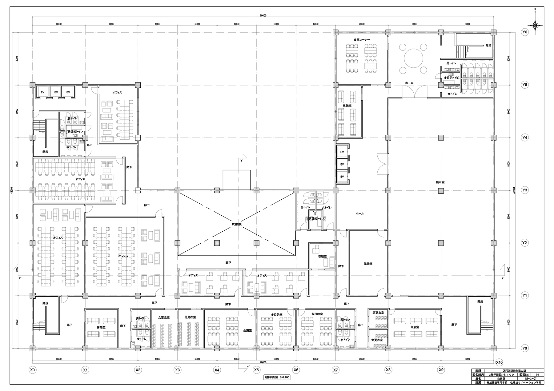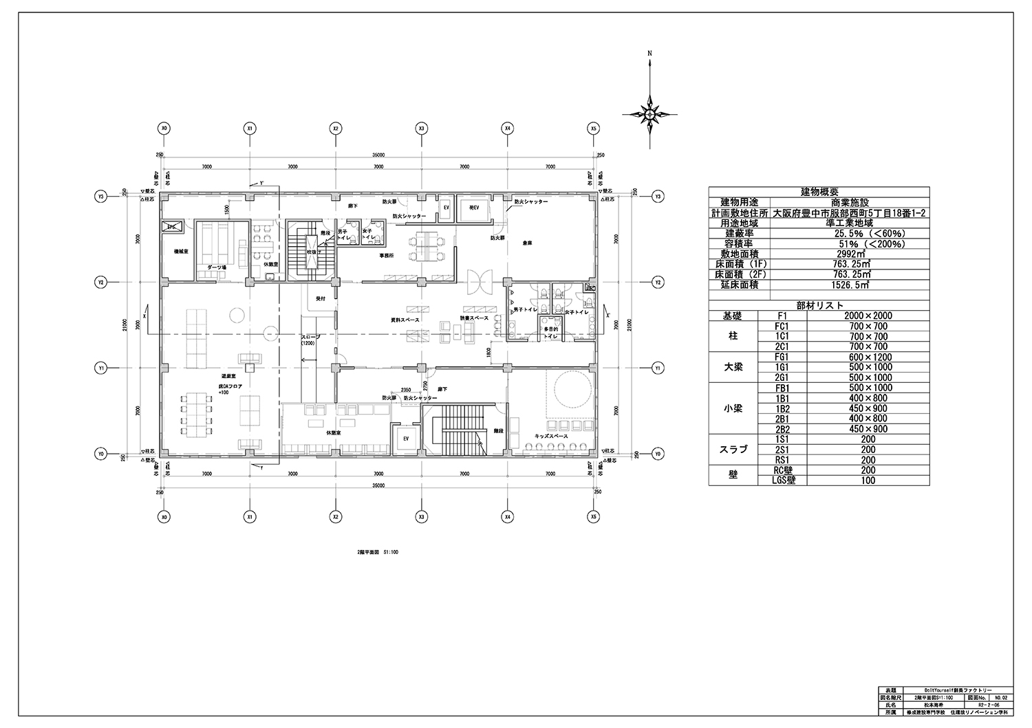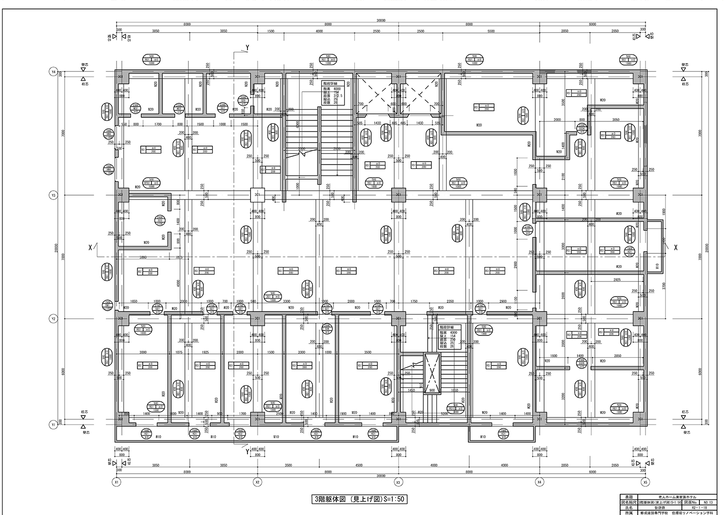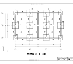 「構造設計」は、建物の基礎と建物を支える柱や梁などの断面設計を決め、建物基準法に適合した建築物になるようにするのが主な内容である。本建物は、鉄筋コンクリート2階建て(地下なし)で、X 方向3スパン、Y方向2スパンの均等ラーメン構造である。