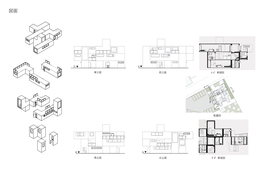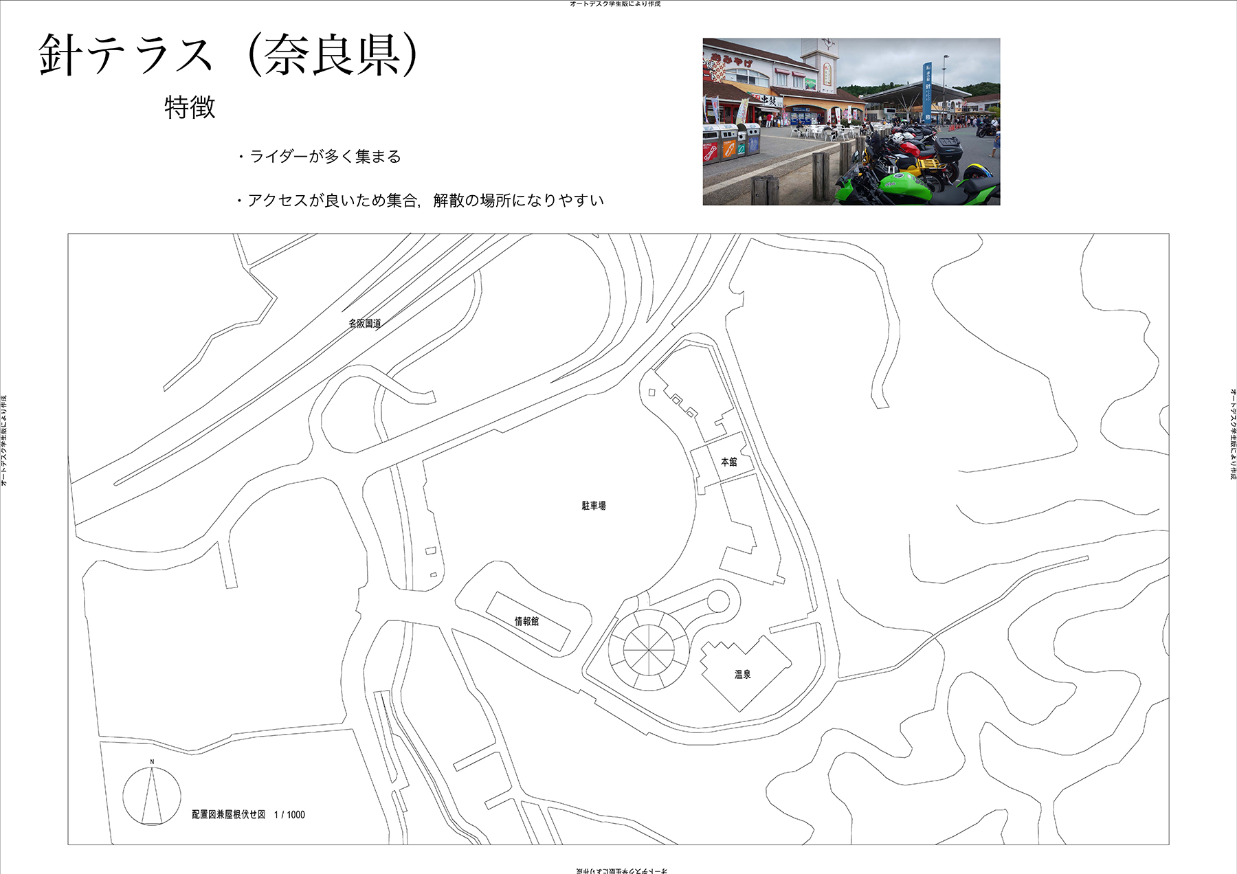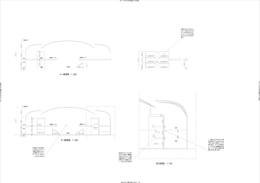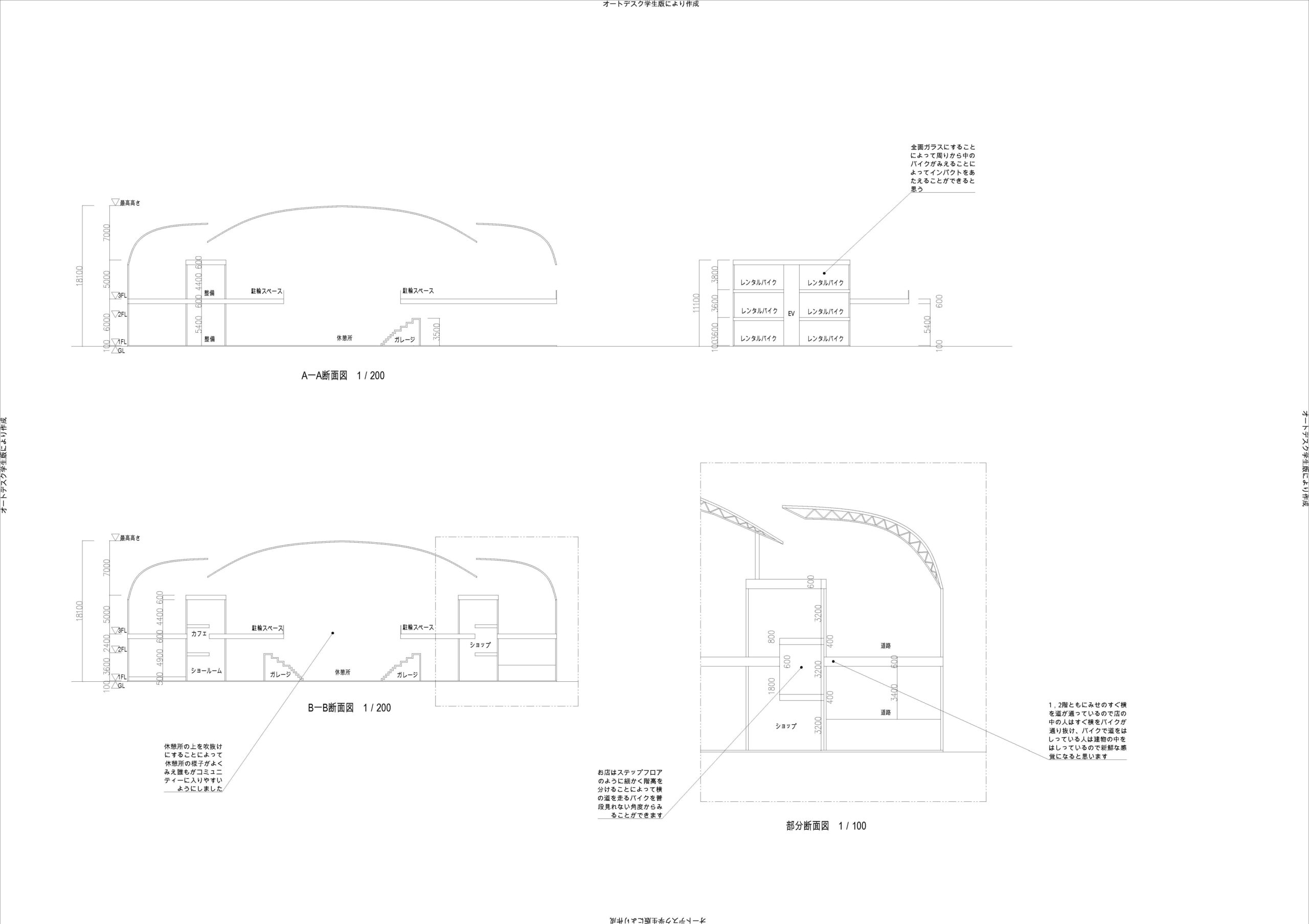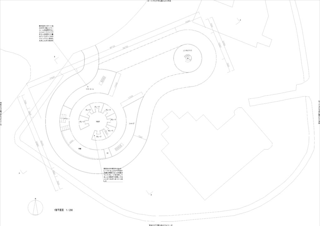 設計者が趣味としている大型バイクを起点に敷地を選定し、その敷地を読み解きプログラムを組み立てた。プロジェクトの全体に渡って順調に推移したが、つまずきがなかったことに対して指導者としては物足りなさを感じている。卒業後は実社会での設計で彼の理解力の高さや手先の器用さを活かして欲しい。<田中 おと吉>