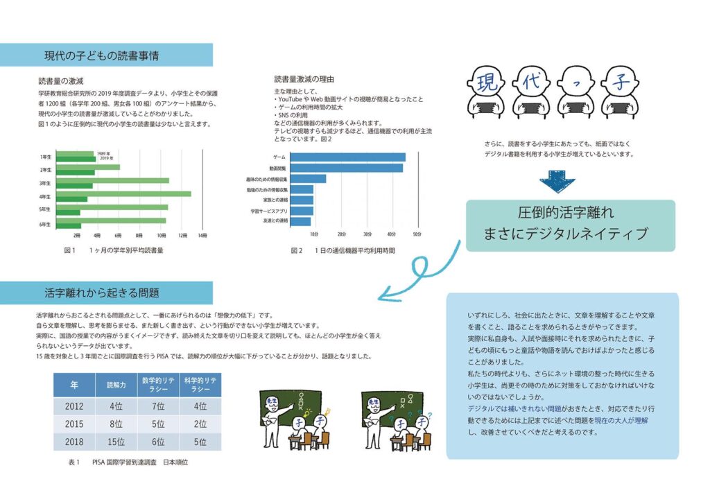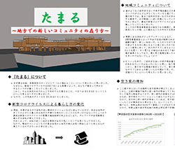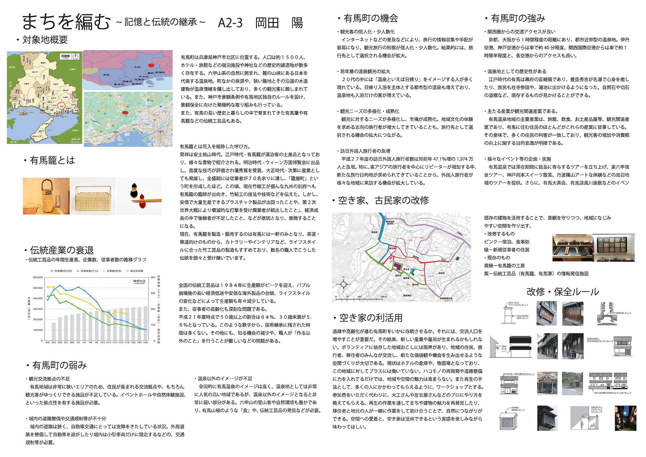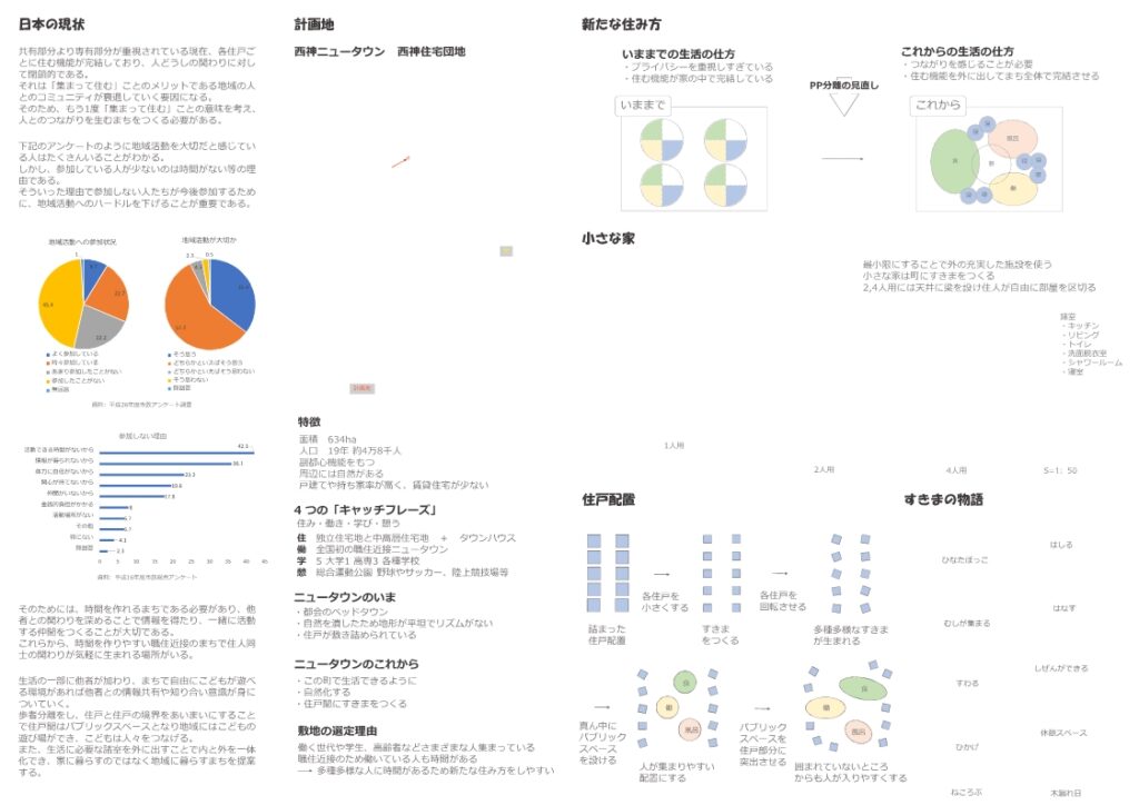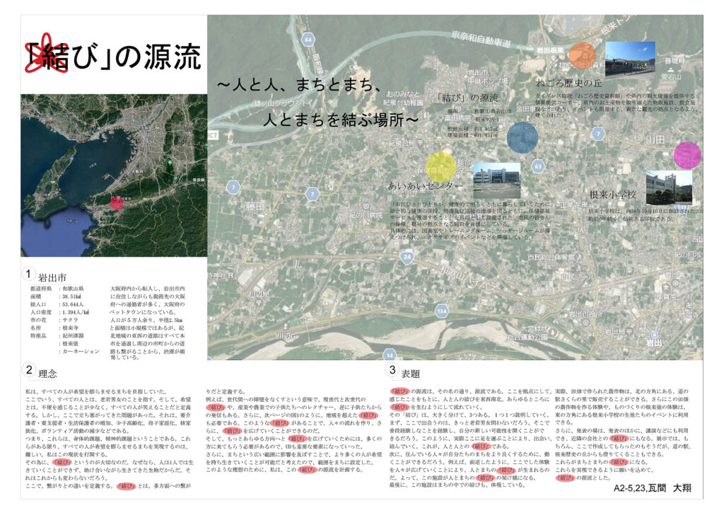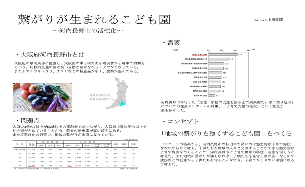 河内長野は彼の地元であり、地域の特質はよく理解していました。地域活性化、地域コミュニティは社会でも大きなテーマとなっていますが、実現しているのはまだまだ少ないのが現状です。そんな中でリアリティをもたせつつ、将来の夢を描くという両面を考えてくれたと思います。はじめはふんわりとした考えでしたが、後半から徐々に考えに芯がしっかりして最後までよくついてきてくれました。<吉田 秀栄>