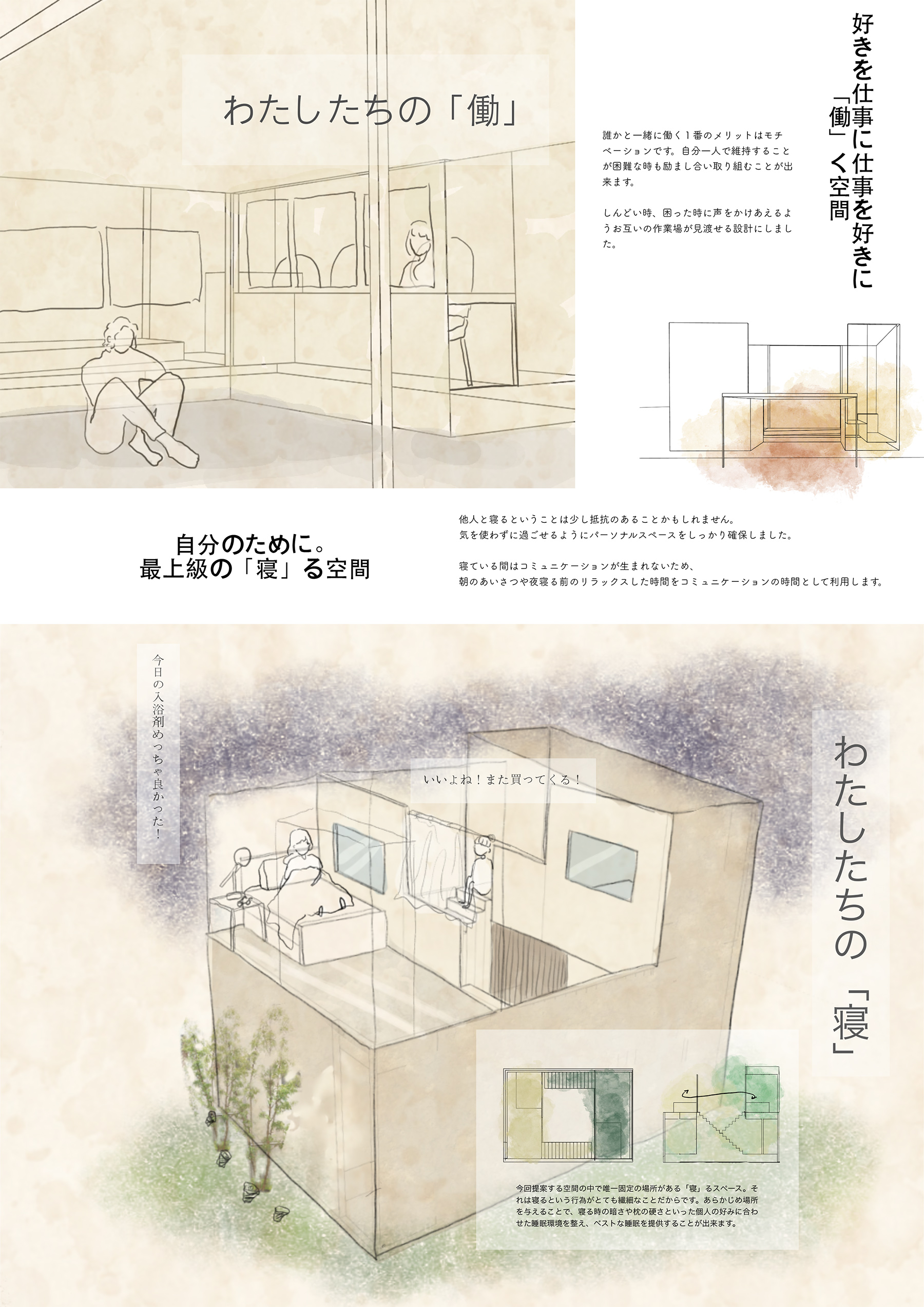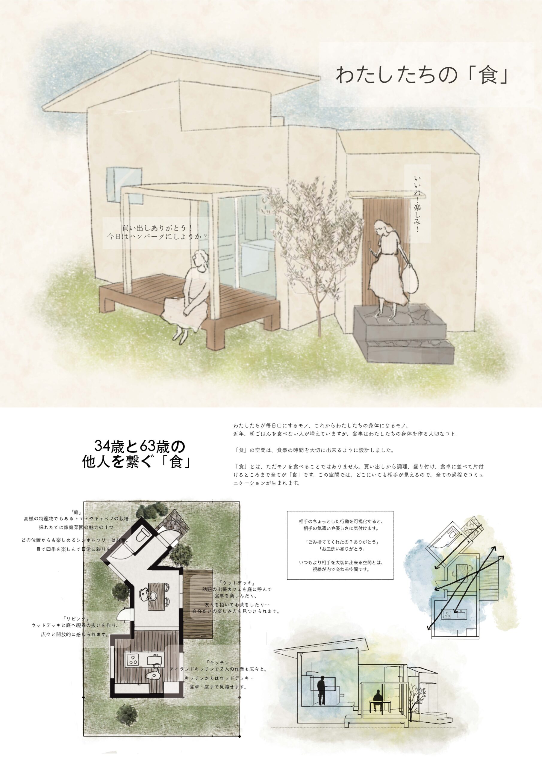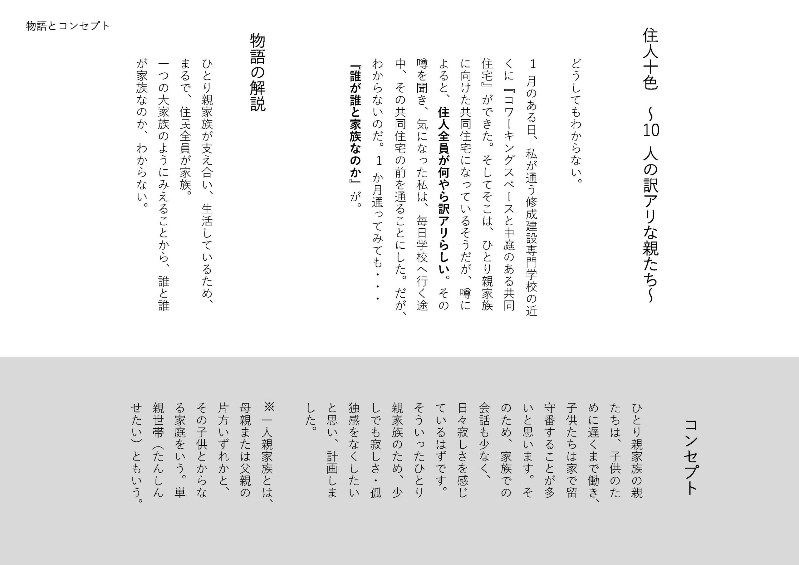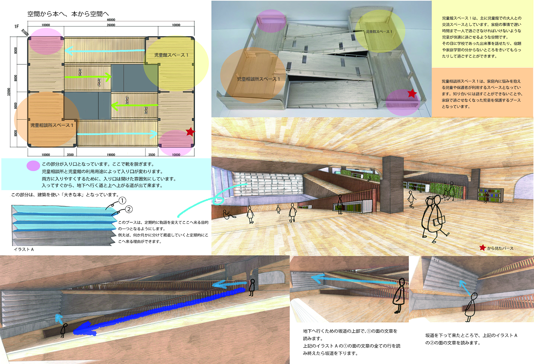 基本コースは敷地や設計条件が設定されておりその枠組みの中で計画していきますが、彼女の作品は基本コースの枠を飛び出しディプロマコースかのようなコンセプトワークに優れています。まるで実在するかのような人物設定がされていてヒューマニズムにあふれ、時には叙情的で悲哀にあふれその物語に引き込まれていく、そんな感覚に陥ります。ぜひ拝読していただき彼女の物語を体感してください。<眞野 サトル>