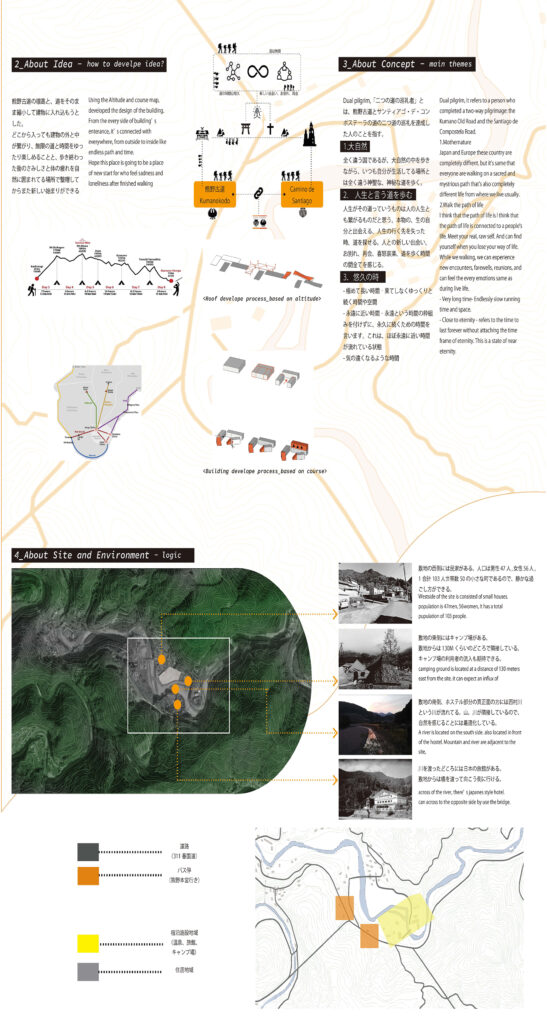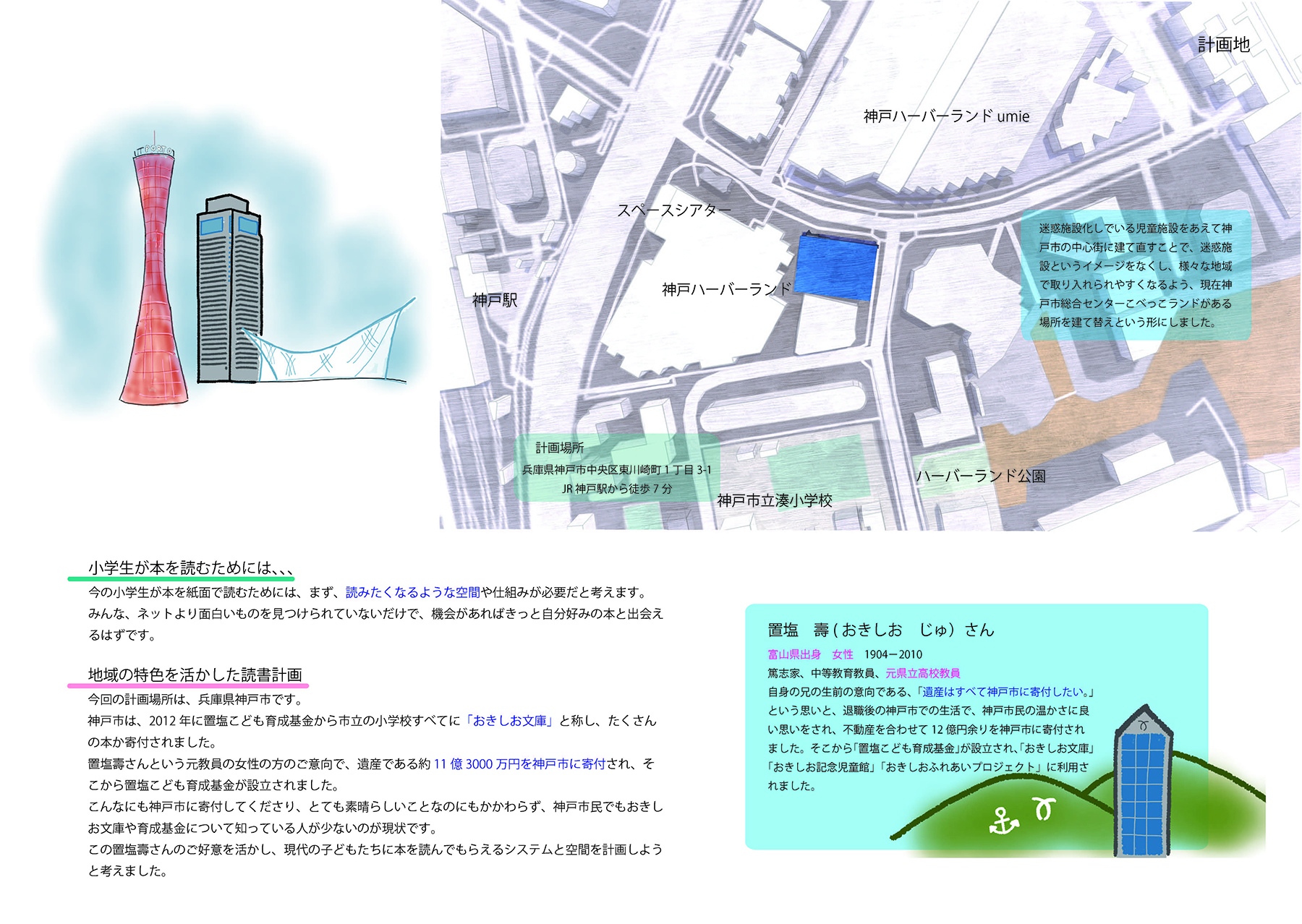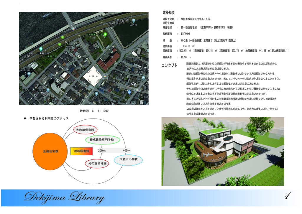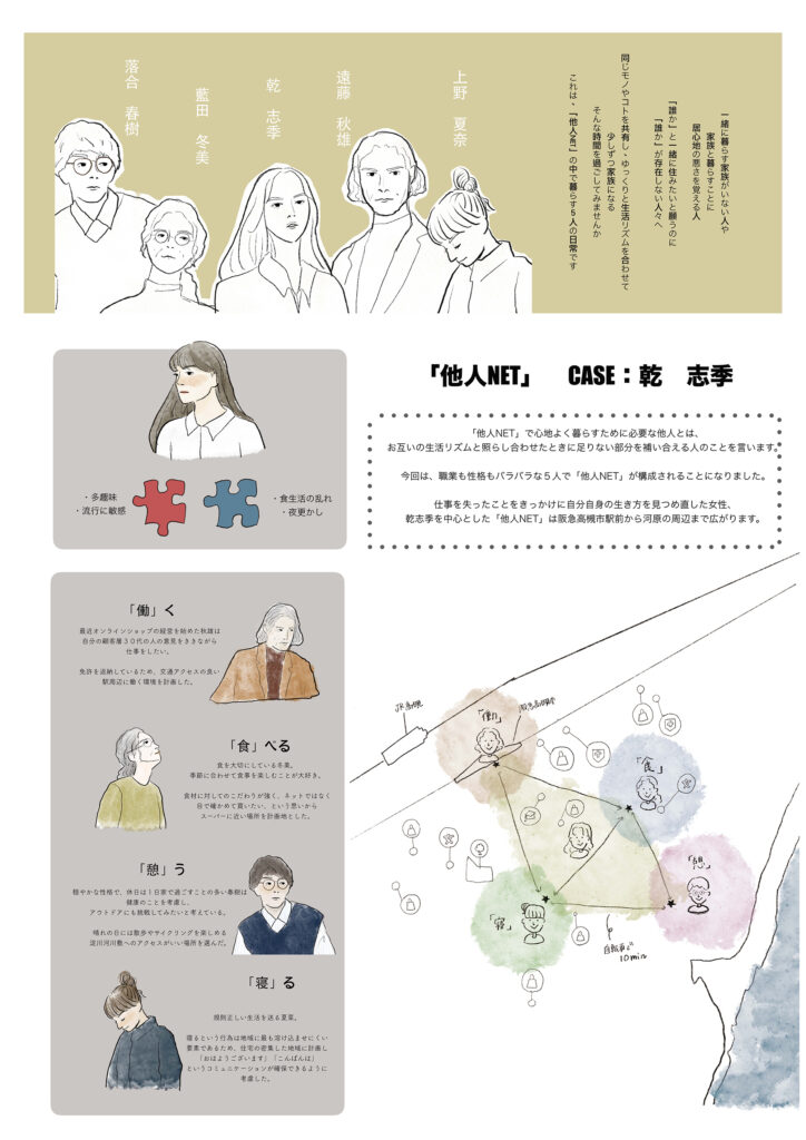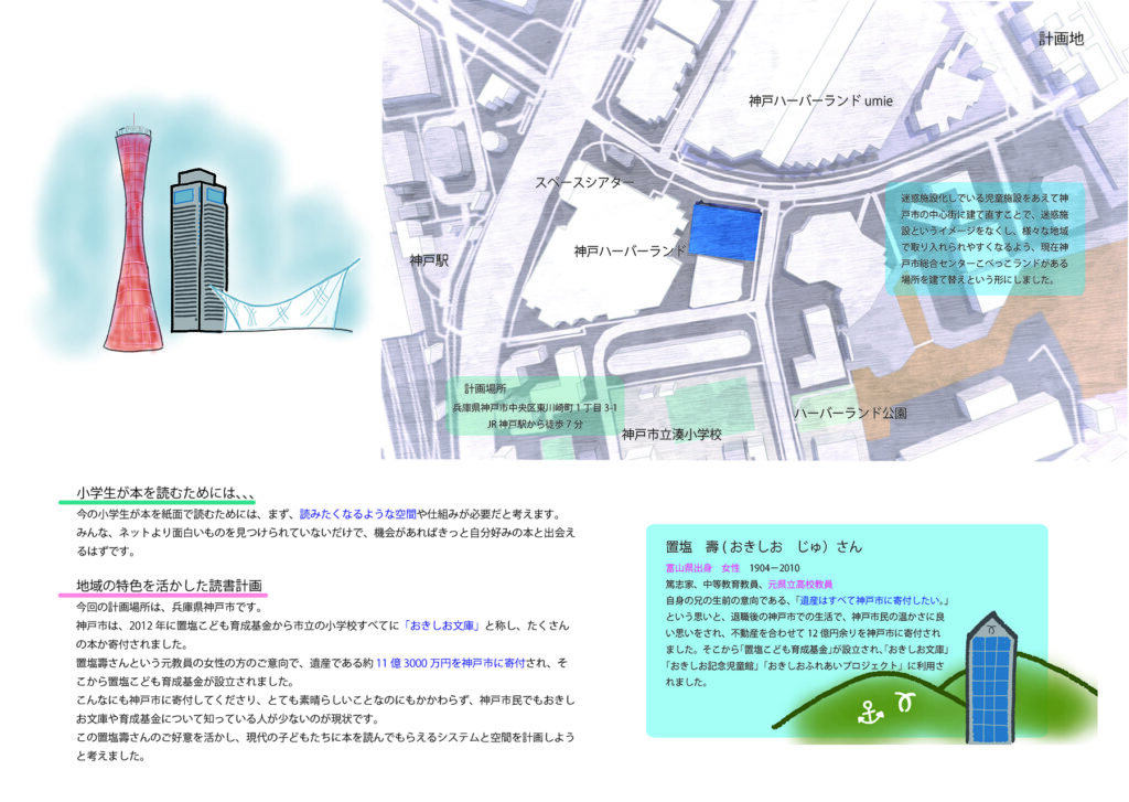 基本コースは敷地や設計条件が設定されておりその枠組みの中で計画していきますが、彼女の作品は基本コースの枠を飛び出しディプロマコースかのようなコンセプトワークに優れています。まるで実在するかのような人物設定がされていてヒューマニズムにあふれ、時には叙情的で悲哀にあふれその物語に引き込まれていく、そんな感覚に陥ります。ぜひ拝読していただき彼女の物語を体感してください。<眞野 サトル>