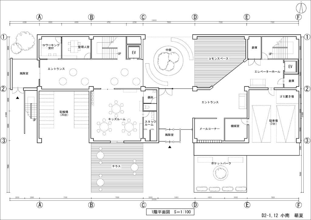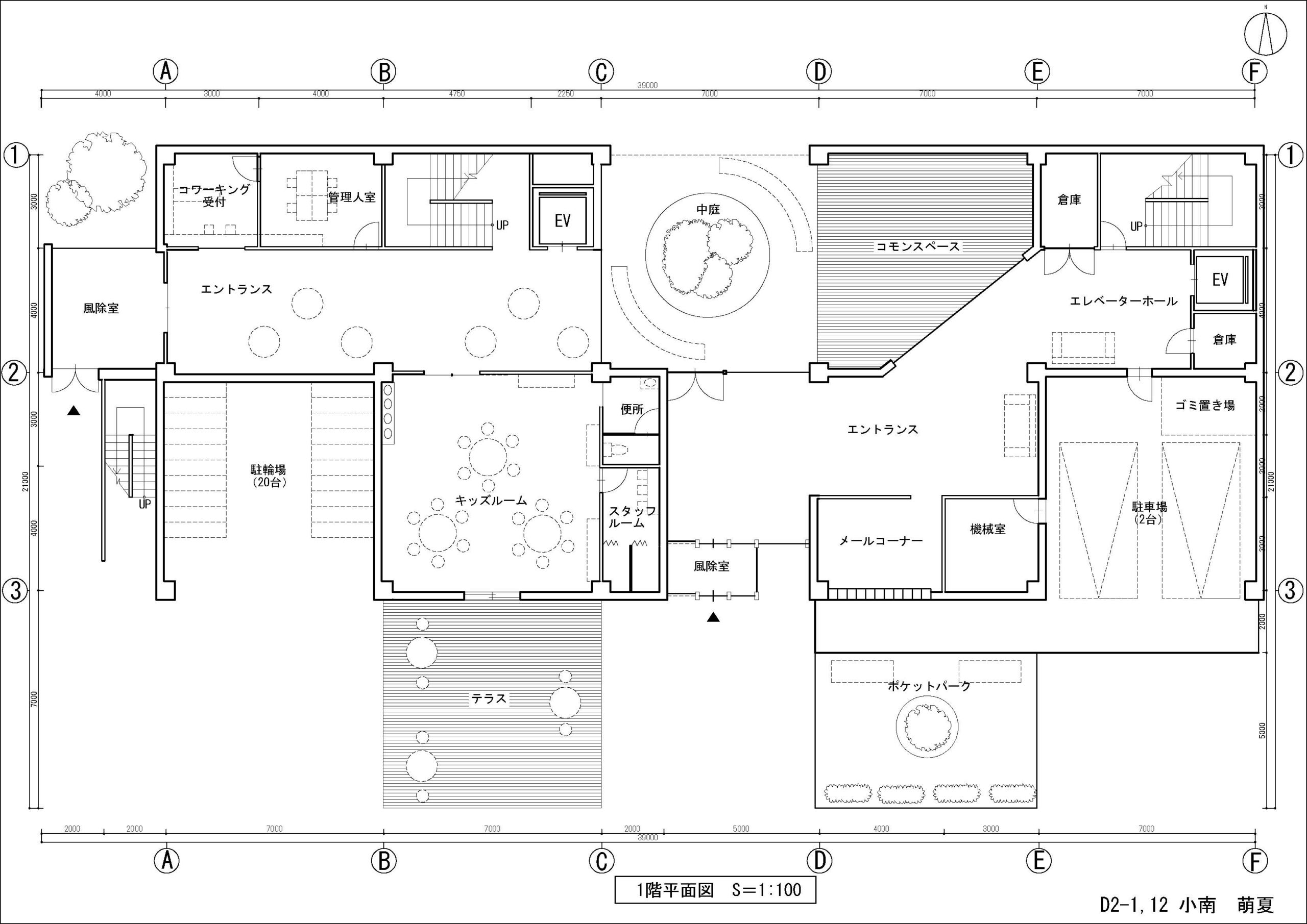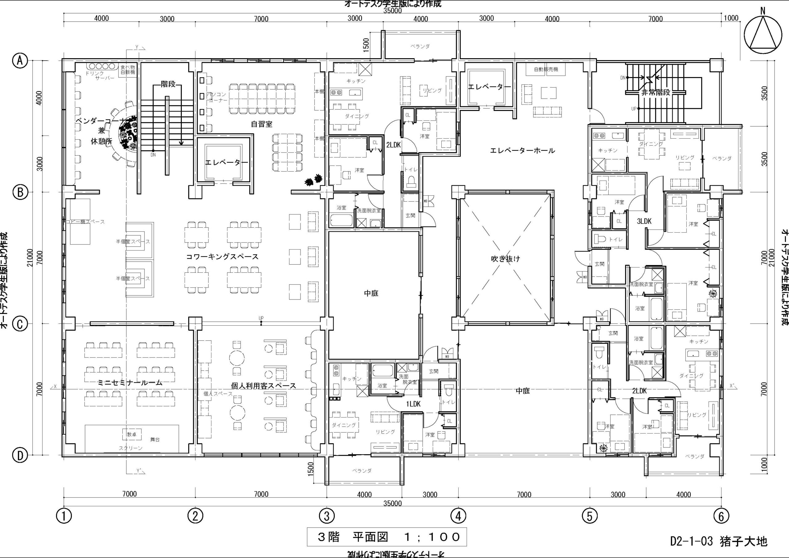 私は作品のタイトル「Urban Forest 〜都会で感じる自然〜」にもあるように自然を感じられる場所である中庭にこだわってこの建物を設計しました。なのでコワーキングスペースの小河が流れる中庭や共同住宅の用途の違う各階にある中庭に特徴があると思います。また図面の書き込みの多さや模型作りに力を入れてこの作品に取り組んだので是非そこを見てほしいです。