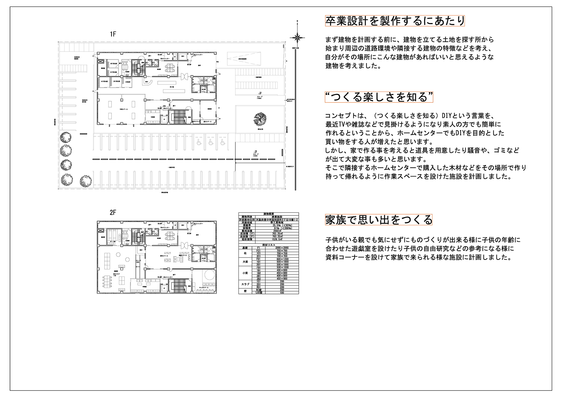 DIYという言葉が最近よく取り上げられ、誰でも簡単に作れるという事からホームセンターでもDIY目的の買い物客が増えてきました。しかしいざ作るとなると道具の用意や騒音、ゴミなどの問題があります。そこで計画敷地に隣接するホームセンターで購入した材料をこの施設で作り持って帰る。家族で気軽に立ち寄れる様、作業スペースの他に遊戯室も設け家族皆で楽しめる建物としました。