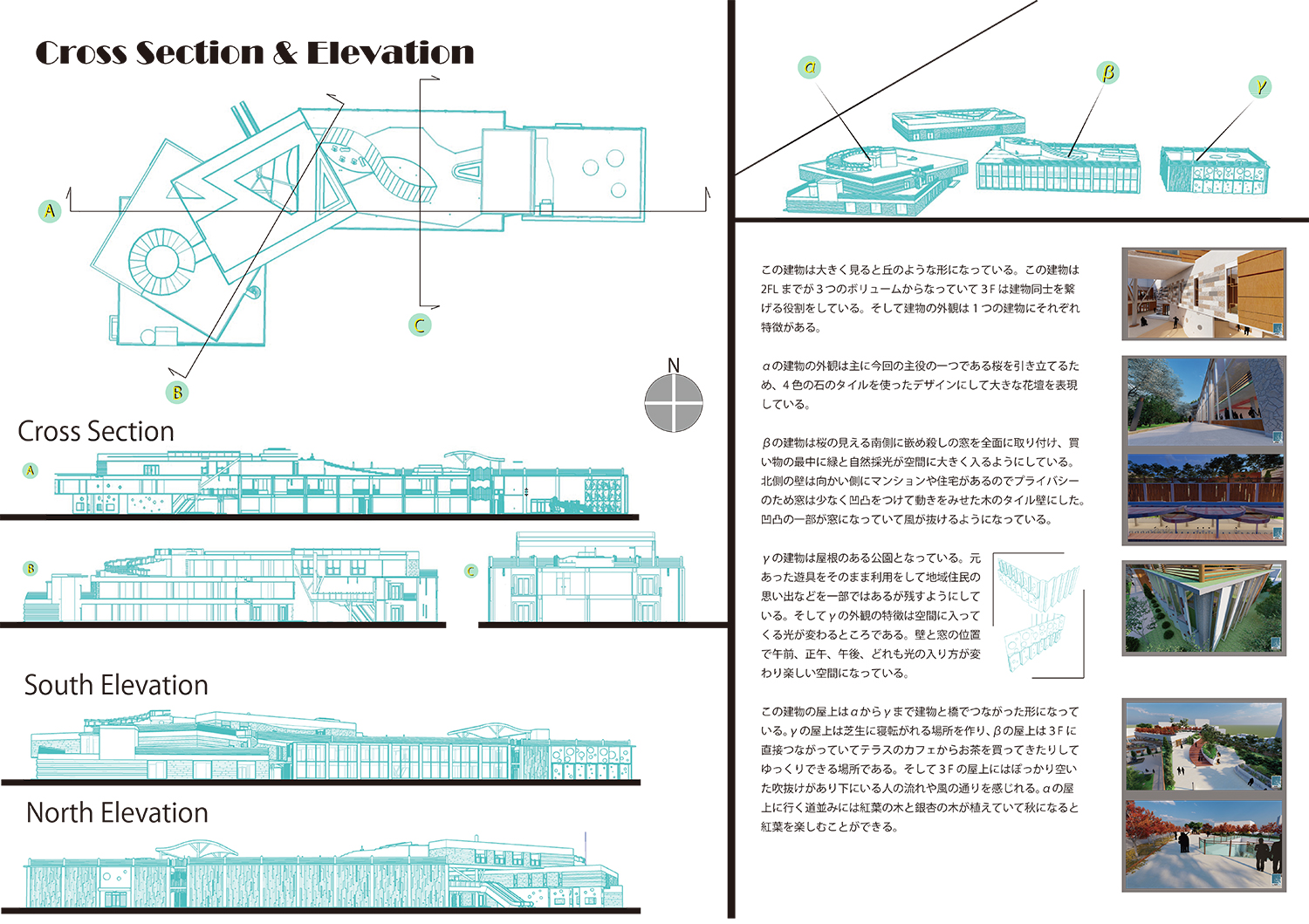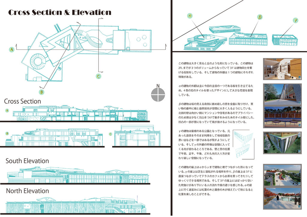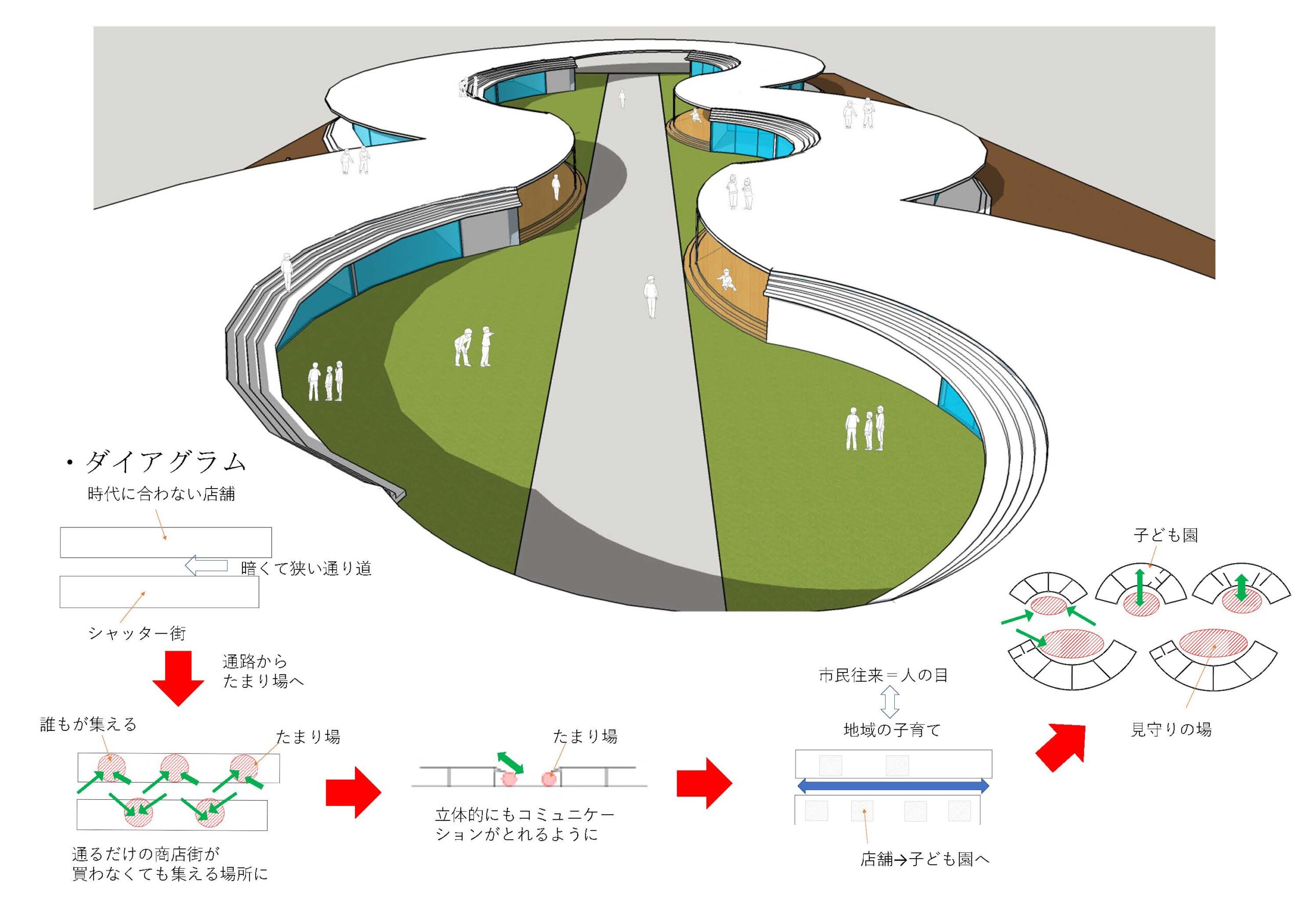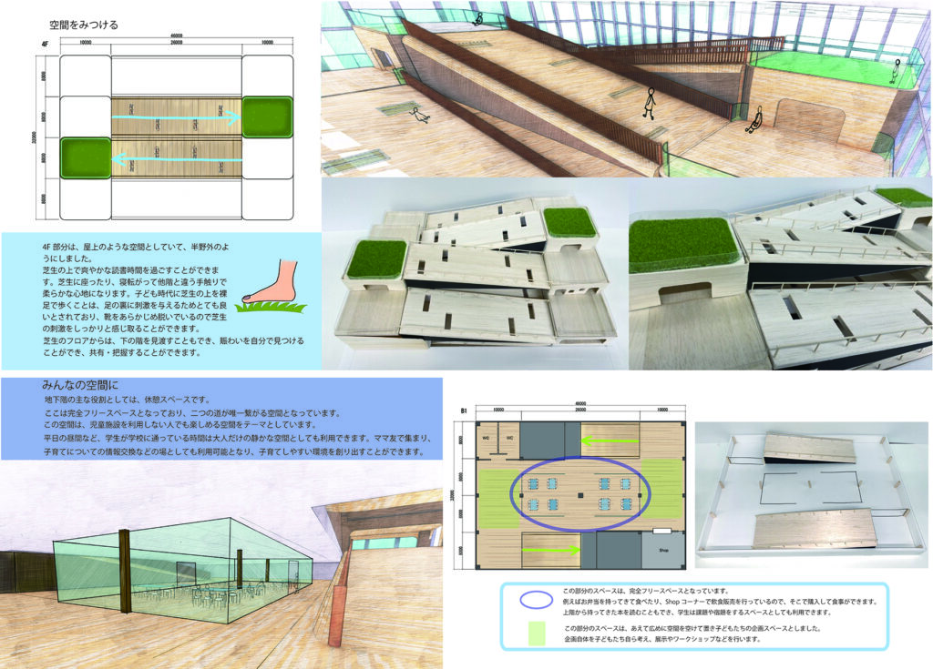 地域の人々の生活拠点となっているスーパーマーケットの敷地。土地の特性を活かしながら更なる地域活性を図る為にはどうすればよいか…相当悩んだようであるが地域の人々の目線に立ち、こんな建物があればいいな!という想いで描き上げていた。