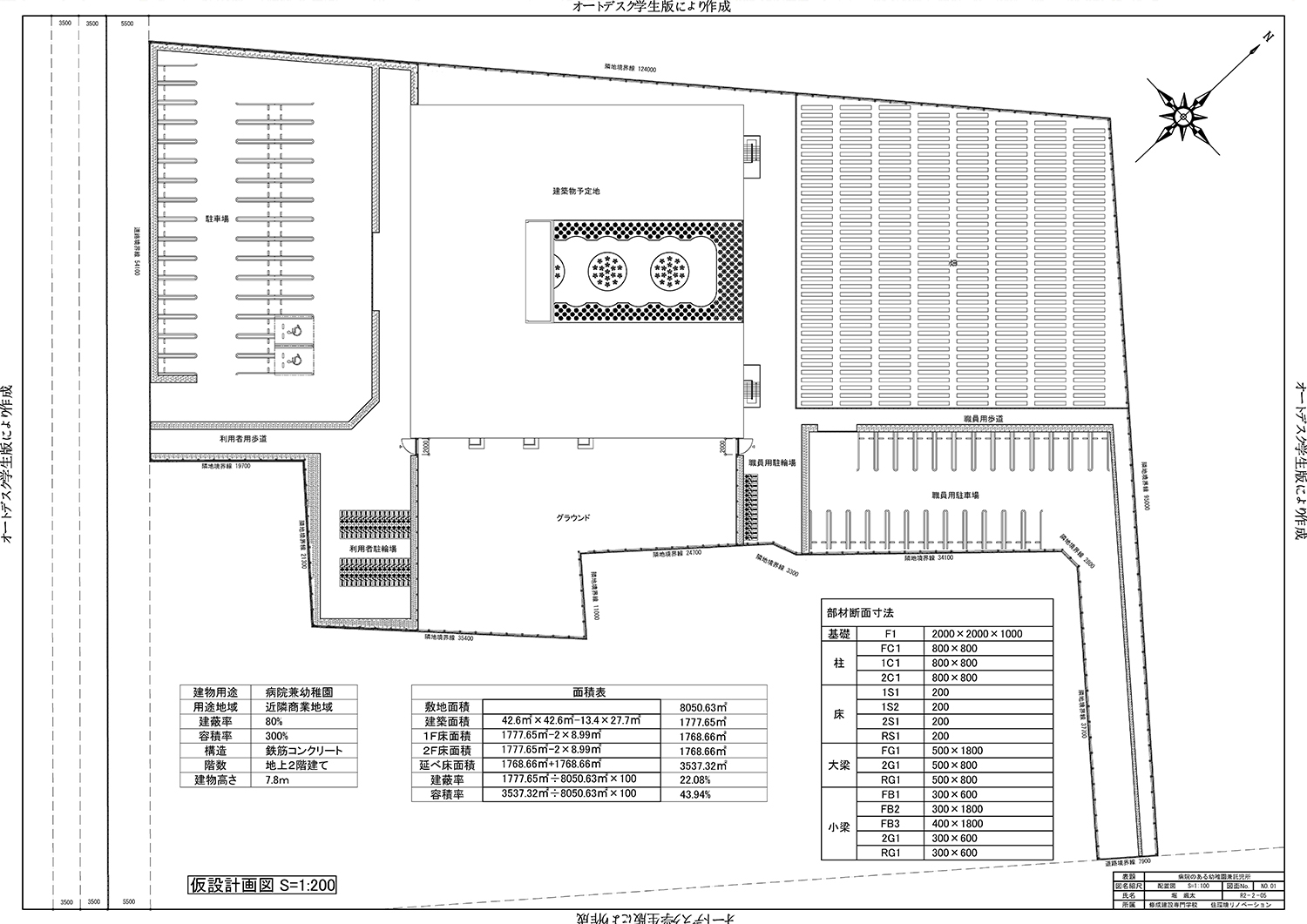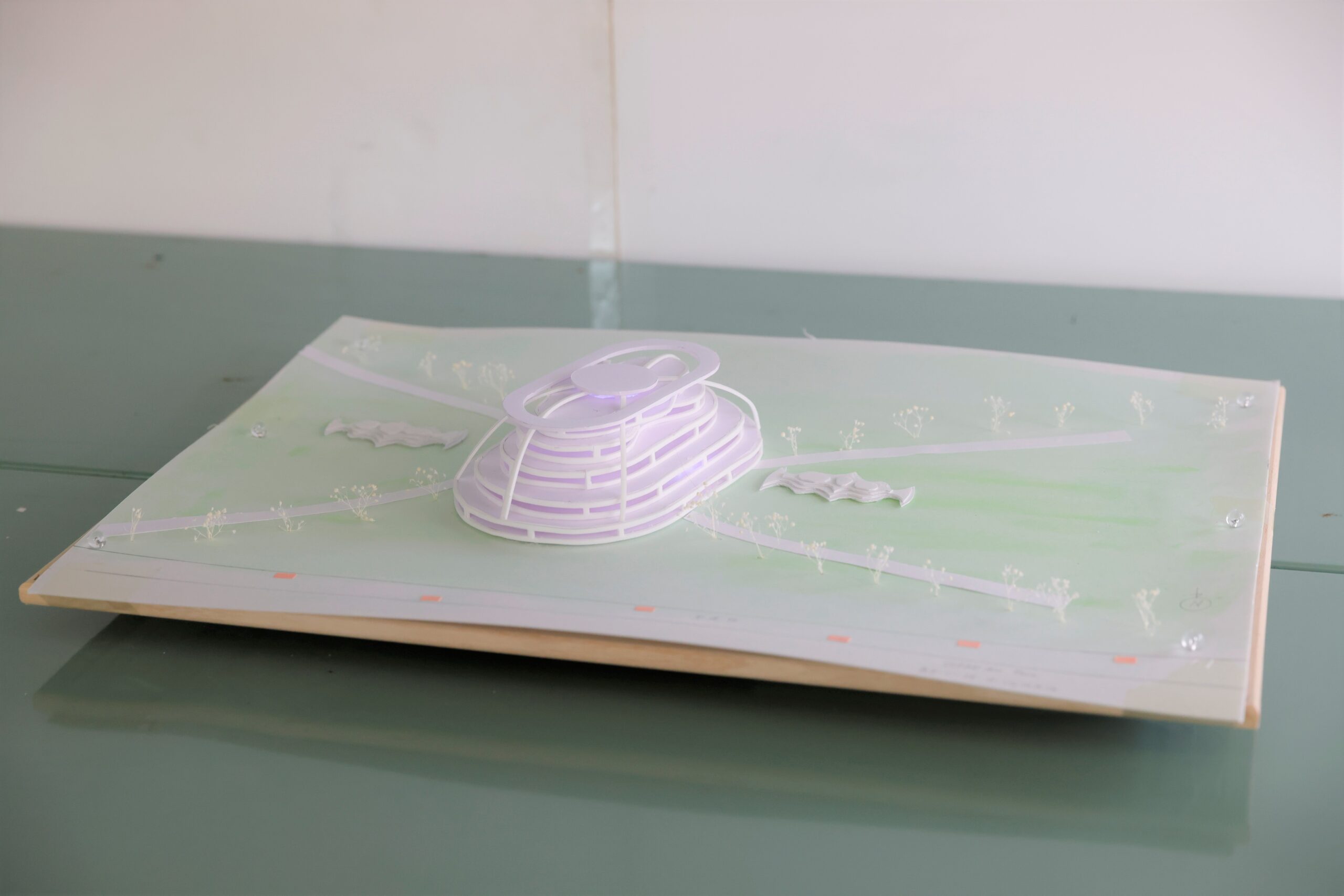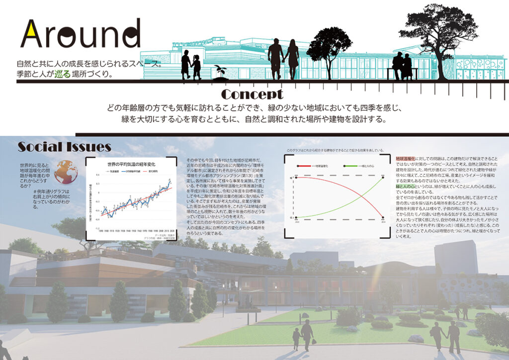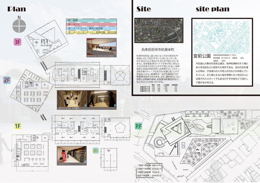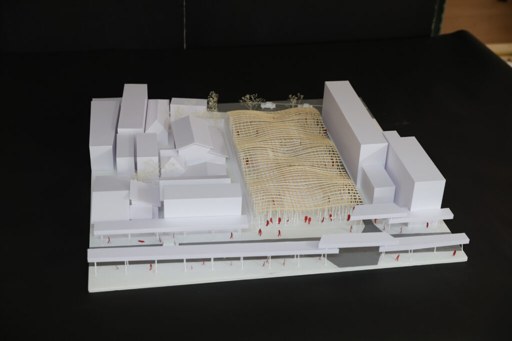 地域の人々の生活拠点となっているスーパーマーケットの敷地。土地の特性を活かしながら更なる地域活性を図る為にはどうすればよいか…相当悩んだようであるが地域の人々の目線に立ち、こんな建物があればいいな!という想いで描き上げていた。