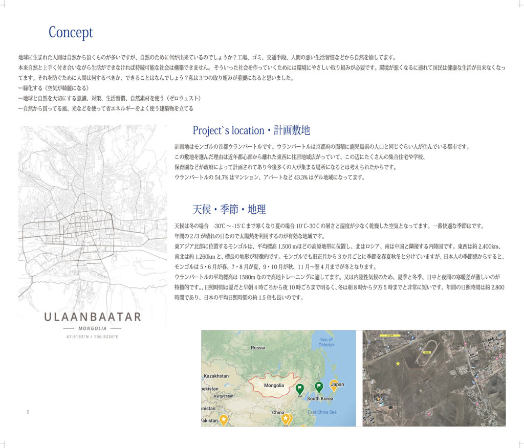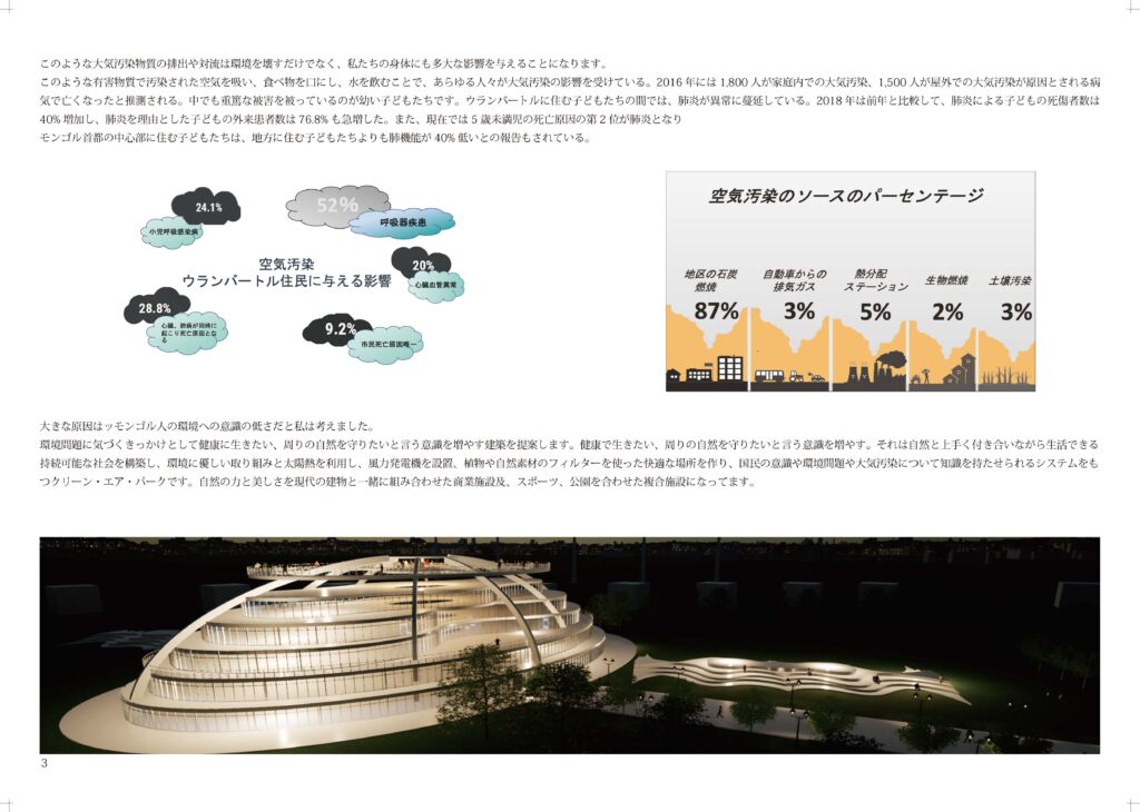 モンゴルにおいての大きな社会問題である空気汚染をテーマにどのようにアプローチすれば改善できるかを考えた作品である。国民性を考慮し、第一歩目は意識改革からといった環境問題への教育も兼ねているが、人が集まる空間に自然とそれが理解できる建築をすることで気づくことから受け入れ、行動させることがスムーズに流れると感じられる。「楽しむこと」のために「環境改善が必要」だということをうまく結びつけている。<岡崎 祐介>