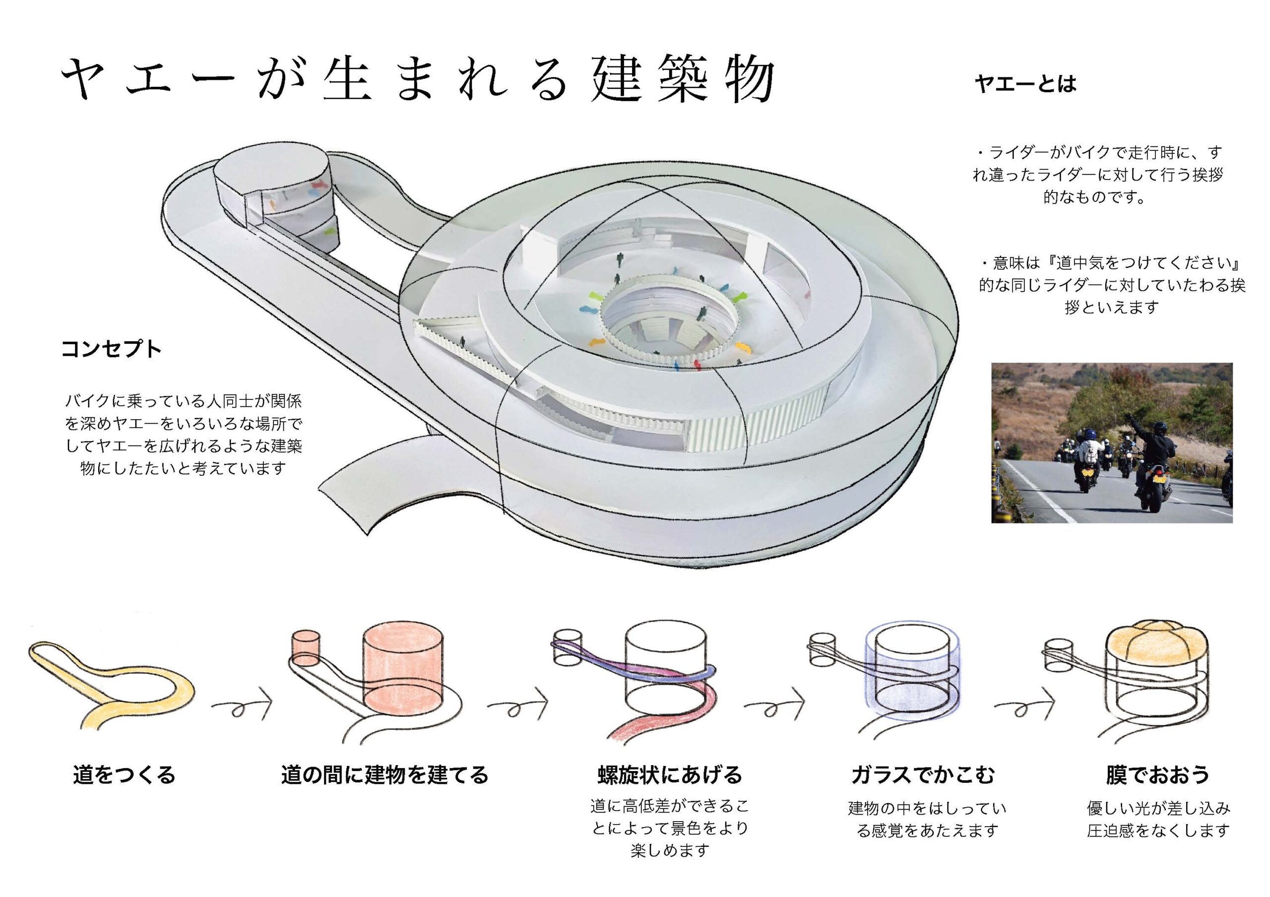 僕が設計したのはバイクに乗っている人たちが楽しめる場所です。ライダーには『ヤエー』と呼ばれるバイクに乗ている人の間だけで通じるあいさつがあり、それをテーマにし、その『ヤエー』を広げることにつながる建物を設計しました。どうゆう建物を設計したらバイクに乗ってる人が楽しめるのかを考え、工夫しました。模型の制作では曲面状のガラスをきれいに仕上げるところには苦労をしました。