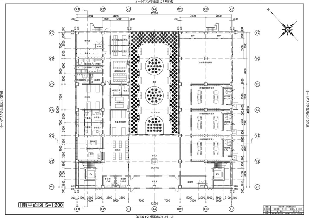自分がもし通うなら…?と想像しながら計画しました。子供の目線になって床に遊べるような模様を作った所が私のこだわりの一つです。この設計を通して施設を利用する人の立場になって考えることが一番重要だということを学び、自分がしたい建物や見た目だけ良い建物にこだわるのではなく、視野を広くして利用者のニーズに応えながらこだわりを持って設計する事が一番大事なのだと気づけました。