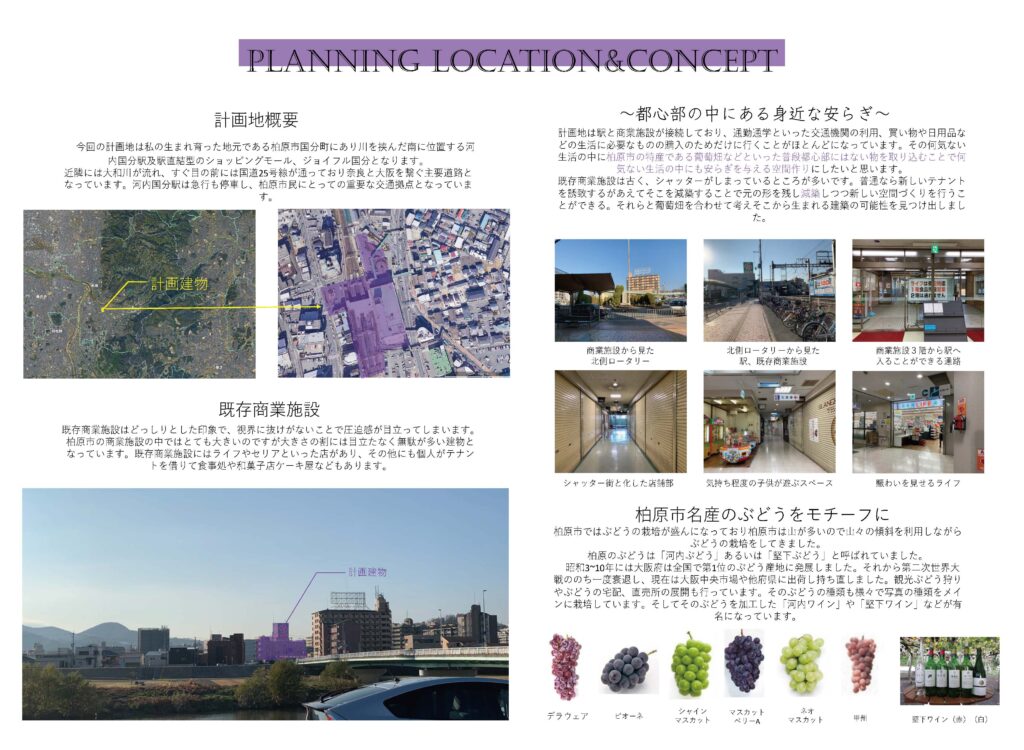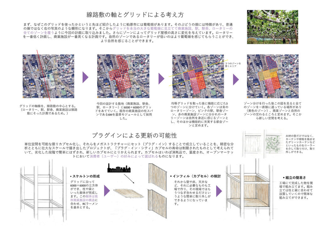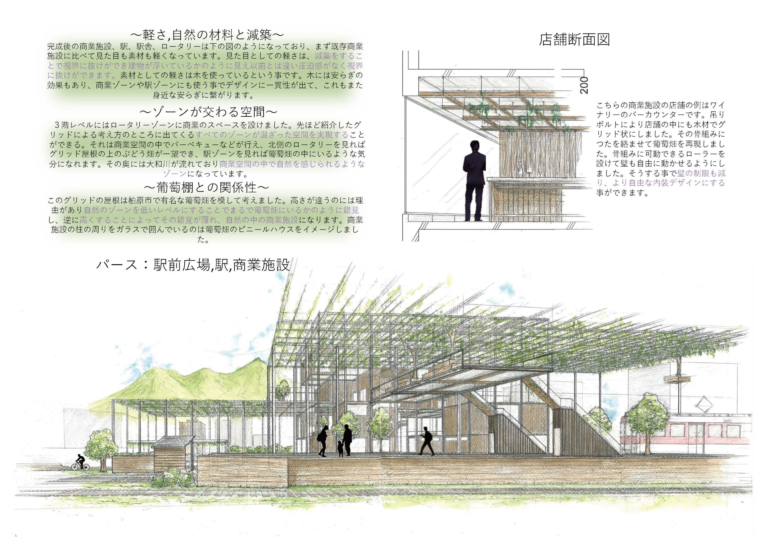 活気がなくなってしまった地元柏原市の駅前空間を地域住民の方の安らぎの場となるような計画をしました。その要素は3つあり、1つ目は既存商業施設の躯体を残して増築ではなく減築をすること。2つ目は柏原市の特産物である葡萄畑をもとにグリッドを考えたこと。3つ目はプラグインの考えを取り入れ、