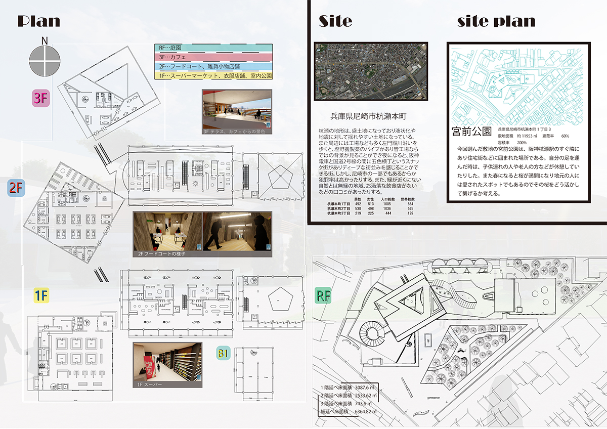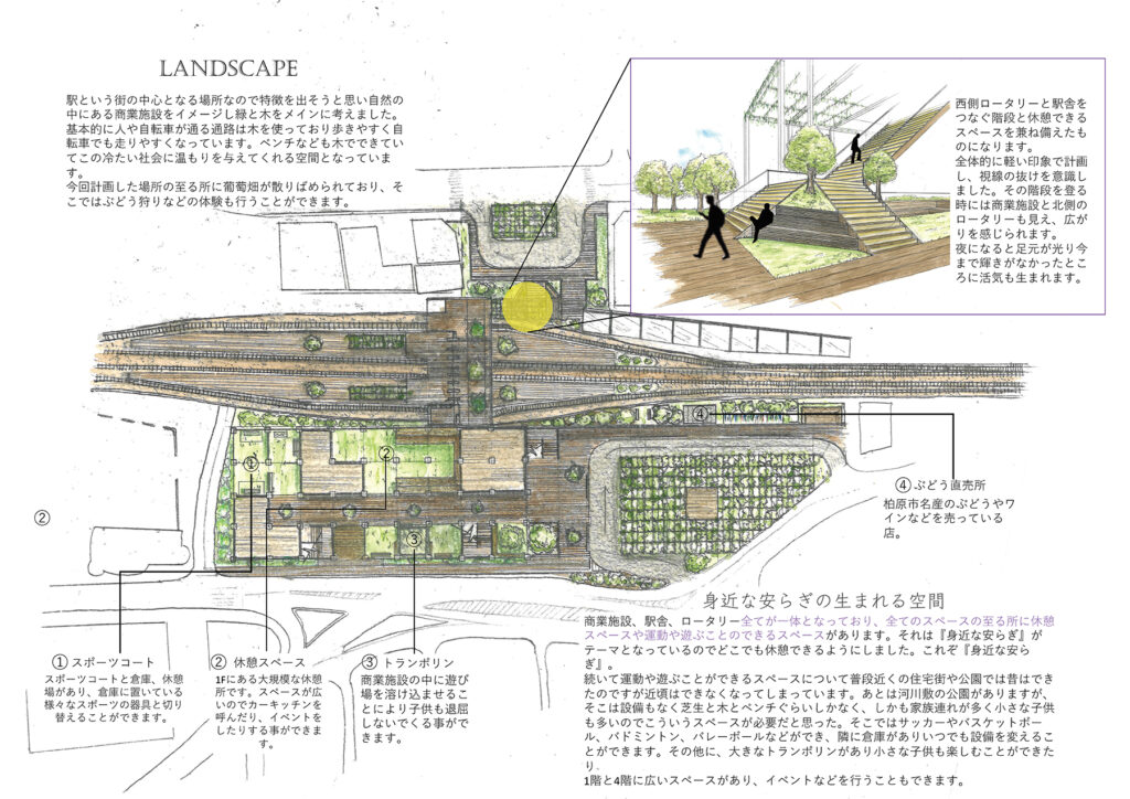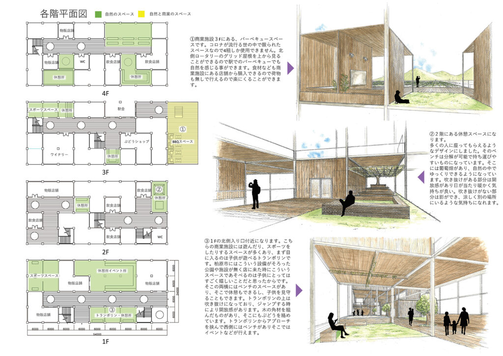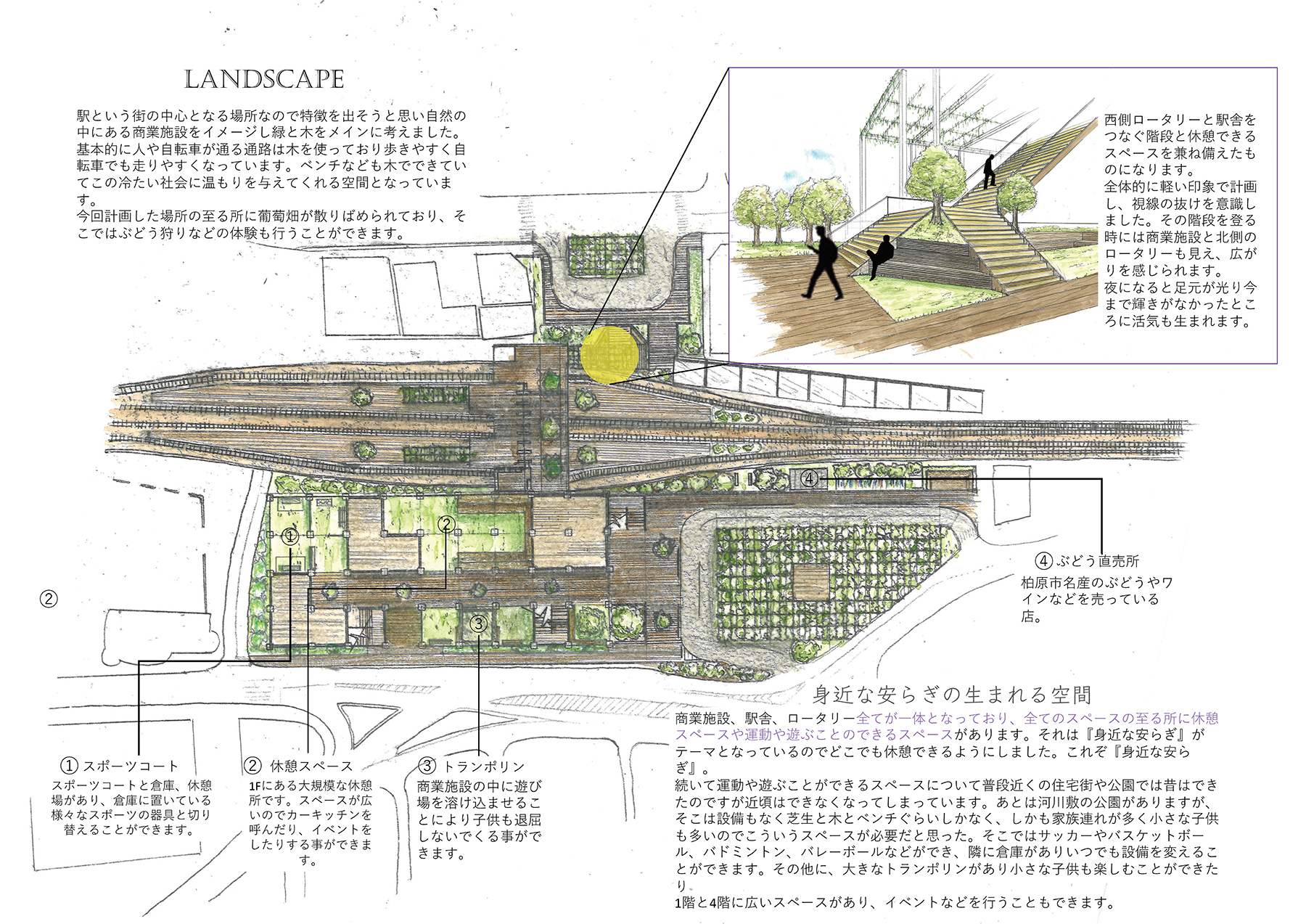 活気がなくなってしまった地元柏原市の駅前空間を地域住民の方の安らぎの場となるような計画をしました。その要素は3つあり、1つ目は既存商業施設の躯体を残して増築ではなく減築をすること。2つ目は柏原市の特産物である葡萄畑をもとにグリッドを考えたこと。3つ目はプラグインの考えを取り入れ、