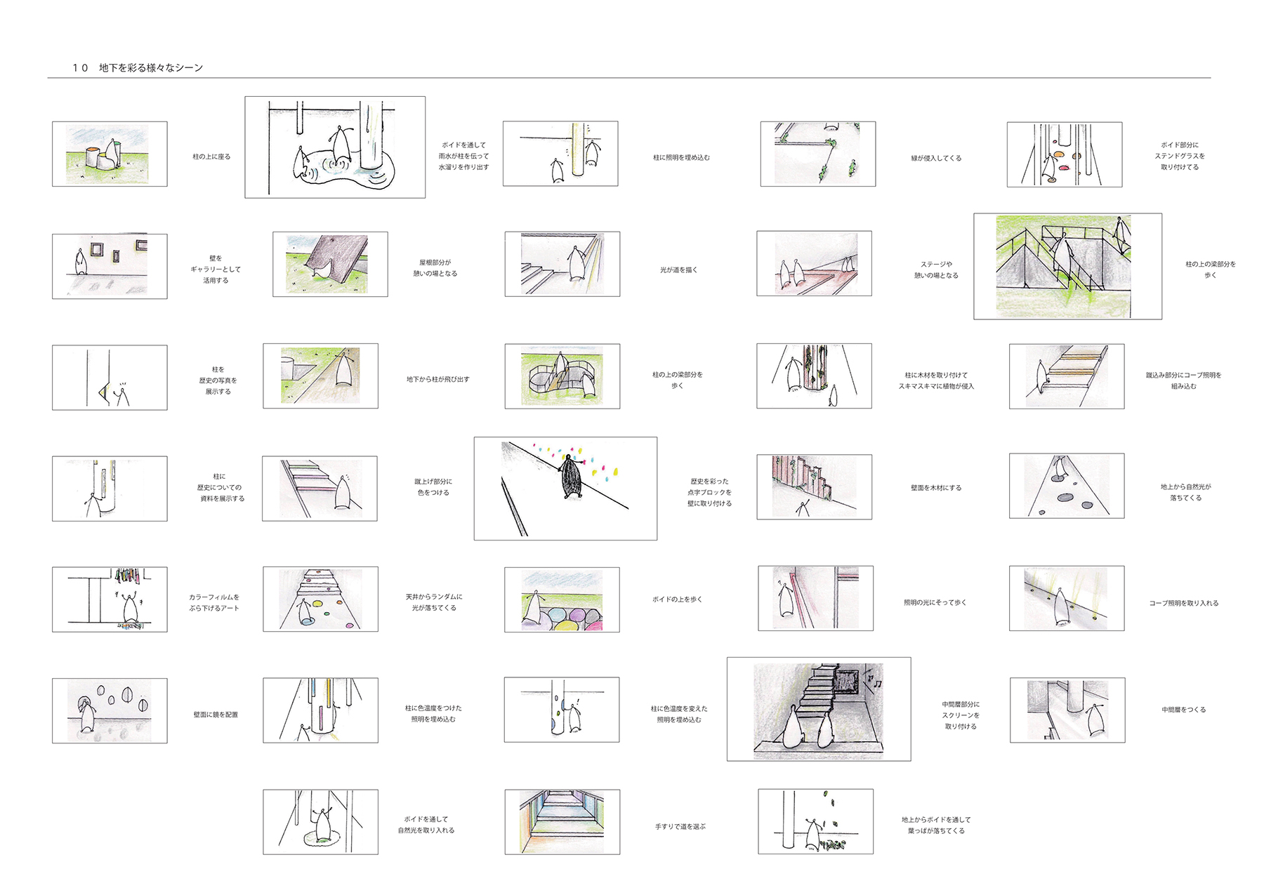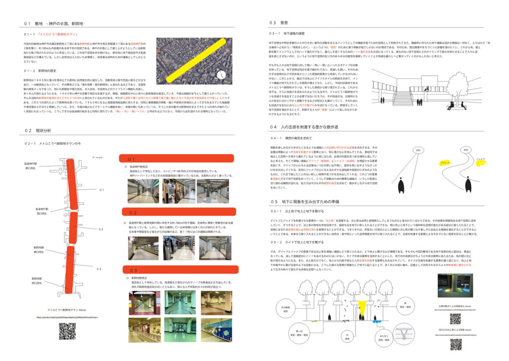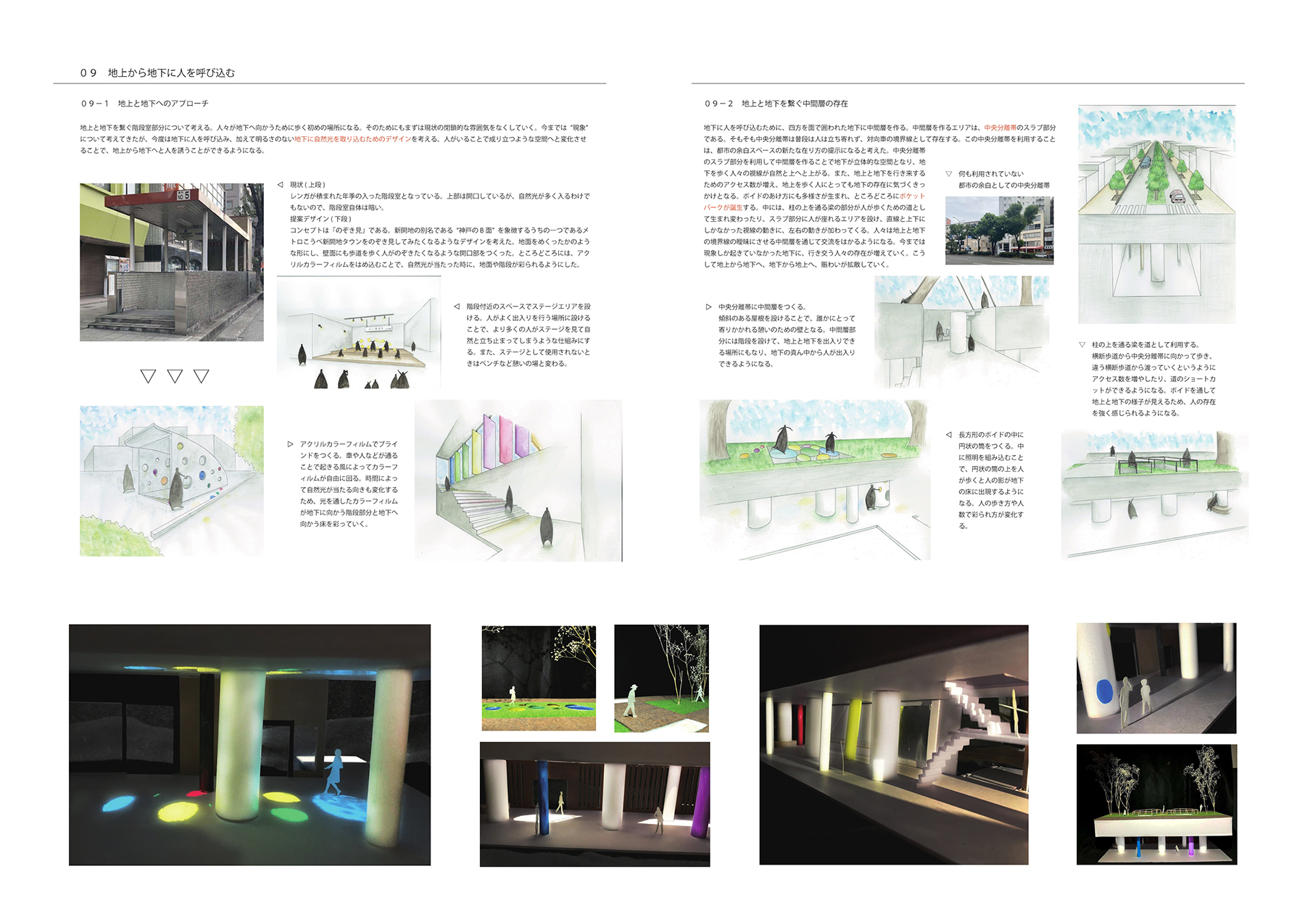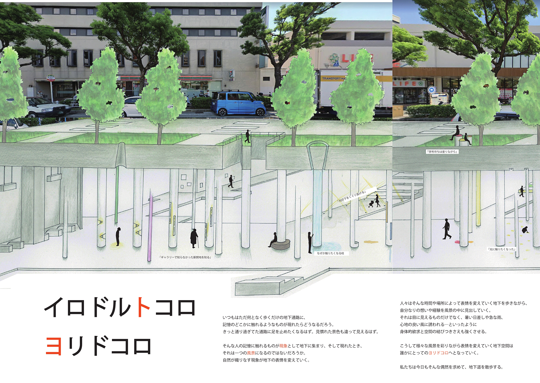 地下空間の持つネガティブな側面を空間演出により行きたくなる場所に変換していく計画です。地上部に取り残された中央分離帯を地下空間との接続場所として意味を持たせ、地上(自然)環境を地下に取入れる装置として様々なヴォイドを配置しています。ヴォイドを通して地下に作用する光・風・雨・音など無数の要素は約700mにわたる単調な地下空間に様々な現象を生み出し連続する変化による地下道の新たな魅力創出の可能性を感じさせてくれる作品となっています。<阪本 剛史>