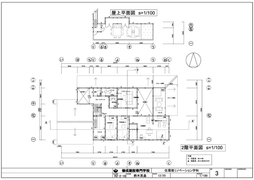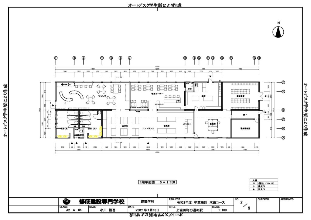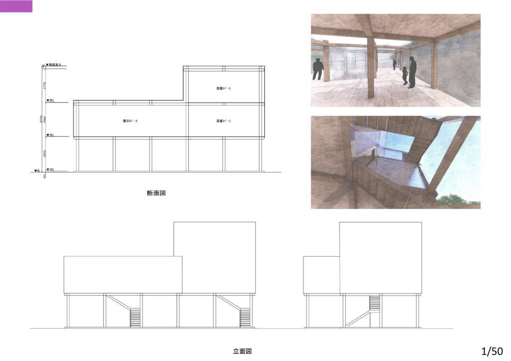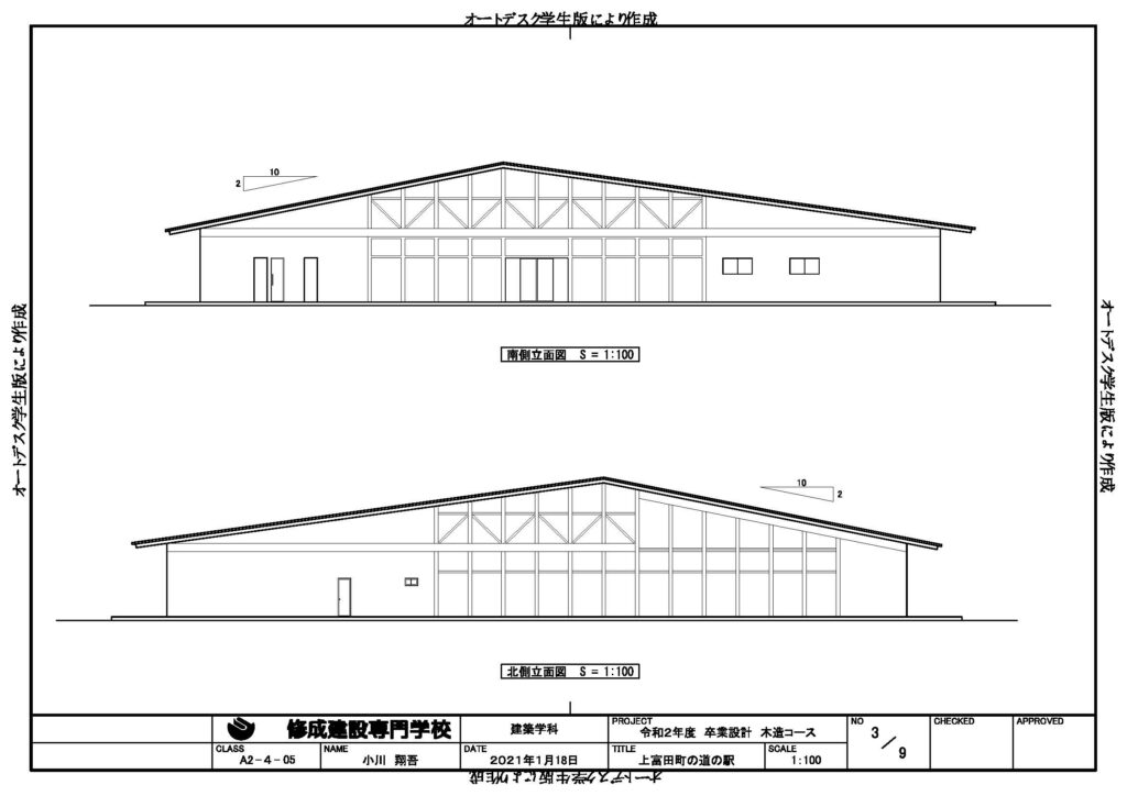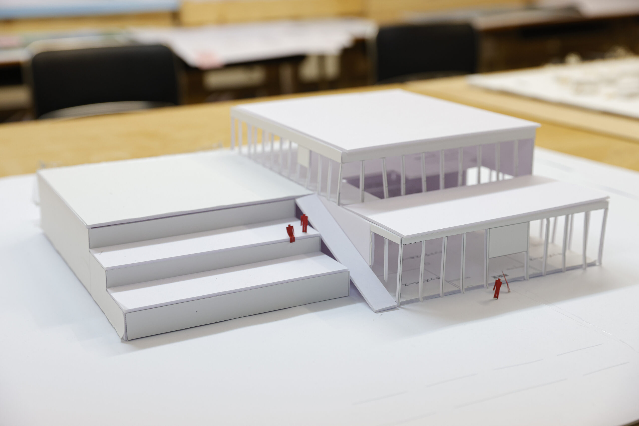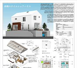 自身ゆかりのある地を選定し、地域が抱える問題を解消するために取り組んだ課題です。木造による作品でシンプルな平面構成と地域に溶け込む外観が特徴の作品となりました。構造の理解や材料の選定など本科2年間の学習の集大成として形にできたと感じます。模型も成果物として短い時間で丁寧に仕上げ、社会に出る前の準備として有意義だったのではないでしょうか。今後の活躍が楽しみです。<上野 祐紀>