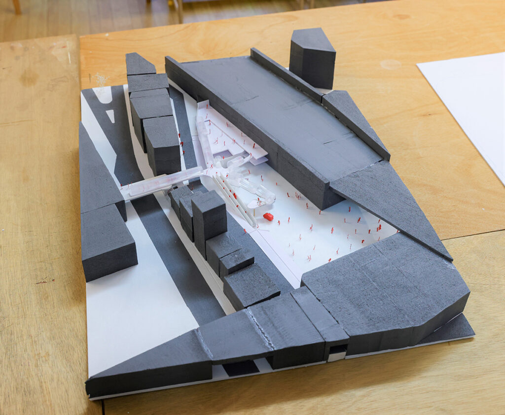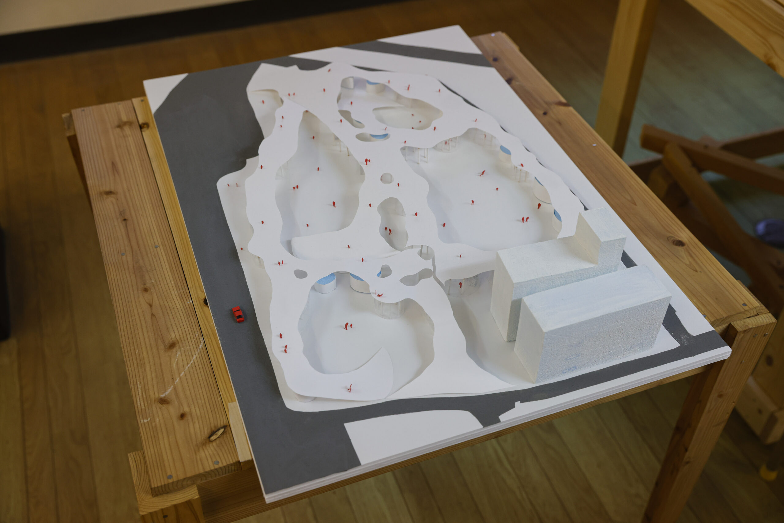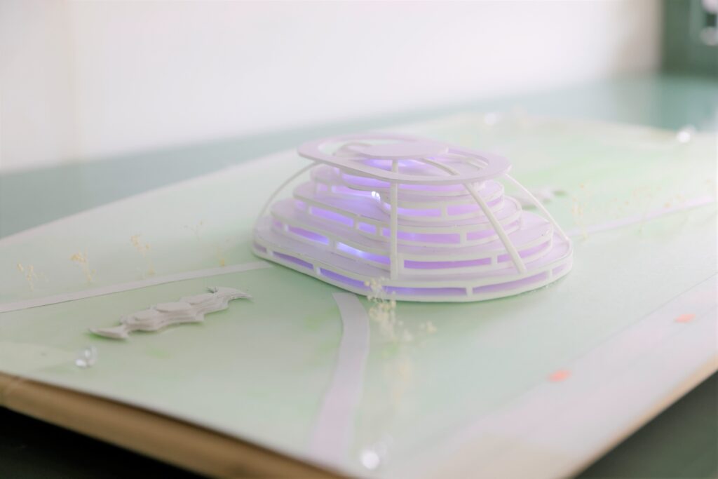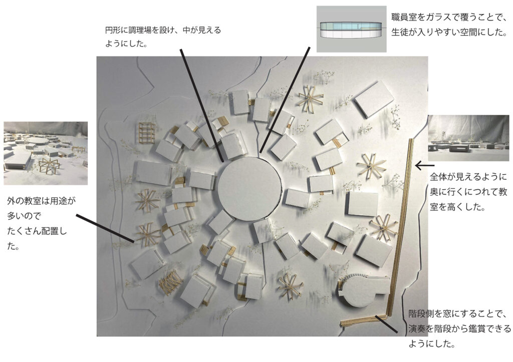 彼は、幼少期の辛い経験から今回の卒業設計のテーマが決まりました。 自分で様々な事を調べていく内に、思いが広がり3つの異なる用途施設を一つの建物の中に表現してくれました。 制作中は、彼の長所である探求心が強く好奇心旺盛な部分が顔を覗かせ、様々な事を調べた事を形にしていく姿に彼の成長を感じられました。 大規模な建物でしたが、真面目で努力家の彼らしい作品が出来上がったと思います。<井上 嘉亮>