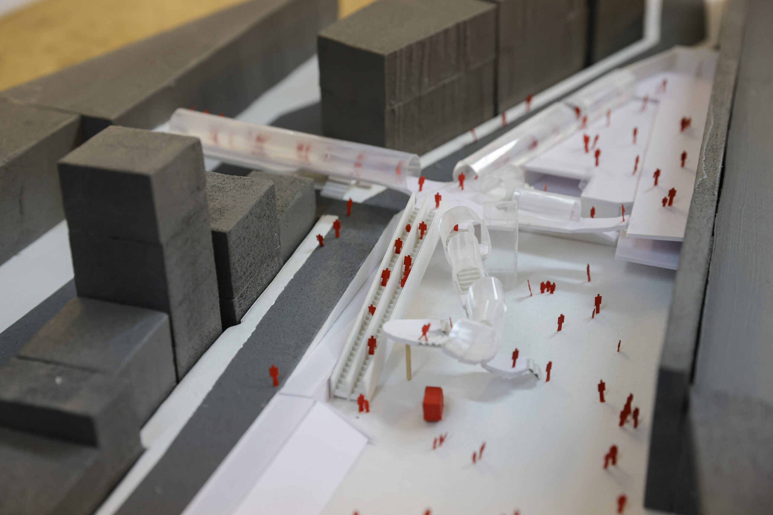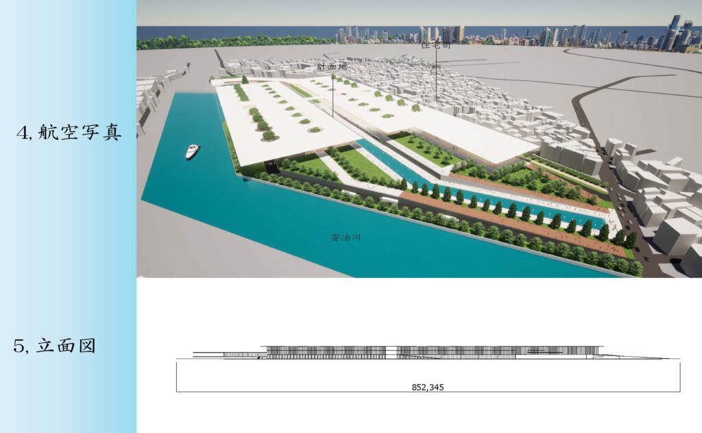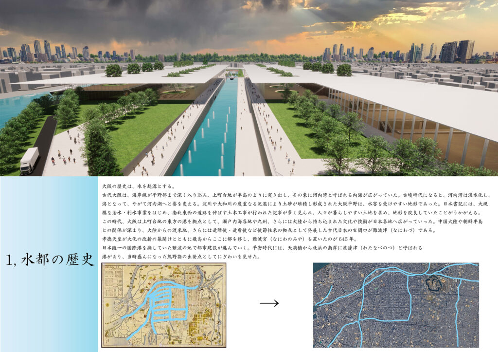 昔、魅力的であった水都大阪の河川は、今となっては河川の減少により、魅力がなくなりつつあります。そこで私は、歴史ある河川付近で大阪の水都を復活させようと思い、水都復活計画案を出しました。最初は敷地が大きくて、人と車の動線や用途施設を計画するのがとても難しかったですけど、何とか計画できたので、とても嬉しかったです。本当にここまで頑張ってきてよかったと実感しました。