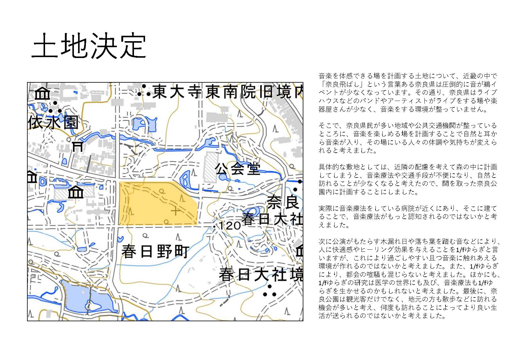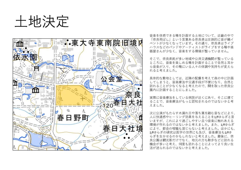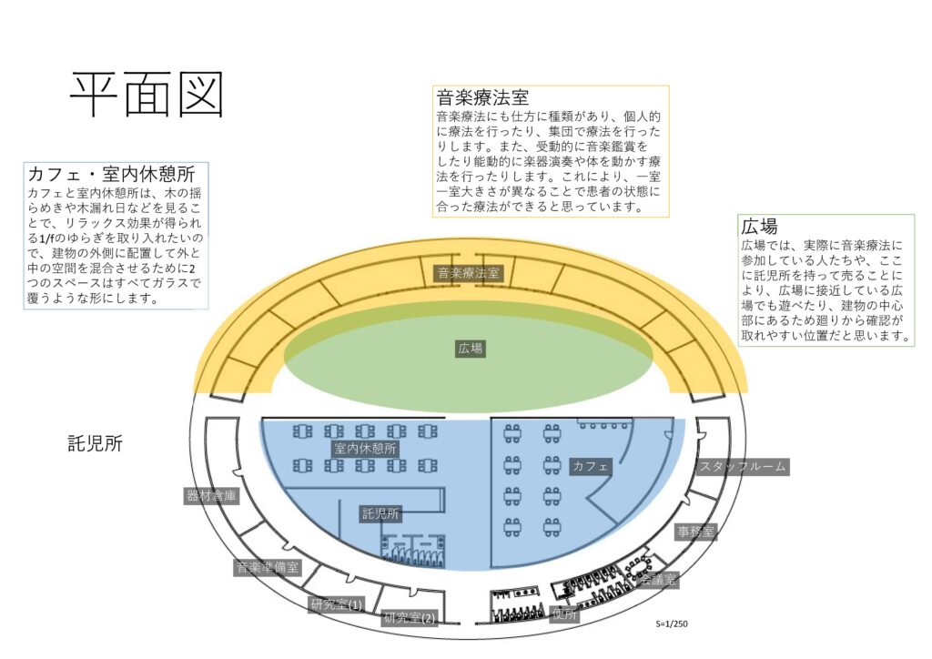 私はこの卒業設計で大きなテーマとして、音楽療法がもたらす効果について考えました。音楽を聴く、または演奏するだけで治療効果につながり、健全な人で癒しや安心感を与えてくれる音の素晴らしさを知っていただきたく、周りの環境等を沢山考え、音楽療法が行える建物を計画しました。また、周りの人達にも音楽をより一層楽しんでもらえるよう、気軽に休める休憩場としても利用できるよう計画しました。