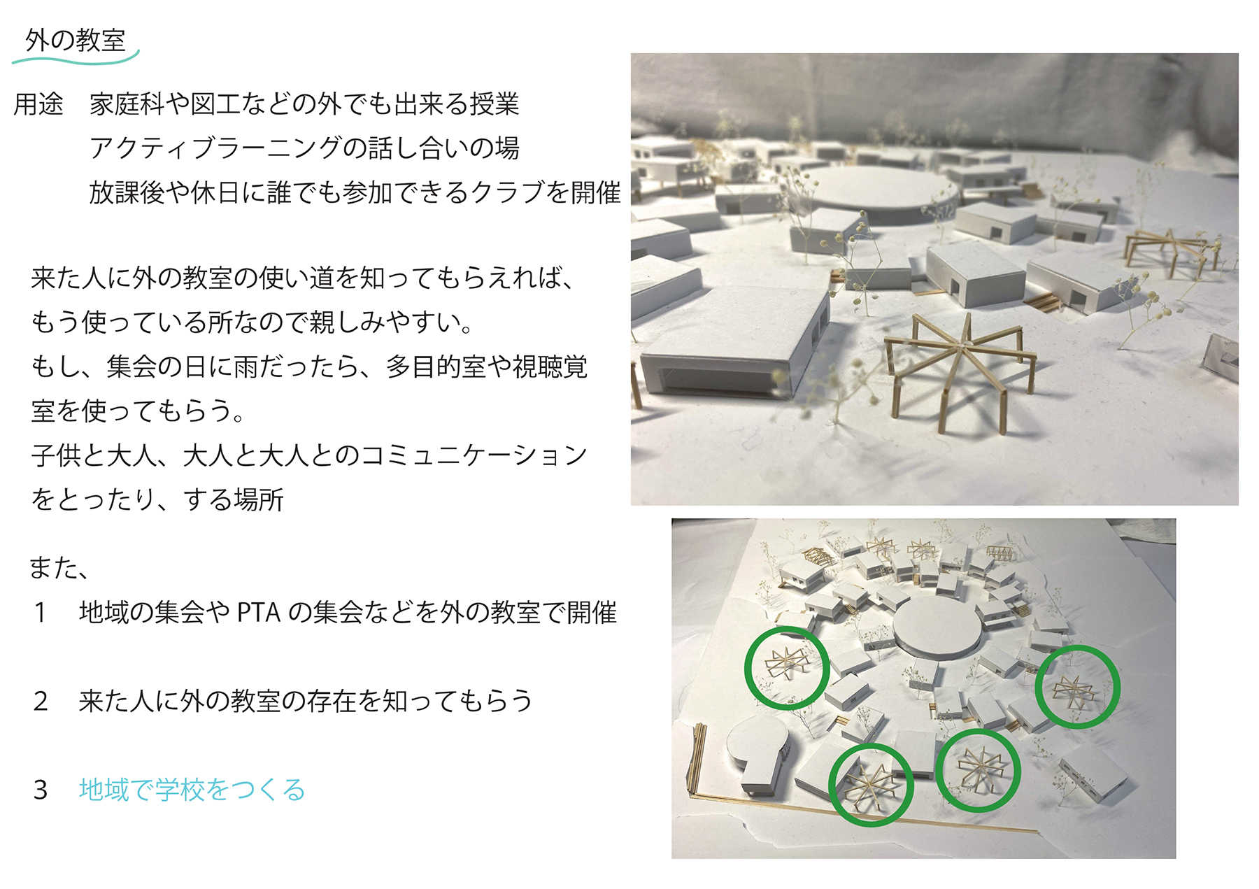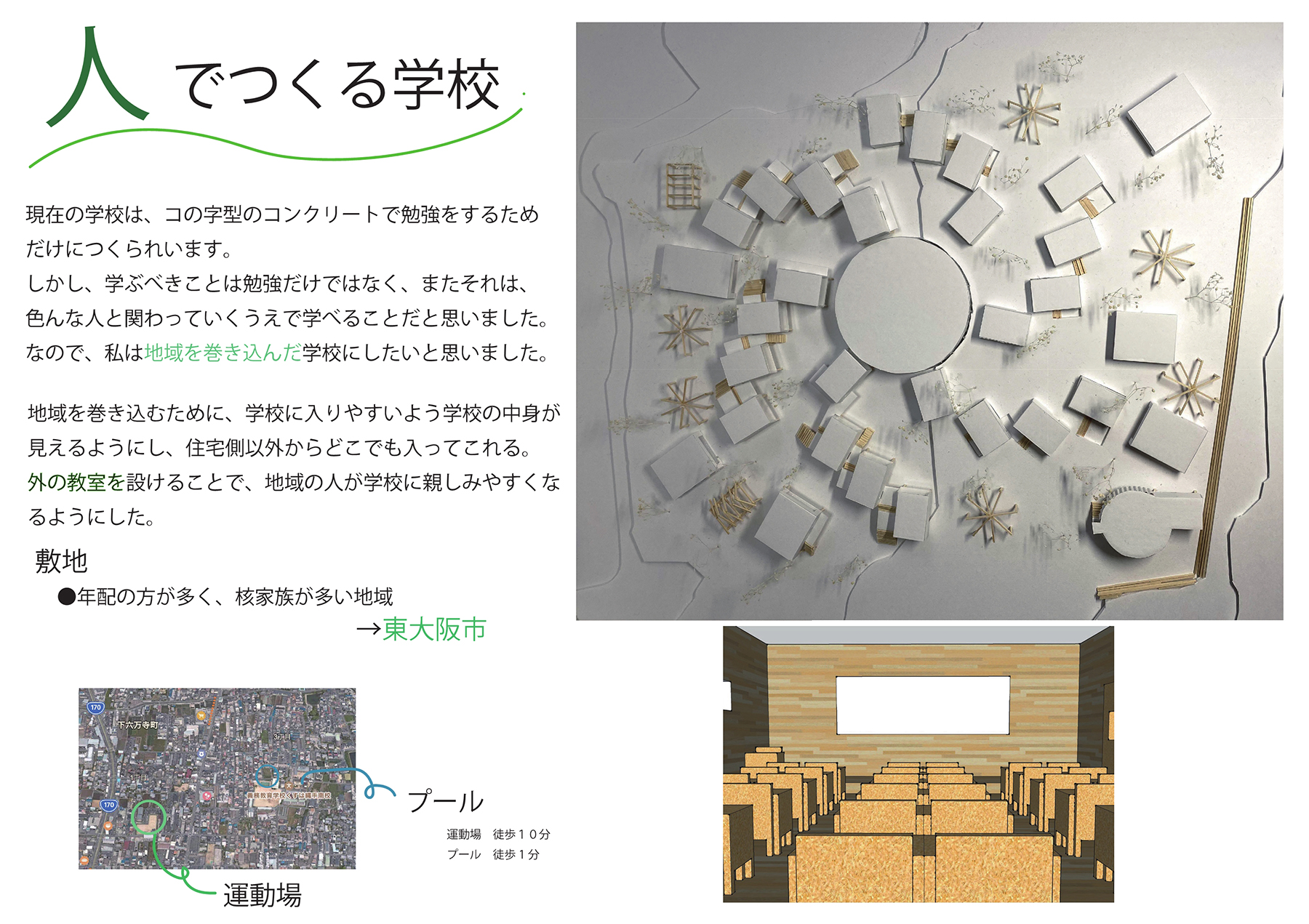 小・中学校のポテンシャルはまだまだ秘めたものを持っています。それを発掘しようと色々と案を練ってくれました。はじめは案が膨らみすぎて、卒業設計を超えた一大プロジェクトになってしまい、規模感に悩まされたと思います。それは学校を活かしたいという気持ちの大きさの表れと思います。最後は失速気味でしたが、試行錯誤を繰り返した頑張りを評価したいと思います。<吉田 秀栄>