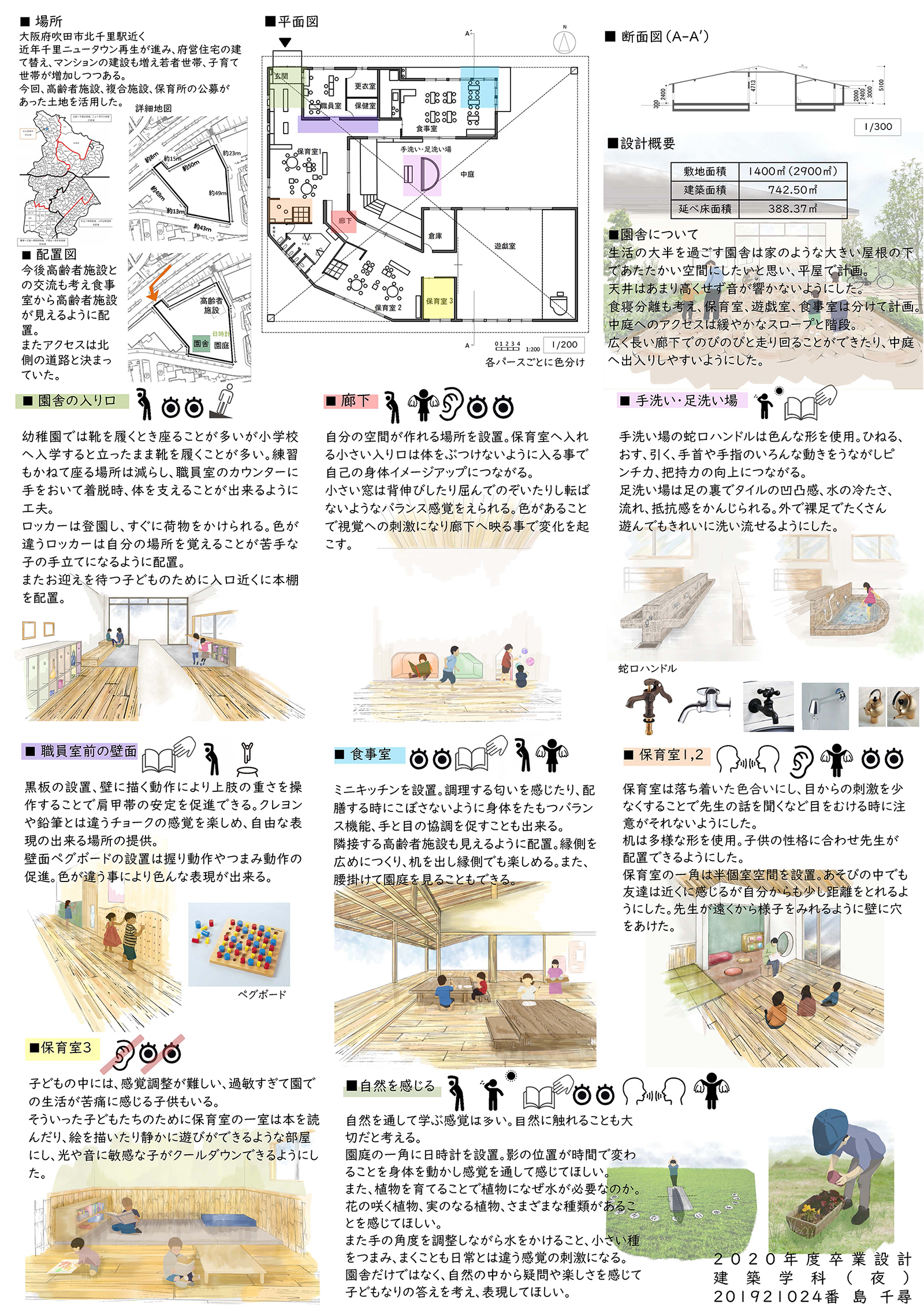一児の父として愛する我が子に向けた優しさ溢れる作品である。プランの詰めの甘さや表現の粗さはあるが、園児だけではなく保護者や職員もワクワクさせるこだわりが所々に見受けられた。学生でありながら家族を想い、形を実現させる為に努力を惜しまず考え出された計画されたこの建物は彼の人柄も表れており、さらに磨きをかければより素晴らしいものになると考える。<佐本 亜希子>