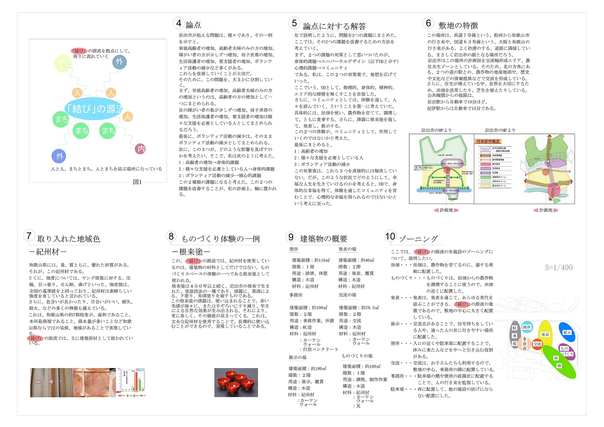 都心部に近い利便性を生かして、徐々に「限界集落」に向かう山間の集落と「街」を結び付けようと努力した作品と言える。現状を見極め、残せるものと再生するものに「仕分け」をしながら、地域ぐるみの普通性を高める提案が、次世代の暮らし方に、豊かな要素を与えてくれると期待している。身近な現状にスポットを当て、学びの最後の「卒業設計」として奮闘した点を評価したい。<青砥 聖逸>