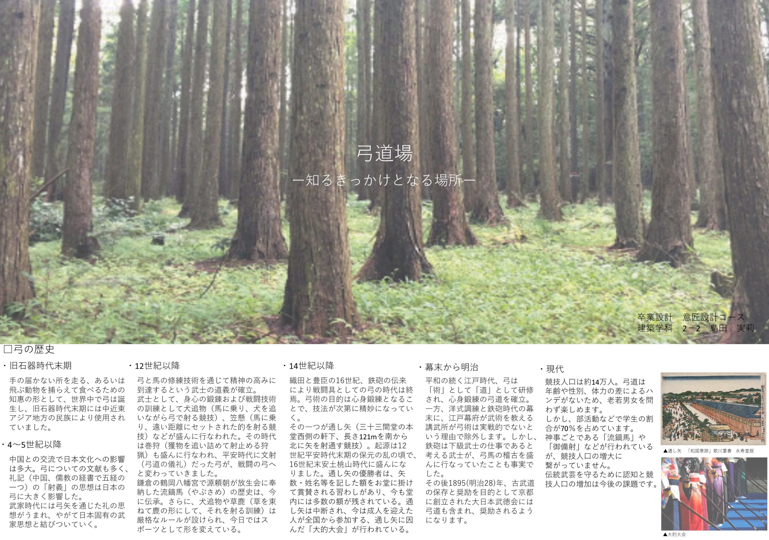 私は高校生の時に部活動で弓道をしていました。そこで、弓道場を計画しました。弓道場は既にある施設であるため「いかに自分の作品にするか」というところが難しかったです。今までの一般的な弓道場の良い所を残しながら、弓道の良さを最大限に引き出す工夫をしました。この作品で弓道の魅力を感じ、日本の伝統文化を衰退させないための競技人口の増加の一助となればと思っています。