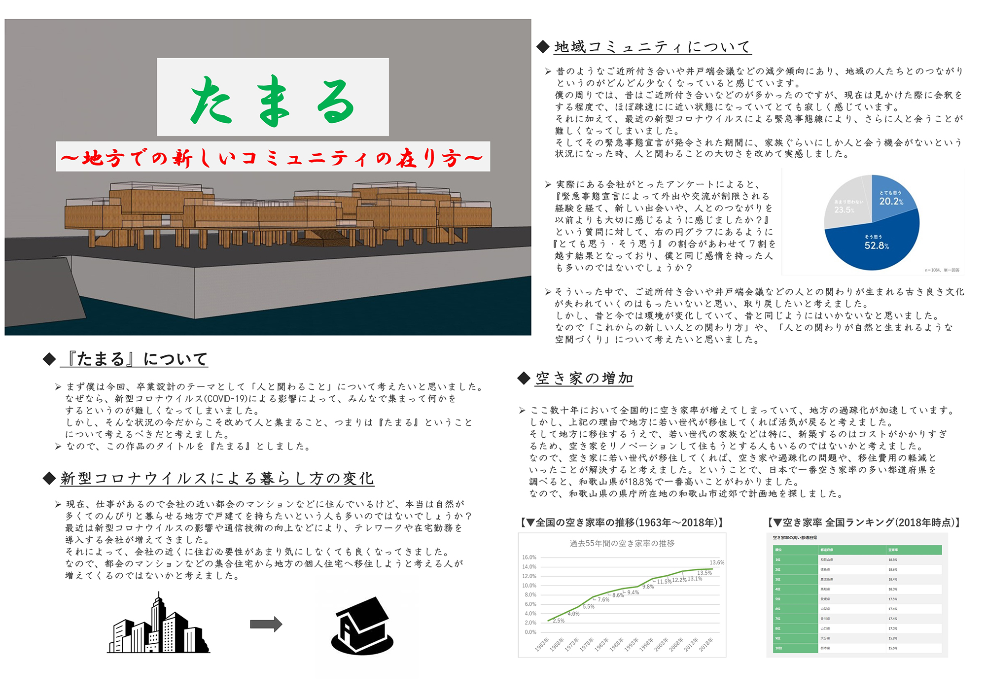 僕はこの卒業設計で『諦めない』という姿勢の大切さをとても感じさせられました。なぜなら、コロナウイルスの影響で世の中が混乱しているなかで先生方のお力添えもあり、結果的に考えてみると卒業設計に対して一生懸命取り組む事が出来たと思いました。諦めずに続けていればできないと思っていたことも可能になるのだなと体感しました。作品としては満足できていない部分もありますがこれからも諦めずに頑張りたいと思います。