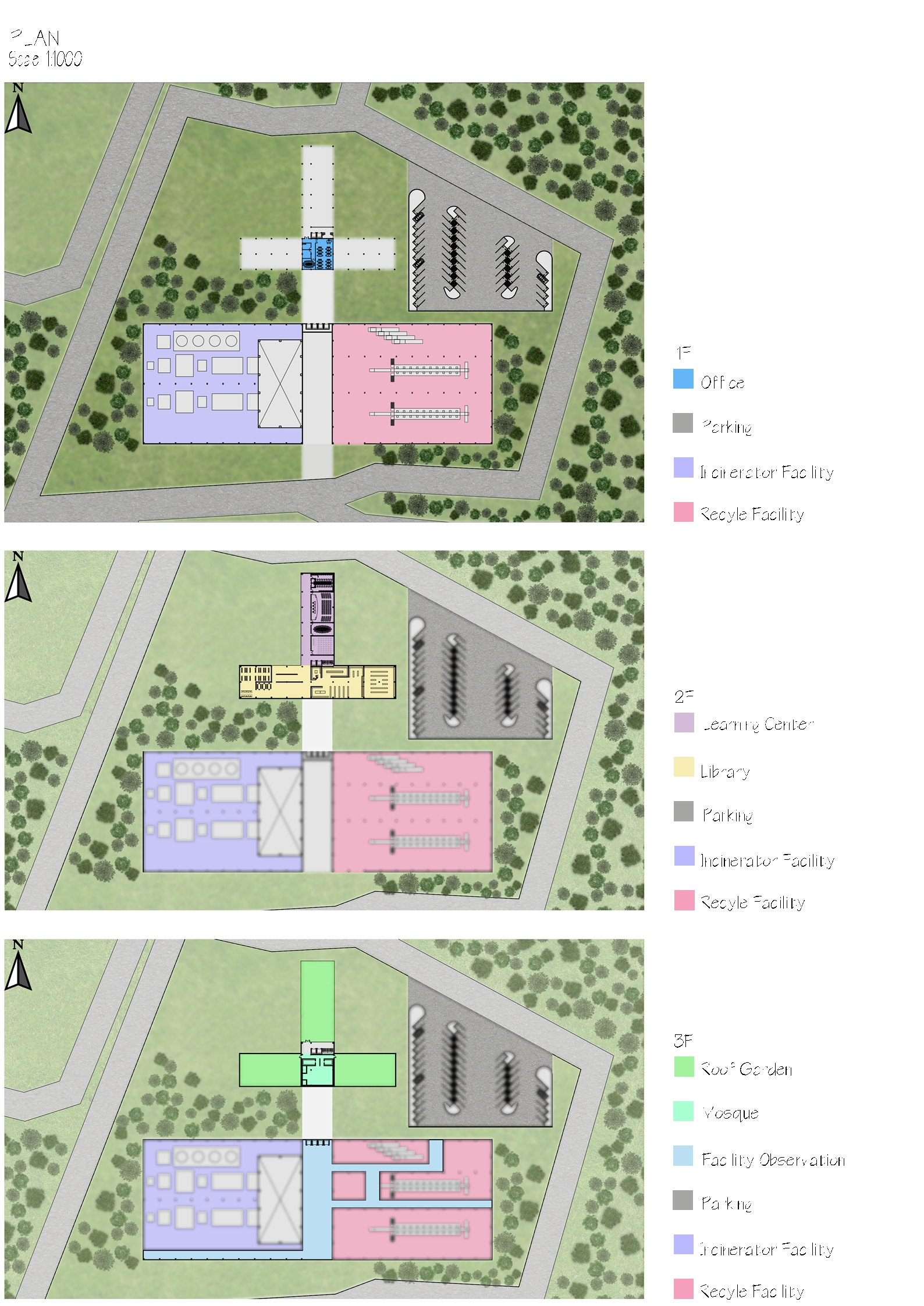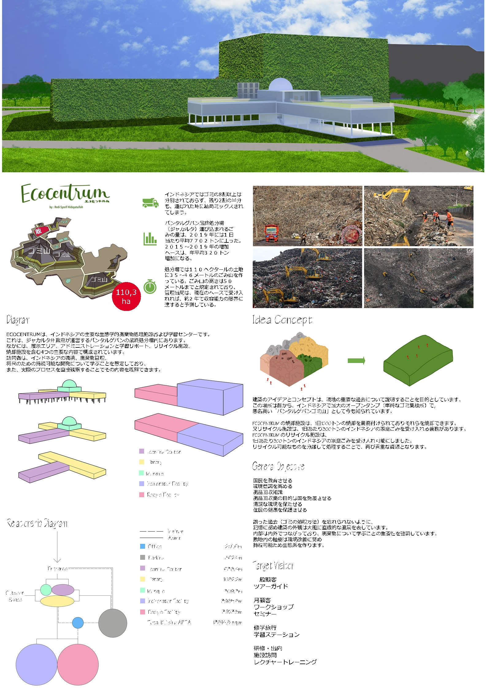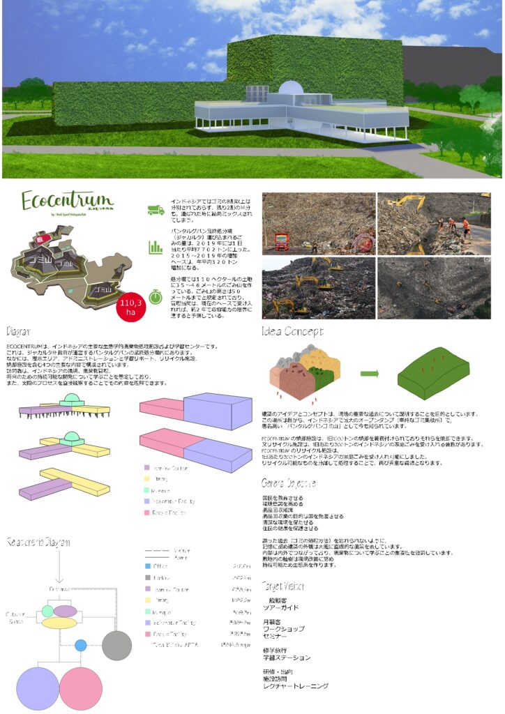 インドネシアのゴミ問題は、世界的には今やプラスチックゴミが地球環境の大きな問題とされていると中で、初期段階でさえも改善されない現状に注視している。卒業設計の題材を何にするか?苦労する学生が多い中、初回のプレゼンテーションからインパクトのある提案であった。規模的に大きい設定で、やり切れてないところもあるが、ごみ問題の意識付けを願う作者の意図が、インドネシア国民に伝わることを願っている。<青砥 聖逸>