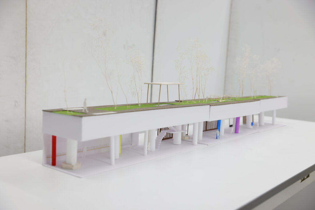 グリッドごとに空間の取り付け取り外しをできるようにした。この3つの要素を取り入れ駅前空間、駅共に通勤通学には安らぎをショッピングには楽しみを生み出そうと考えました。