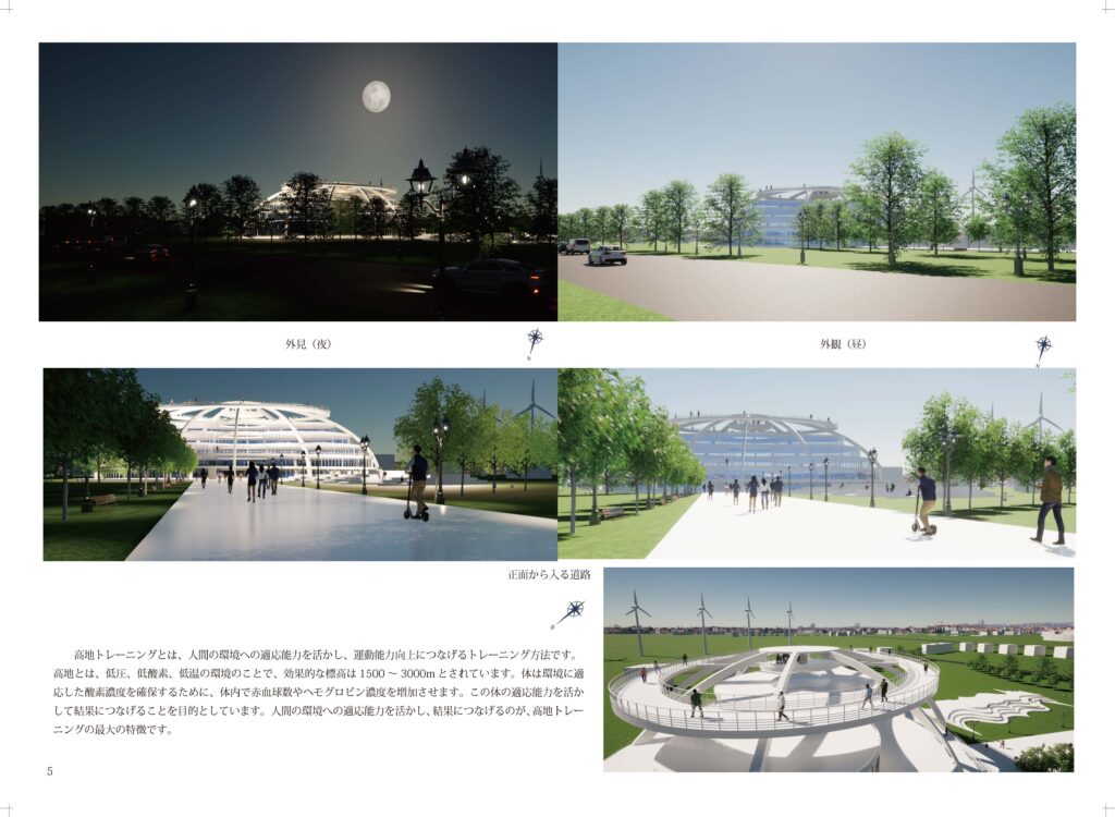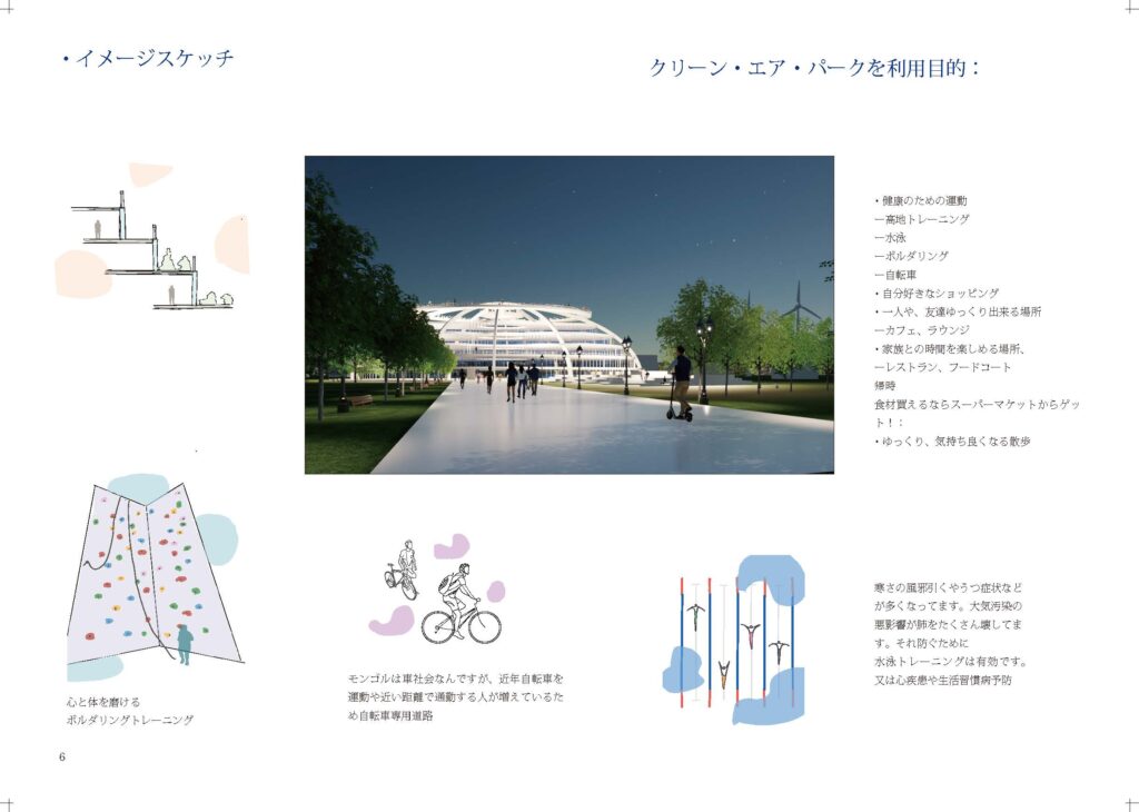 私の作品のコンセプトは、綺麗な自然を大切に守れば健康に過ごすことが出来ると考えて、自然と人間を建築で繋げられるように表現しました。人間が自然を綺麗に保っていくためには強い意識を持ち、自分の生活習慣を少しずつ正しく変えることから始まります。運動することは健康的な暮らしを送るということへの効果が高く、クリーンエアの快適な空間で楽し時間を過ごすことで、その大切さがわかる空間の提案をしました。