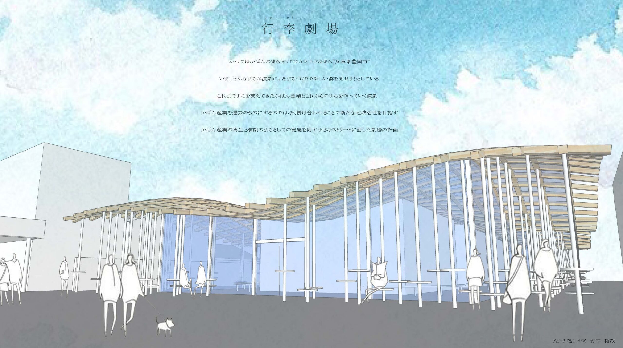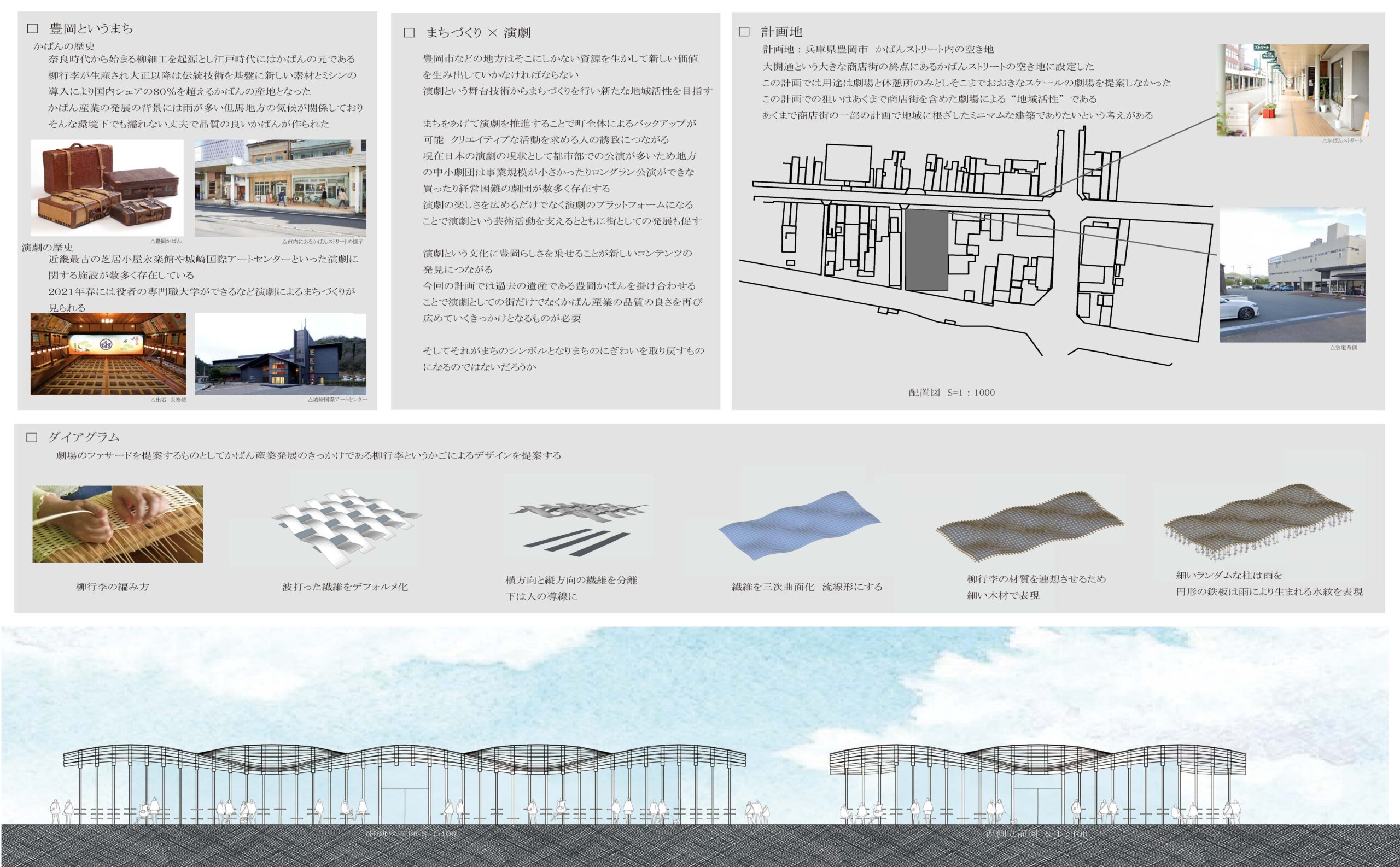 兵庫県の北部にある豊岡市、ここはかつて日本で1番かばんを生産していた町だった。しかし時代の流れに伴い、その認知度と生産量は低下してきている。そんな町が現在、演劇によるまちづくりを推進している。この計画は、そんな豊岡市のかばん産業の復活と演劇の町としての認知の向上のため、カバンストリートと言われる通りに面した小さな劇場の提案である。