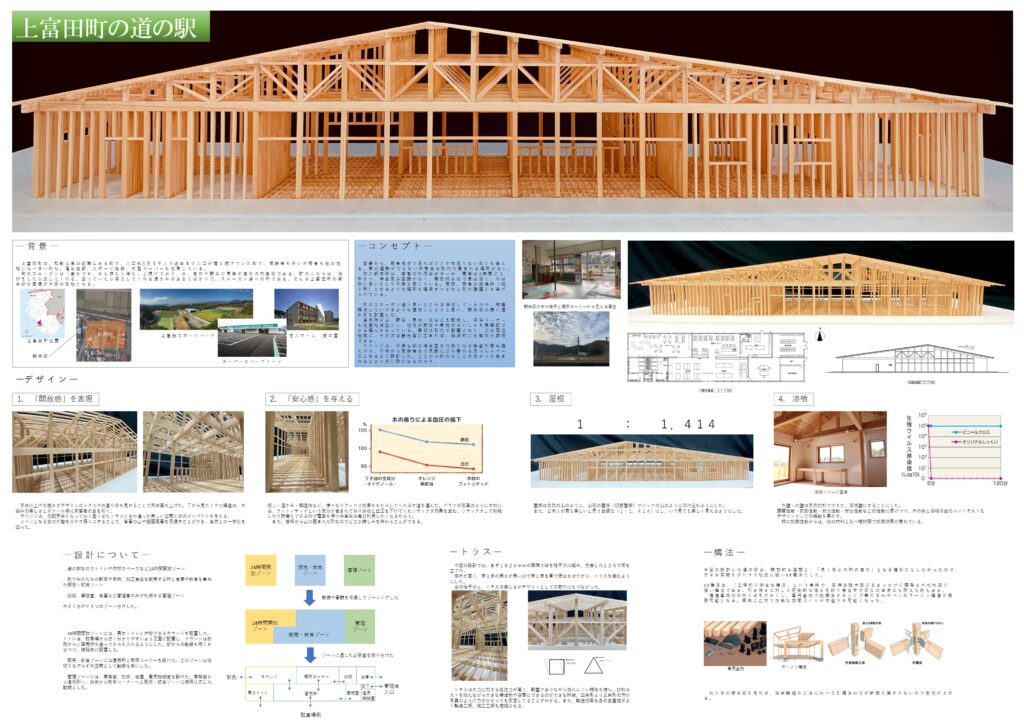 上富田町は高校生活の思い出が詰まった場所で、よく利用して不便を感じていた朝来駅に着目し、快適に待ち時間を過ごせる空間に加えて特産物を活かした施設も併設して道の駅を作りました。トラスを見せたり登り梁を見せたりと構造やデザインには、特にこだわりました。長い時間卒業設計に取り組んできましたが、楽しみながら取り組めたと思います。特に模型を作ってる時で、綺麗にパーツを取り付けて形になっていくのがおもしろくて結果、納得のいく仕上がりになりました。最後に、卒業設計で学んだ知識と経験、担当してくださった先生と手伝ってくれた人への感謝の気持ちを忘れずこれからも建築を学んでいきたいと思います。