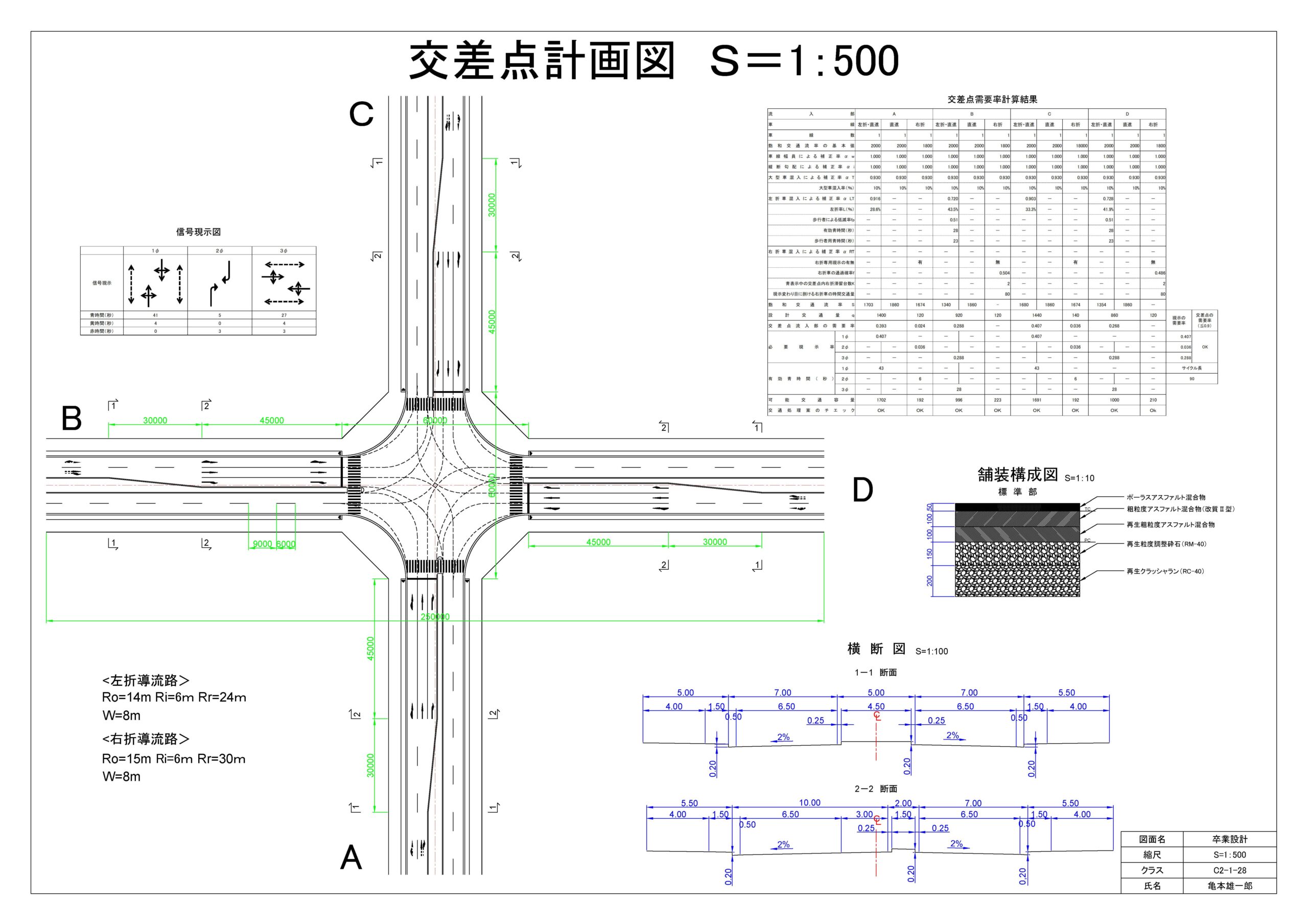 この作品は、ある交通流を想定し、その交通流を捌くことができるような交差点を設計するという、土木のソフト面である「交通工学」をメインとしたものである。信号現示をトライアル計算により調整し、需要率を下げて交通流を捌くことができる交差点が設計されている。一方で、ハード面についても、道路幾何構造は道路構造令に準拠されており、苦労した導流路も正確に描かれている。ハード面とソフト面の両方が考慮された、現実の設計に近い作品であった。<広瀬 一樹>