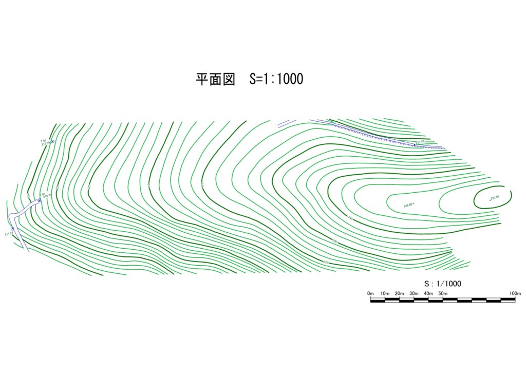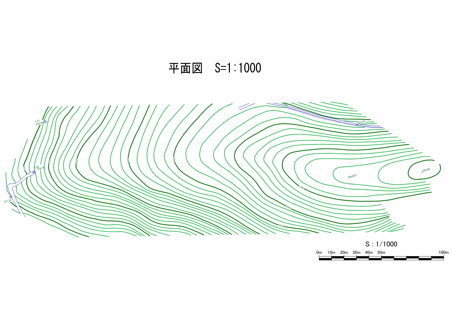 道路設計コースの道路路線設計は地形図を使い、山頂に向かって片側幅員5m、全幅10mの道路を300m計画するというものでした。